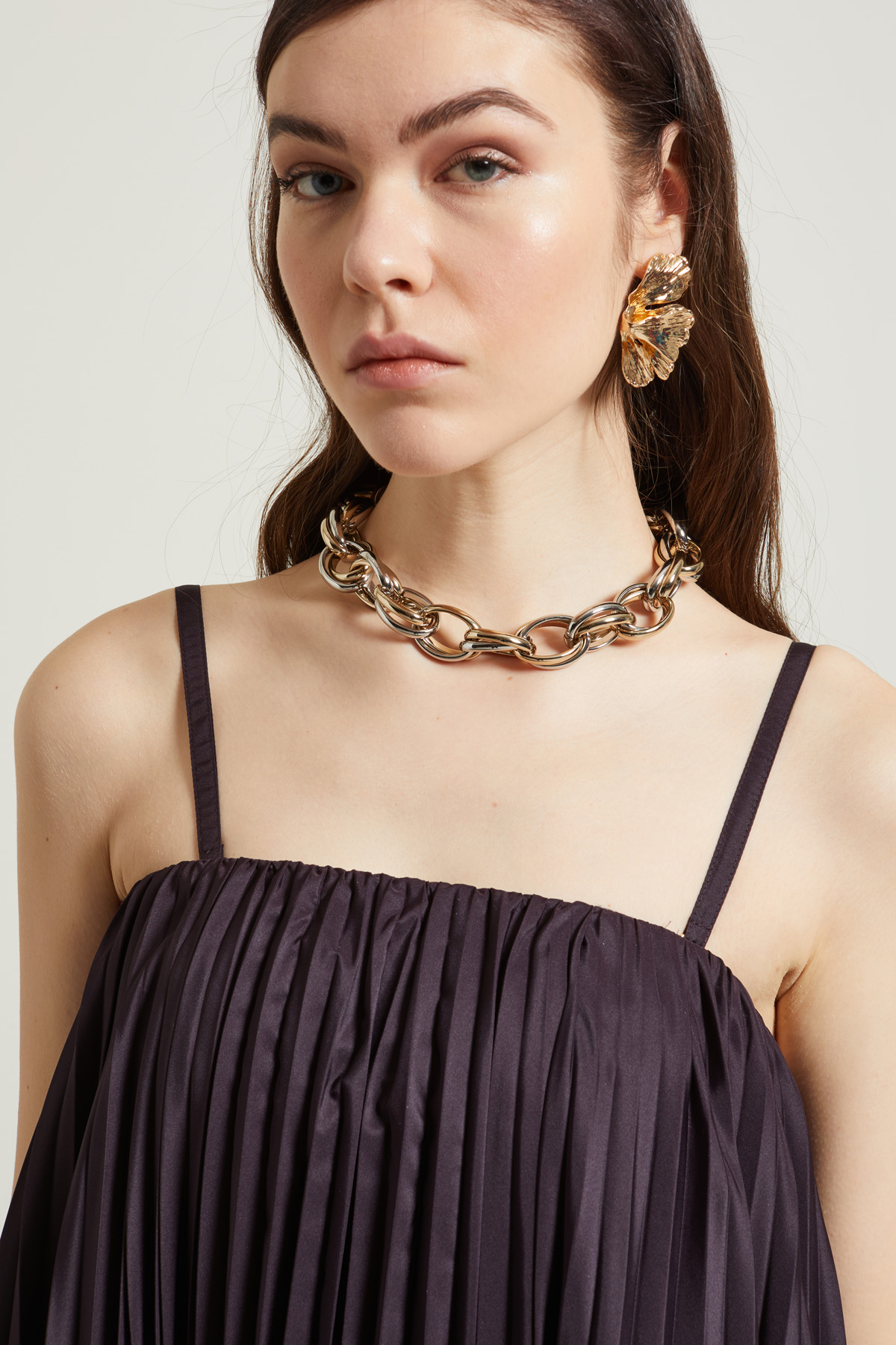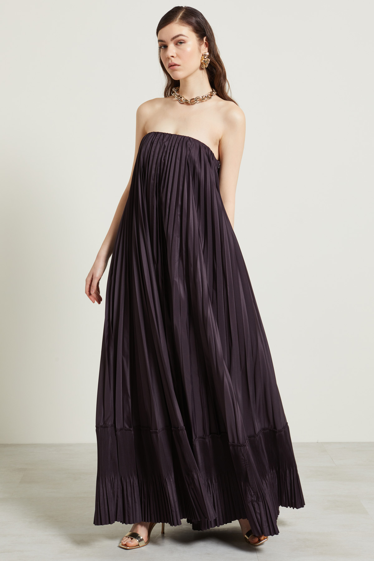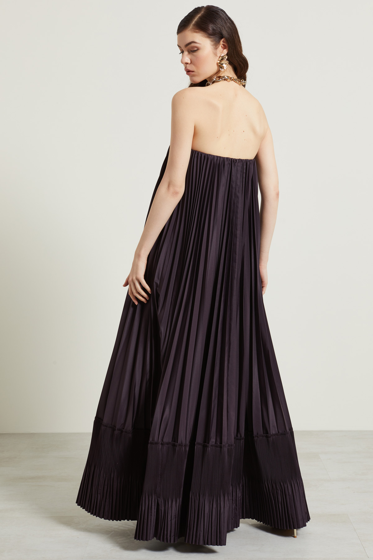 Abito smanicato lungo dalla linea svasata realizzato in taffettà con lavorazione plissè, scollo ampio con bustino interno e spalline removibili, dettaglio di balza a fondo capo. Allacciatura tramite zip invisibile e gancio sul fianco. Foderato.