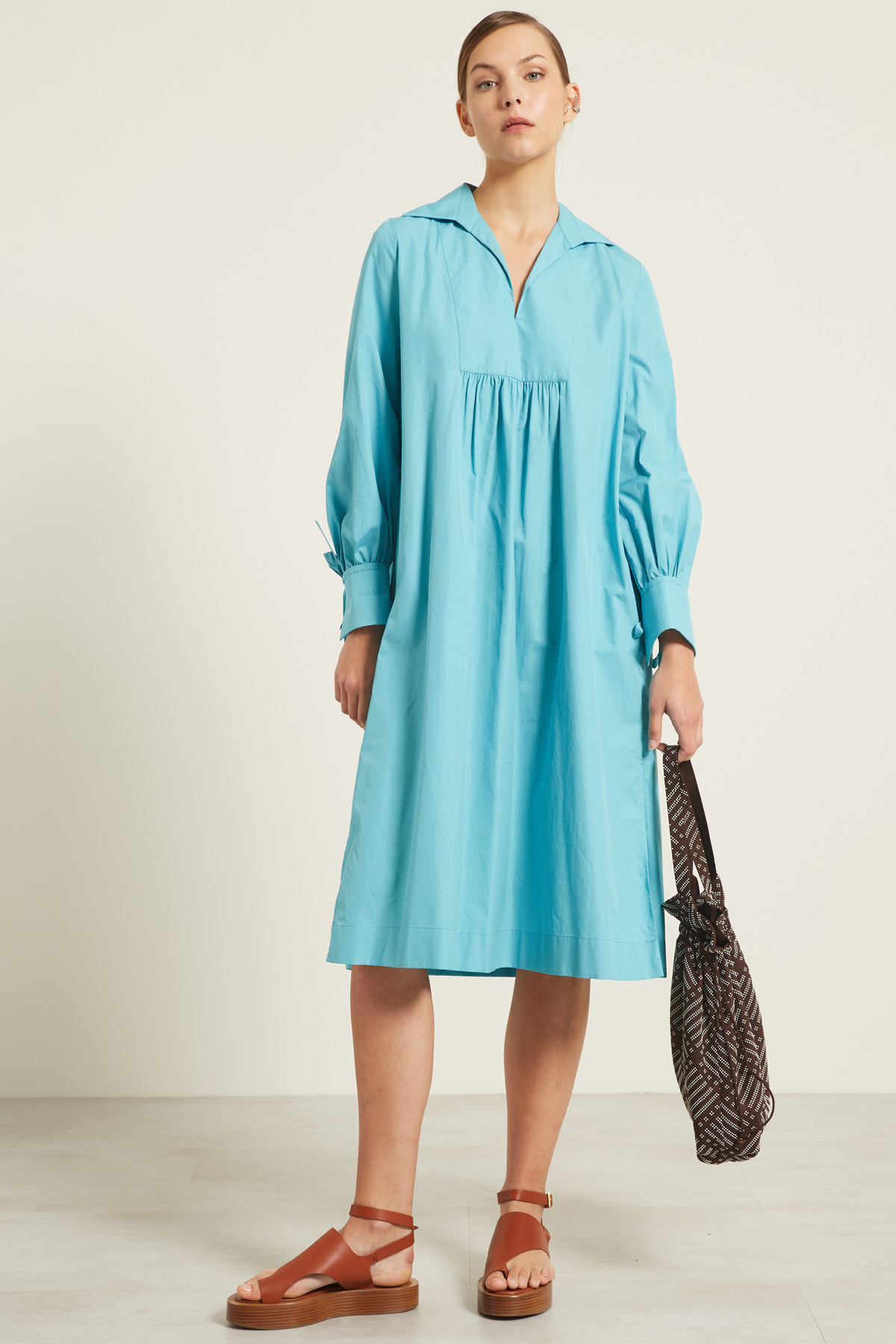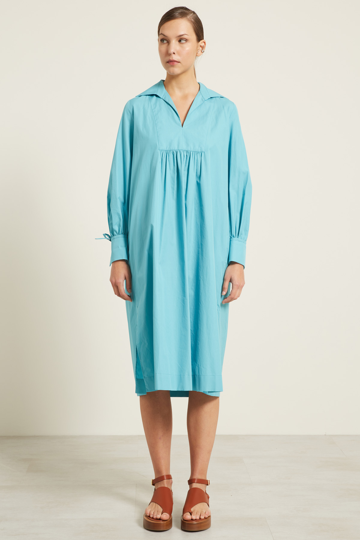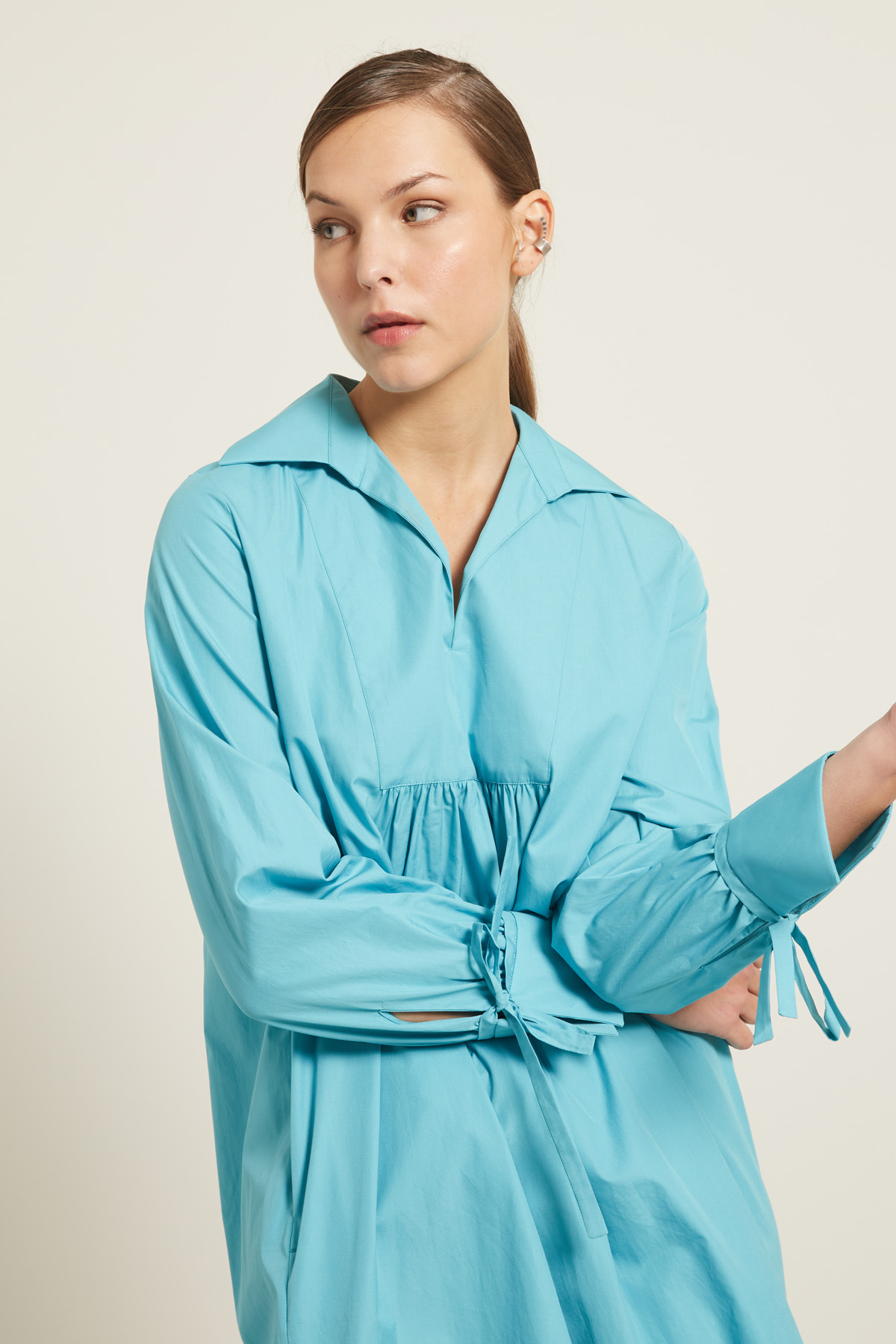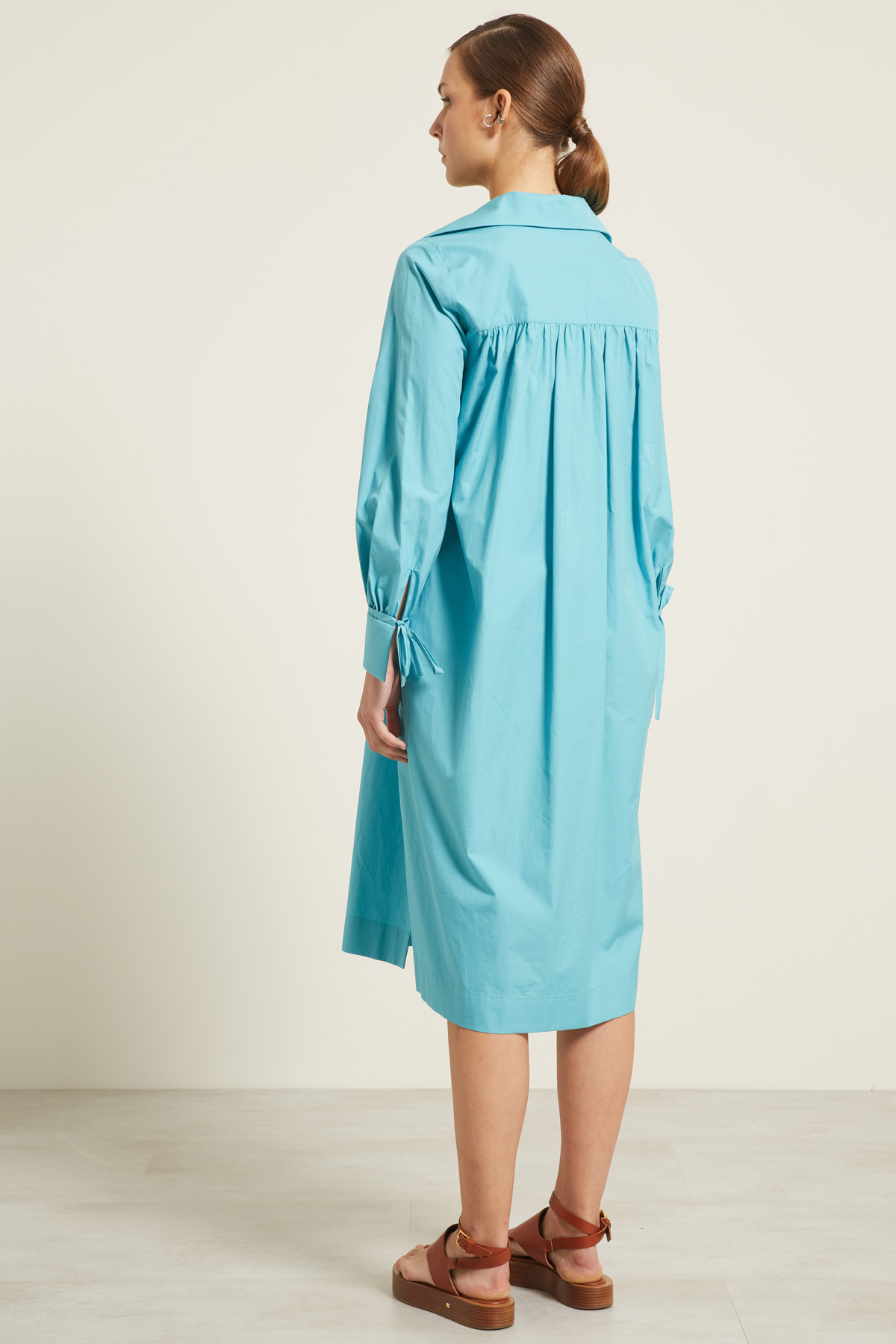 Abito a tunica realizzato in popeline di puro cotone, con colletto stile polo, arricciatura sul davanti, maniche lunghe con polsino e laccetti al fondo, tasche laterali inserite in cucitura e spacchi a fondo capo. Carrè nel retro.