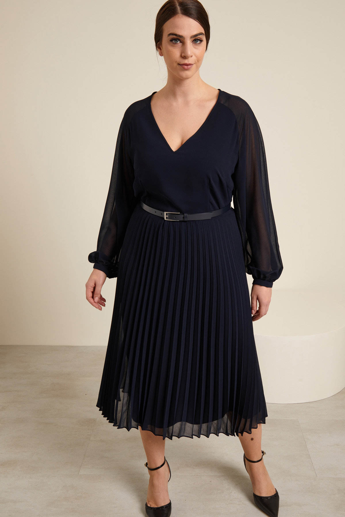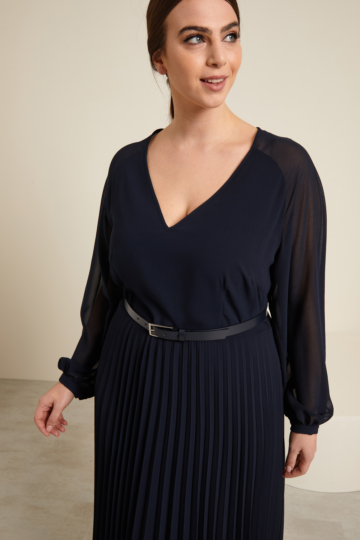 Abito midi dalla linea fluida realizzato in georgette con lavorazione plissè sulla gonna, scollo a V, maniche lunghe raglan con polsino e bottone al fondo, taglio in vita. Foderato.