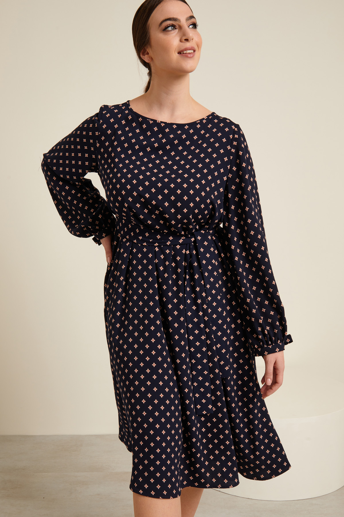 Abito dalla linea morbida realizzato in cady stampato, con scollo a barchetta e apertura a goccia nel retro con bottone, maniche lunghe con polsino e laccetti al fondo da annodare. Abito dotato di cintura coordinata. Sfoderato.