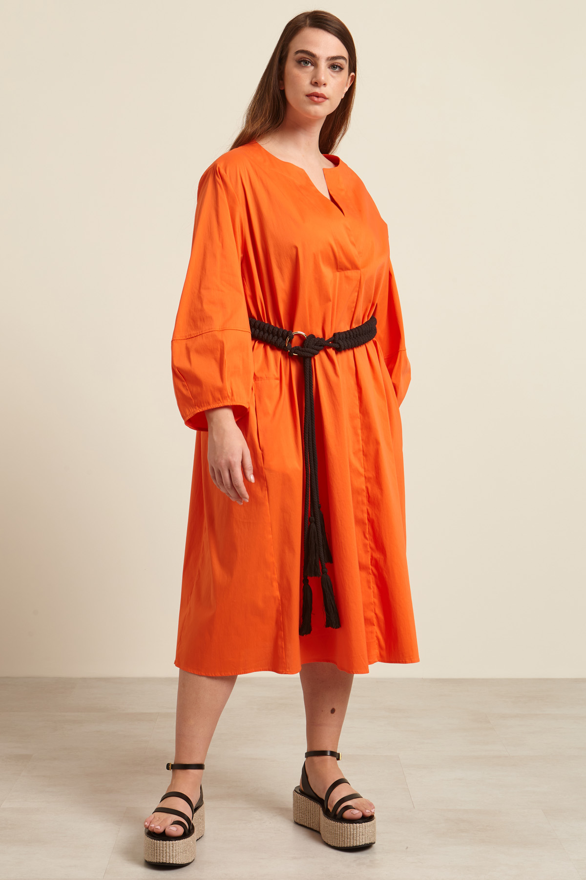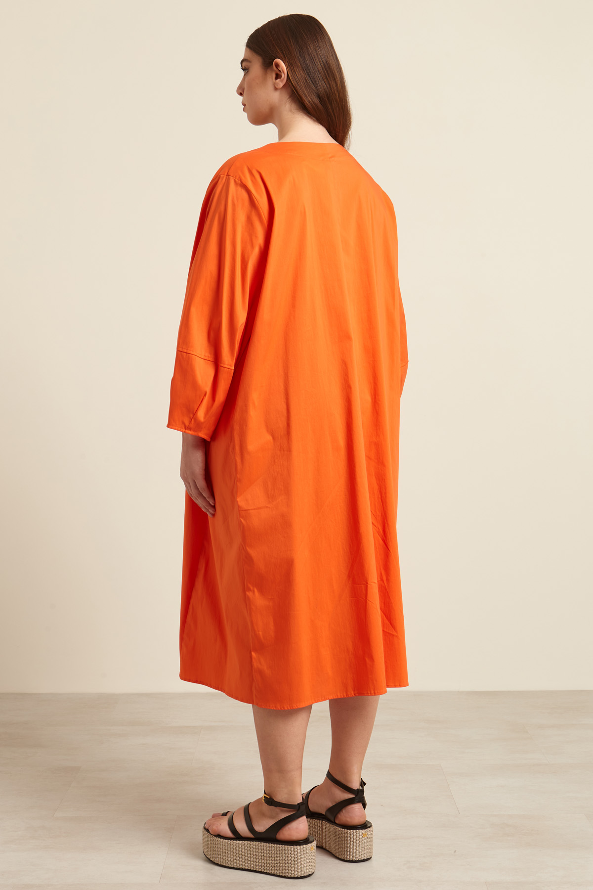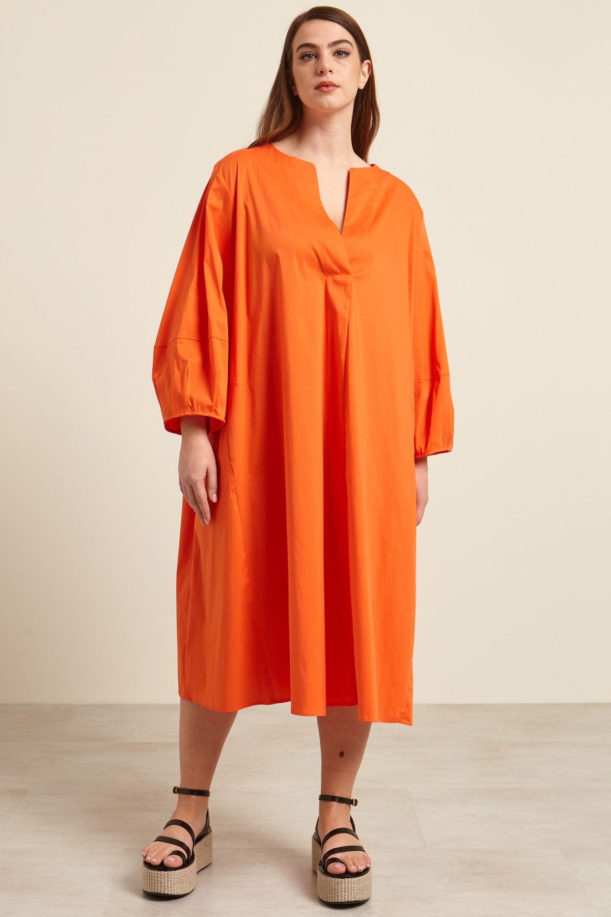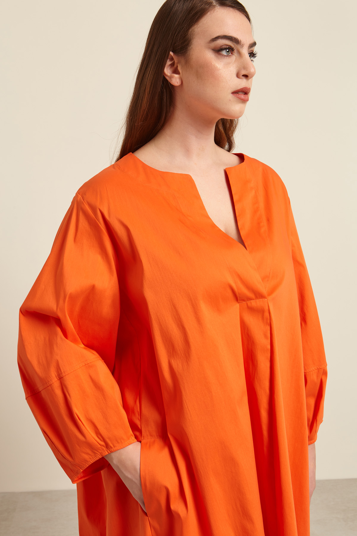 Abito a tunica dalla linea svasata in cotone stretch con scollo a V, maniche a tre quarti che terminano a sbuffo, tasche in cucitura sui fianchi.