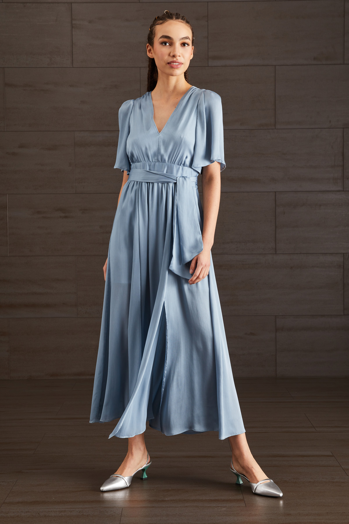 Abito lungo realizzato in creponne con scollo a V, maniche corte ad aletta e spacco sul lato. Chiusura tramite cerniera invisibile e cintura coordinata removibile.