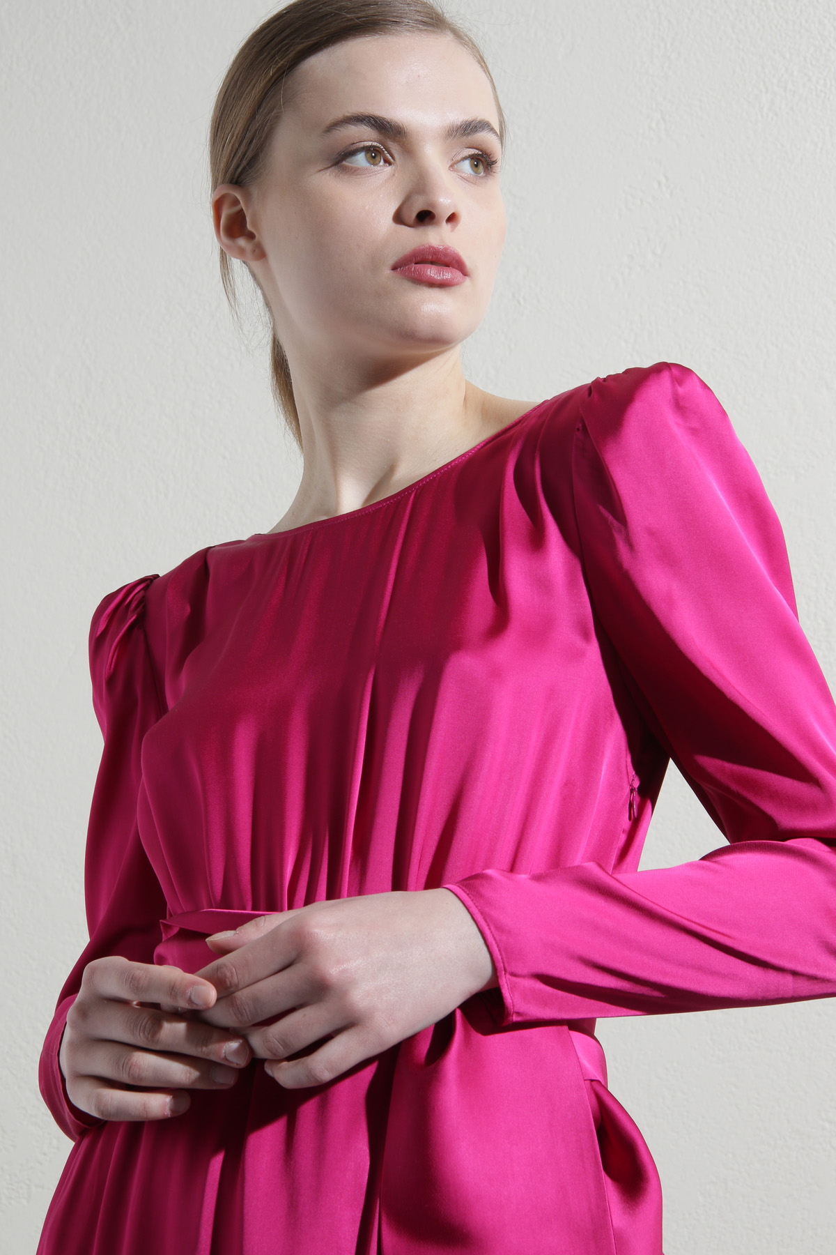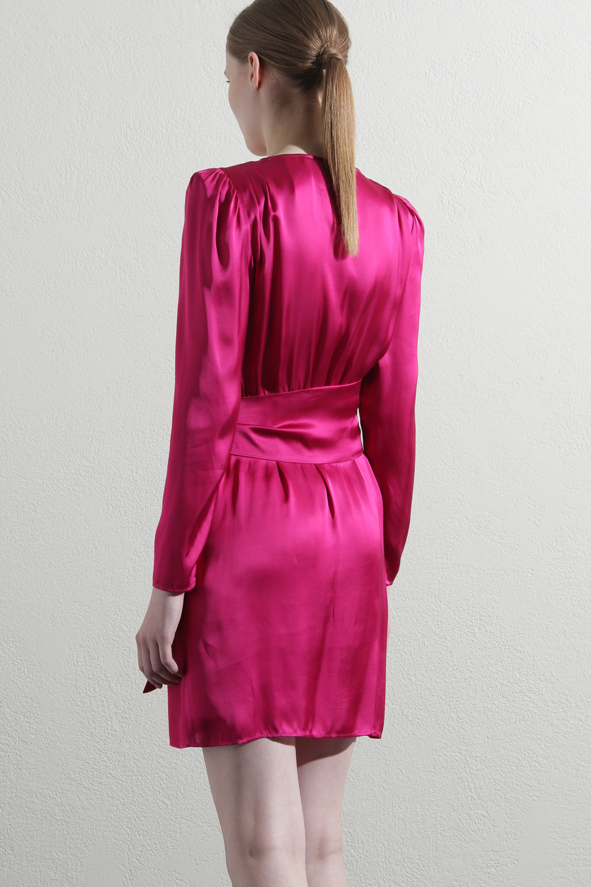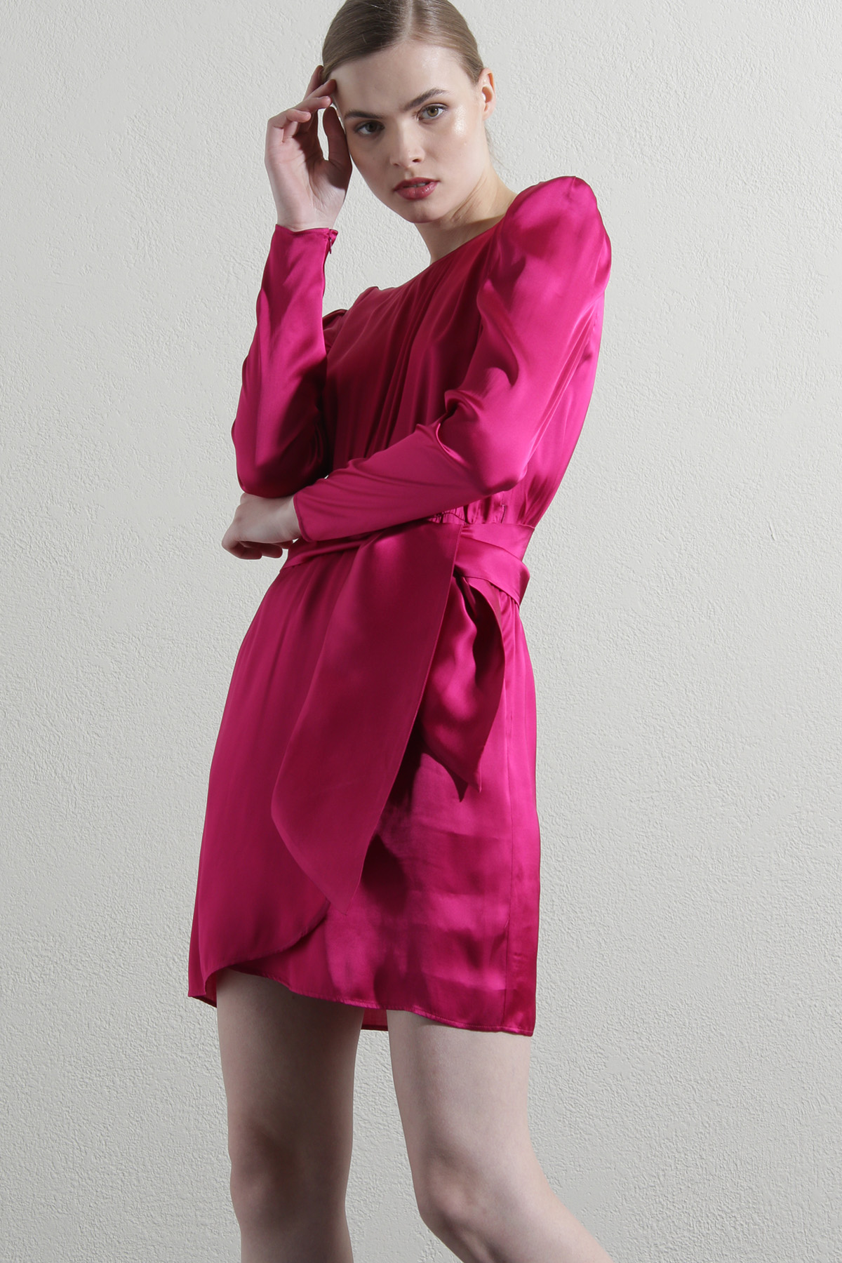 Abito corto realizzato in raso di pura viscosa, con scollo a giro, maniche lunghe con spalline rimovibili e zip al fondo, taglio in vita con nastri da annodare e gonna a finto portafoglio. Allacciatura a goccia tramite bottone e zip invisibile sul fianco.