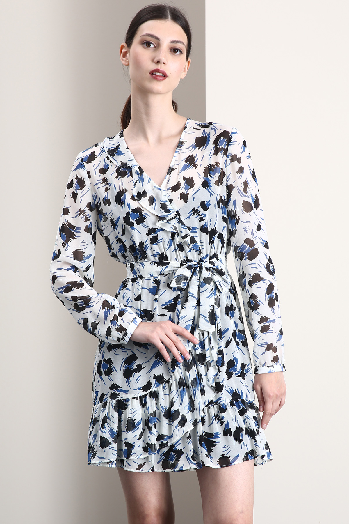 Abito a finto portafoglio realizzato in georgette stampata, con scollo a V, maniche lunghe con polsino e bottone, motivo di ruches sul davanti e taglio con arricciatura in vita. Fusciacca coordinata e sottoveste in abbinamento.