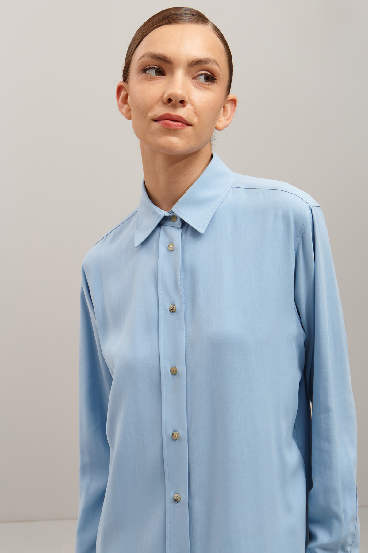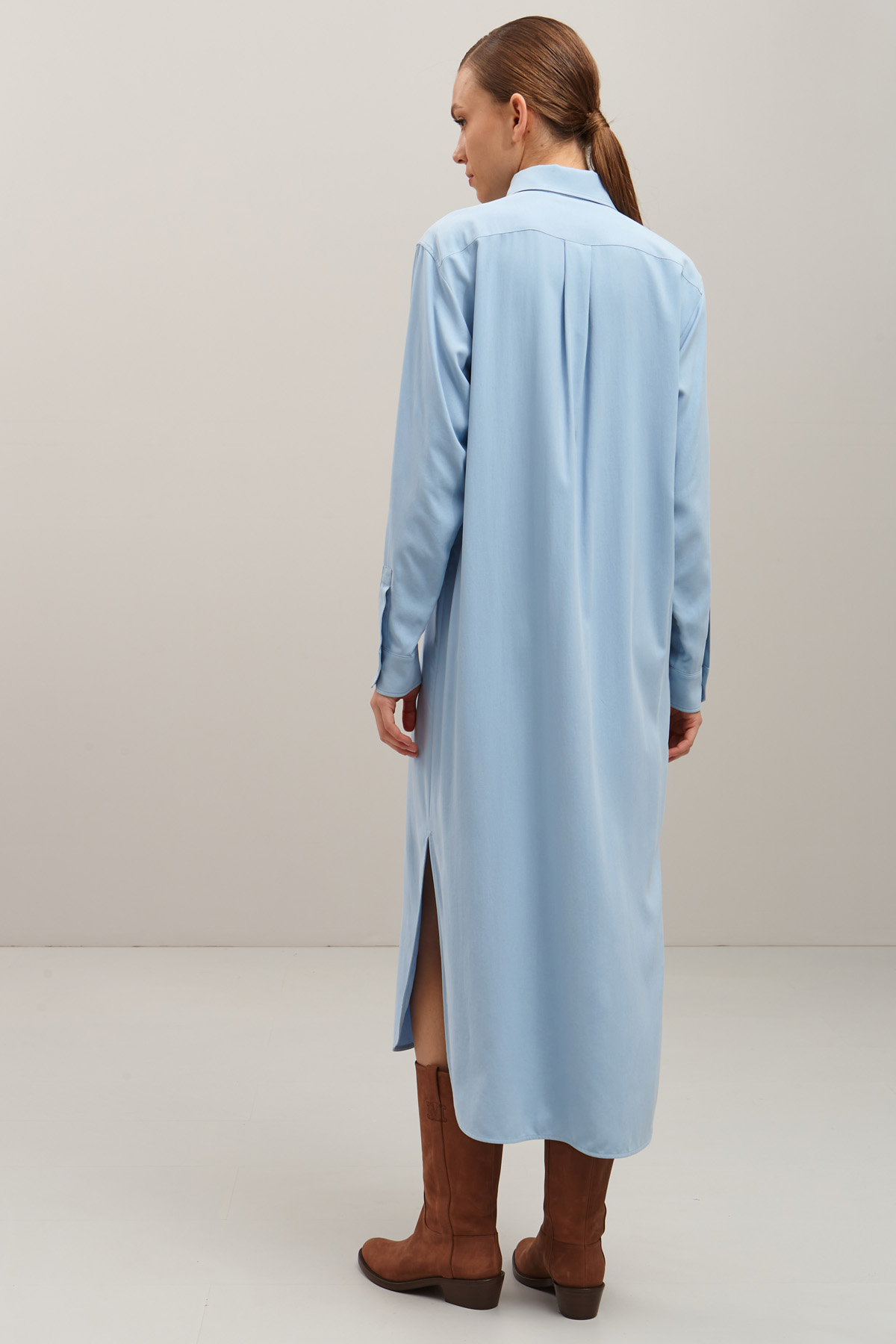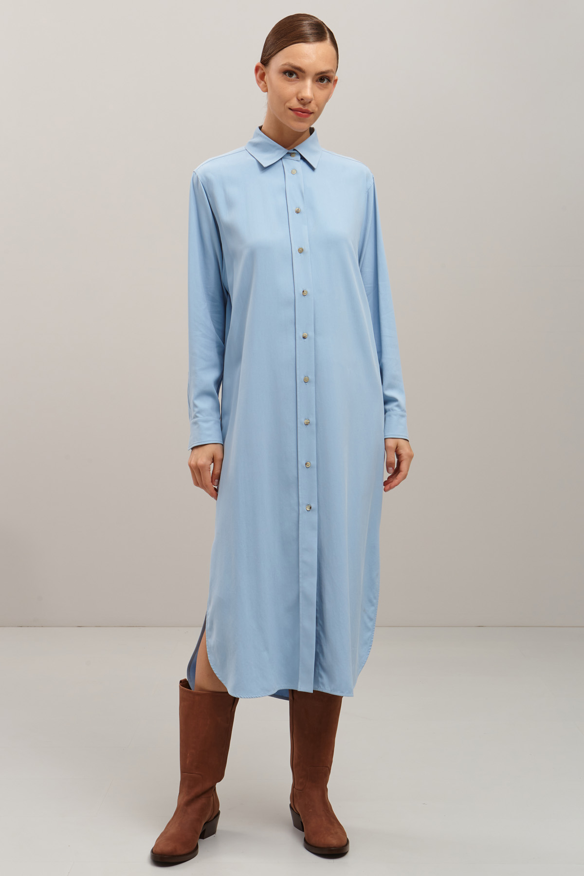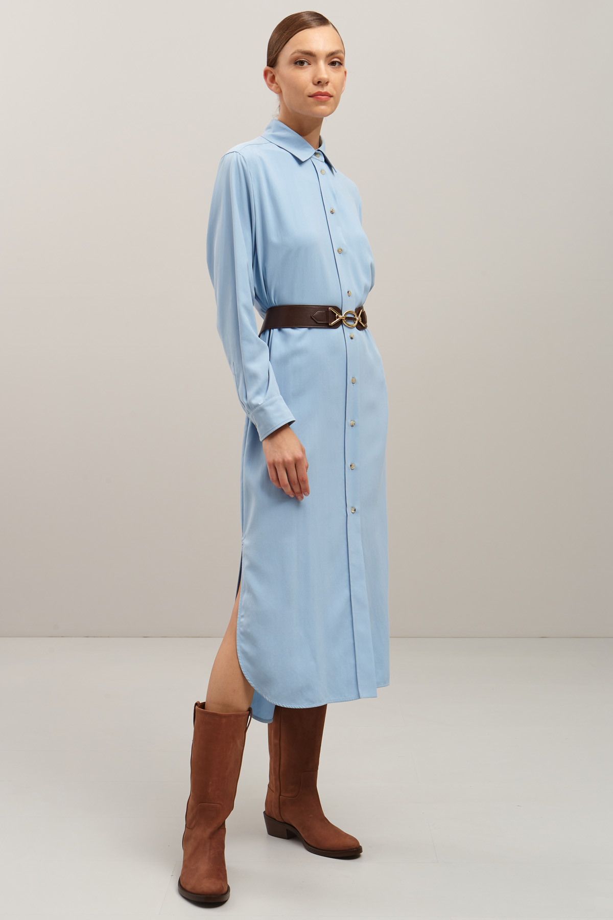 Chemisier dalla linea dritta realizzato in seta lavata, con colletto a camicia, maniche lunghe con polsino e bottone, carrè e cannoncino nel retro, spacchi laterali al fondo. Allacciatura tramite bottoni. Capo dotato di cintura coordinata.