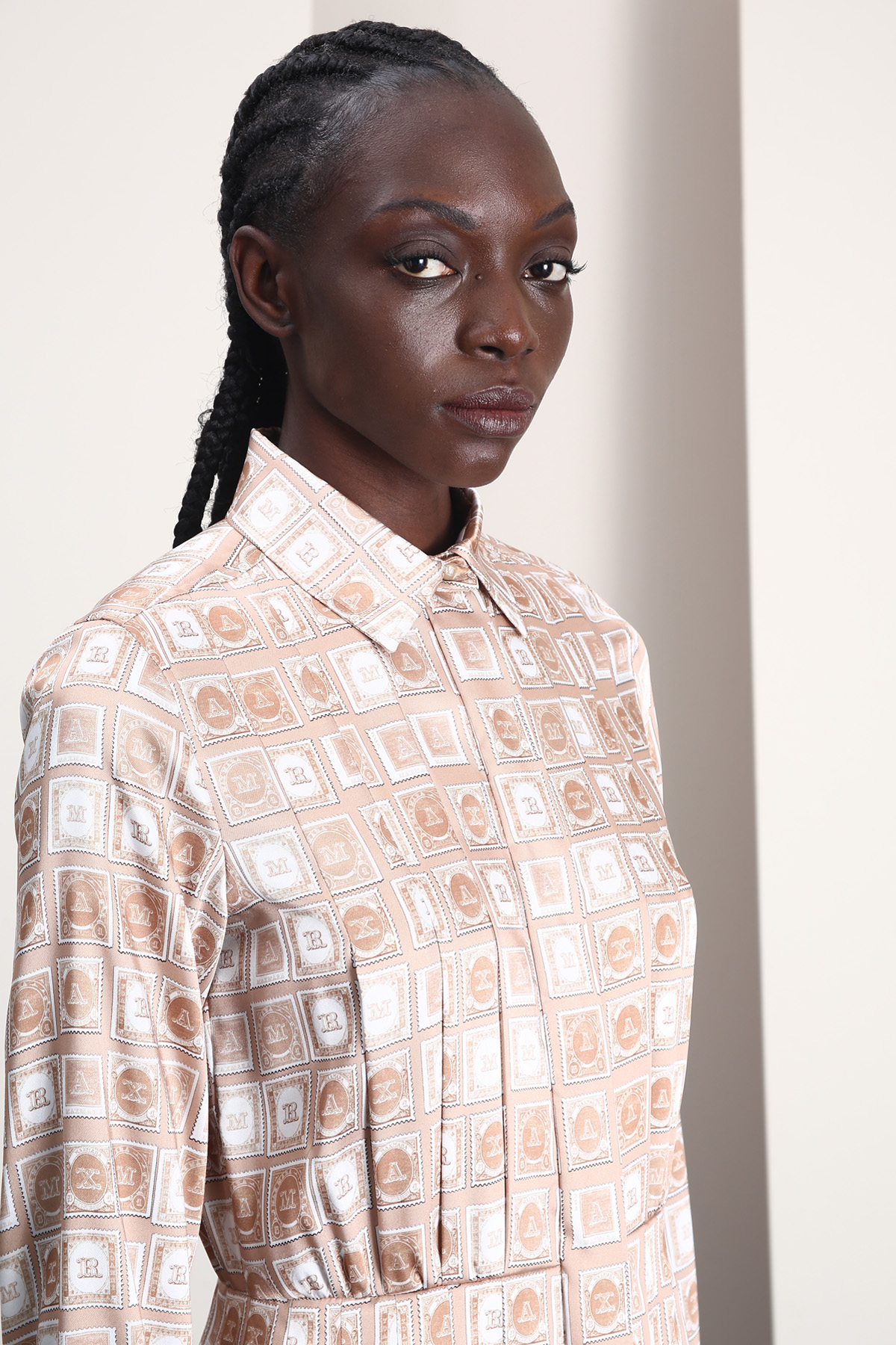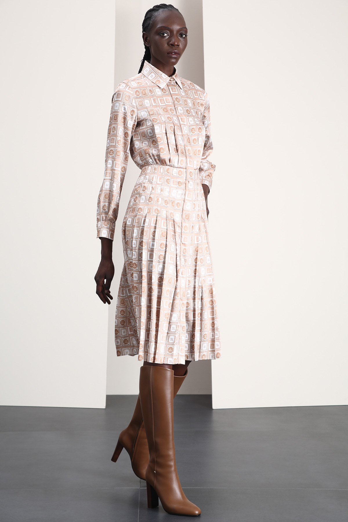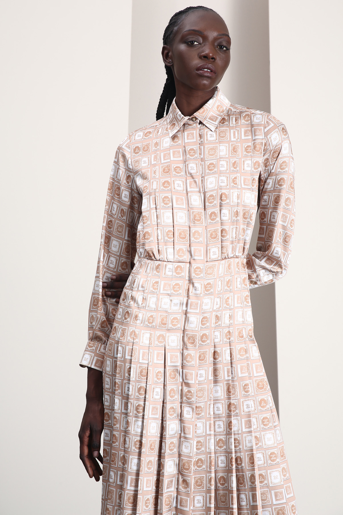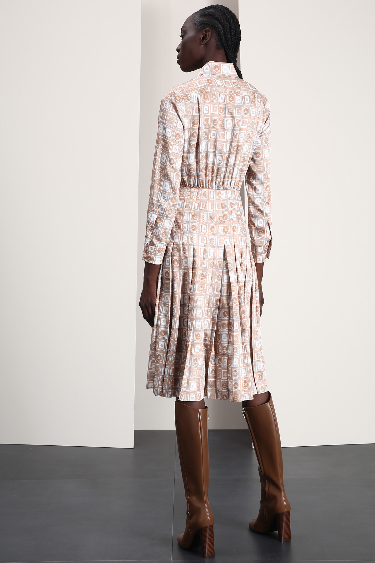 Abito chemisier realizzato in twill stampato, con collo a camicia, maniche lunghe con polsino e bottoni, motivo di pieghe cucite in vita e sulla gonna, allacciatura nascosta tramite bottoni.