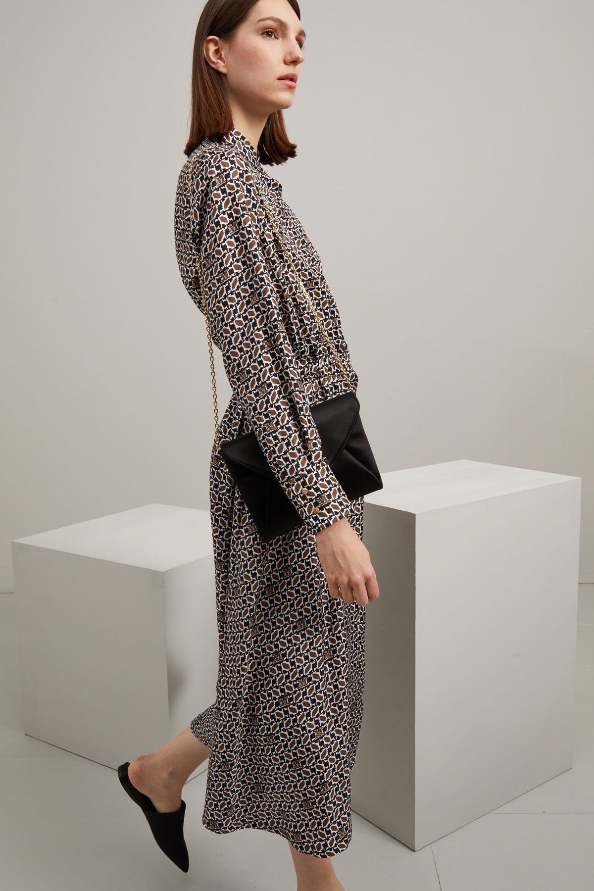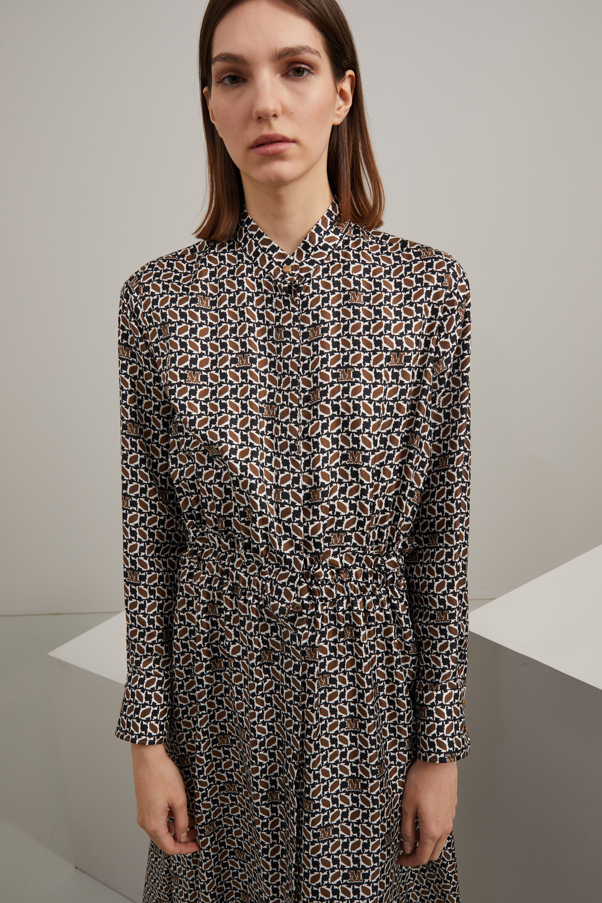 Chemisier dalla linea sfiancata realizzato in twill di pura seta stampata, con collo alla coreana, maniche lunghe con polsino e bottoni, inserto elastico in vita con dettaglio di rouches, tasche laterali inserite in cucitura e allacciatura nascosta tramite bottoni.
