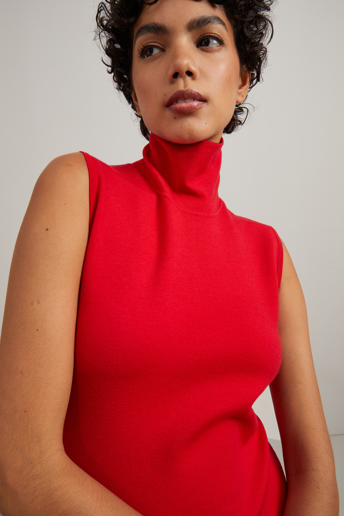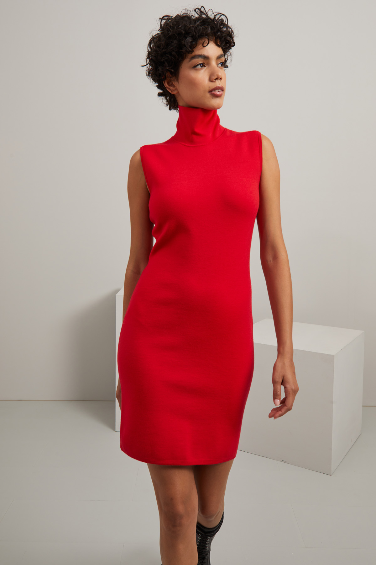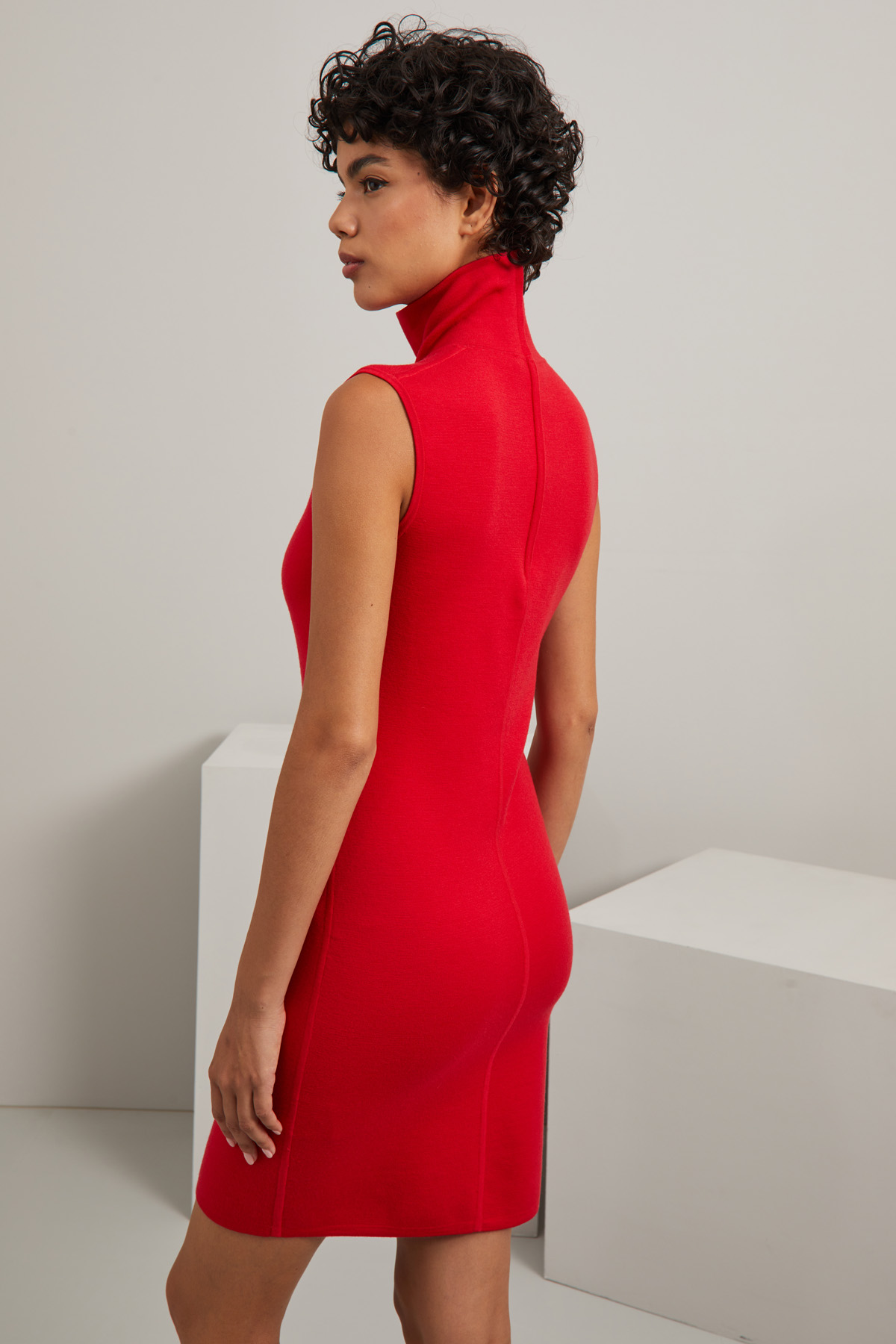 Abito smanicato dalla linea aderente realizzato in filato di di misto lana stretch con collo alto. Allacciatura nascosta tramite zip nel retro.