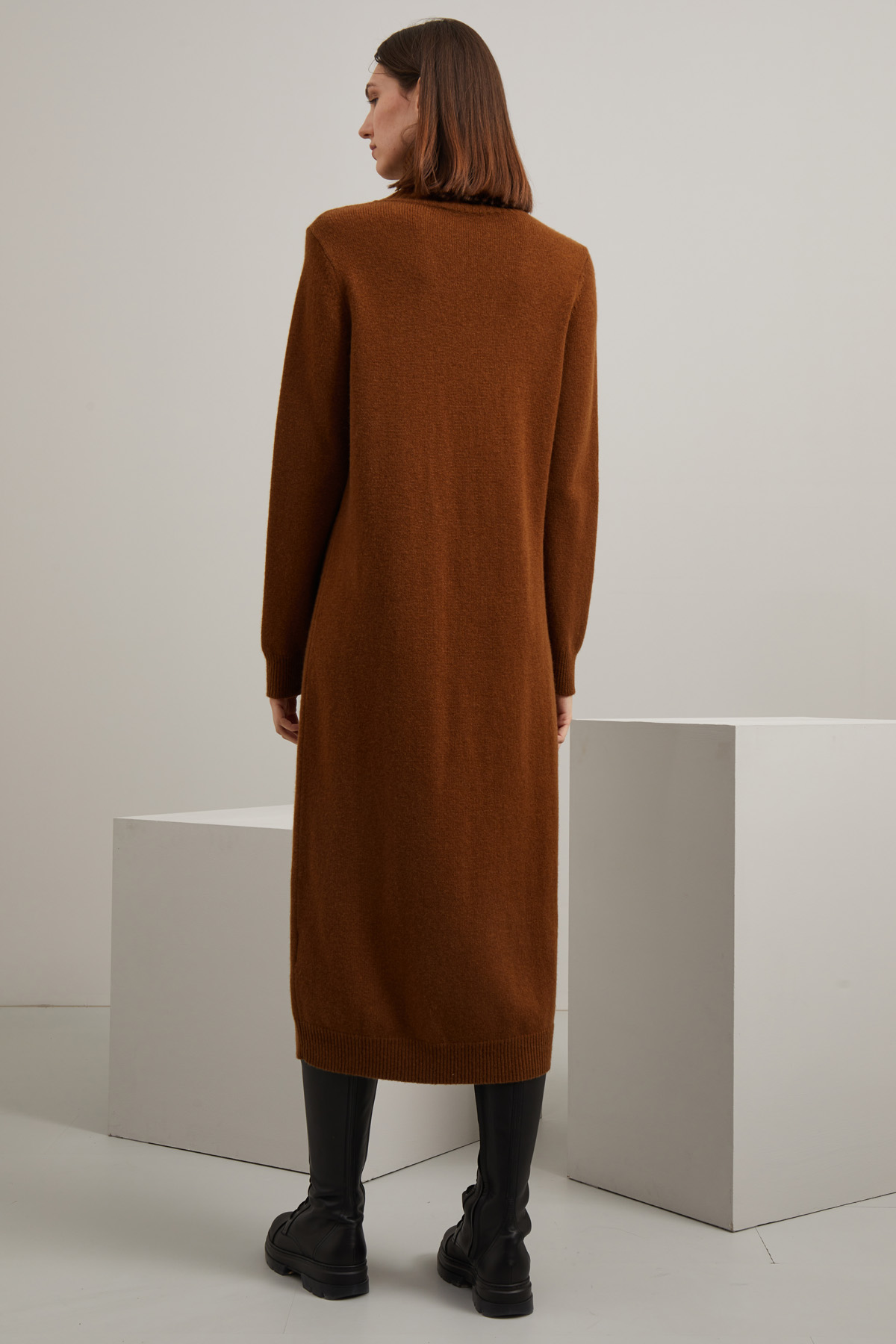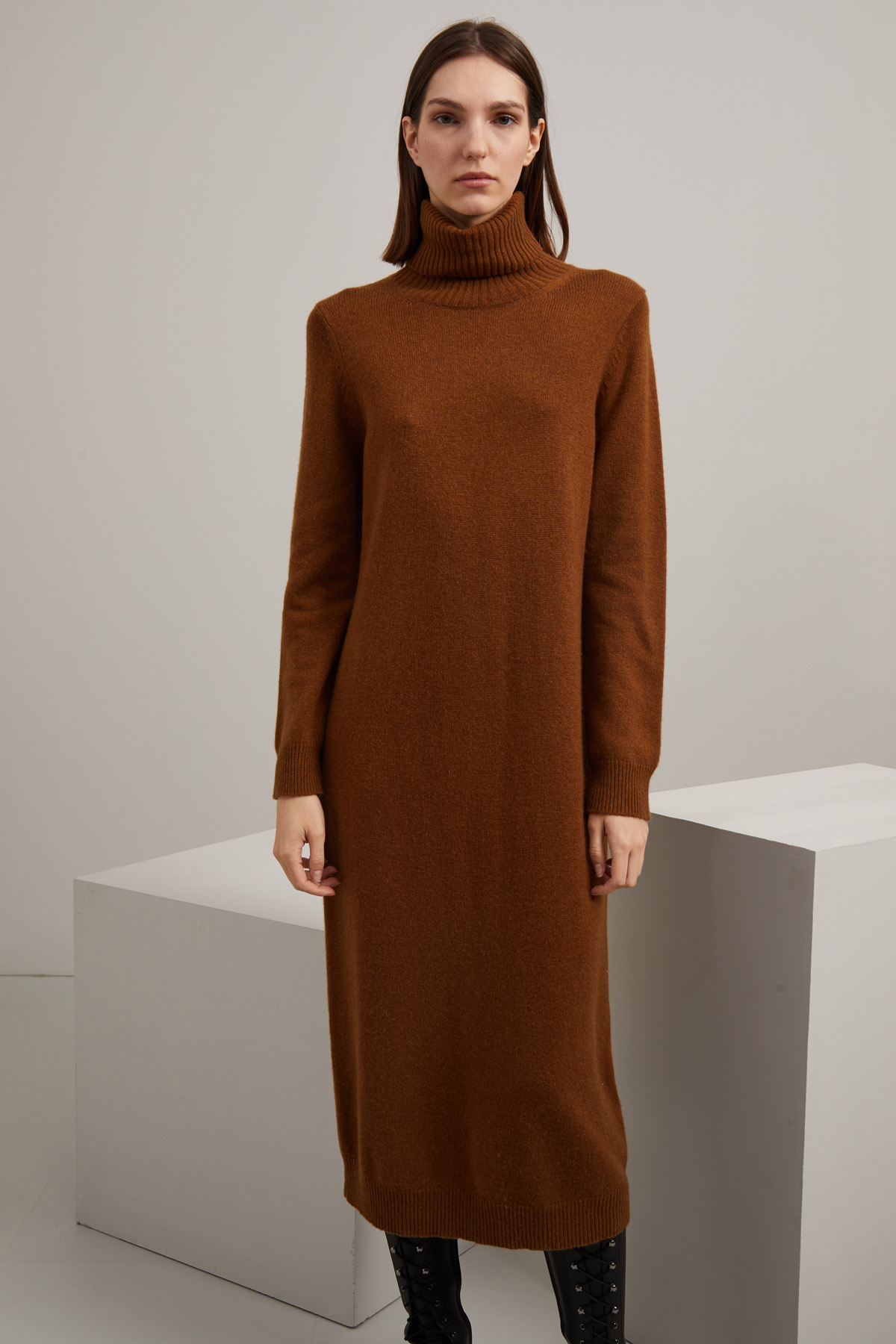 Abito lungo dalla linea dritta realizzato in maglia di lana e cashmere, con collo alto risvoltato, maniche lunghe e profili rifiniti a coste.