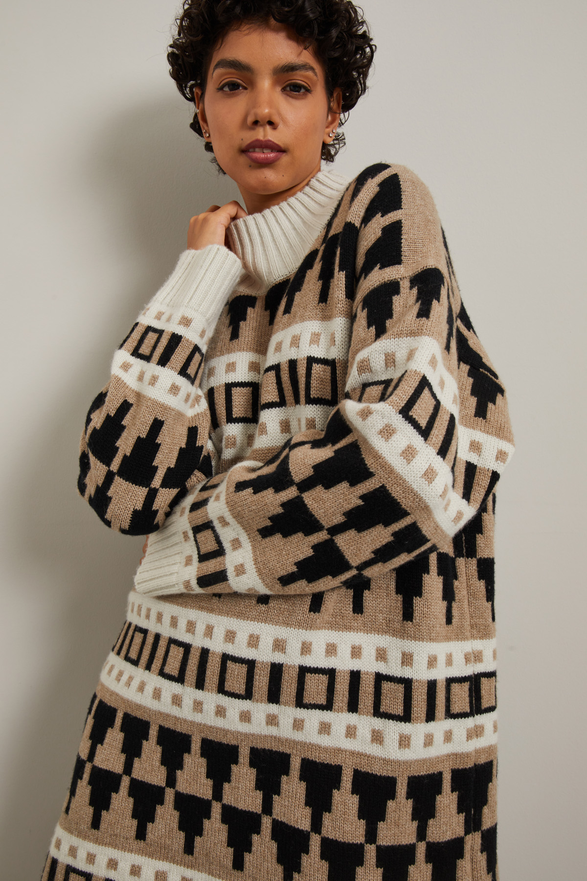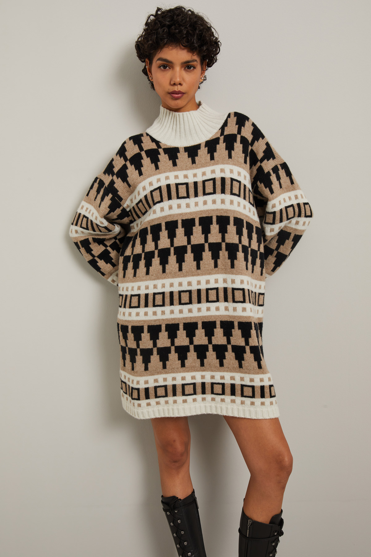 Abito corto dalla linea dritta realizzato in filato di lana e cashmere, con lavorazione jacquard, collo a cratere, maniche lunghe dal giro sceso e profili rifiniti a coste.