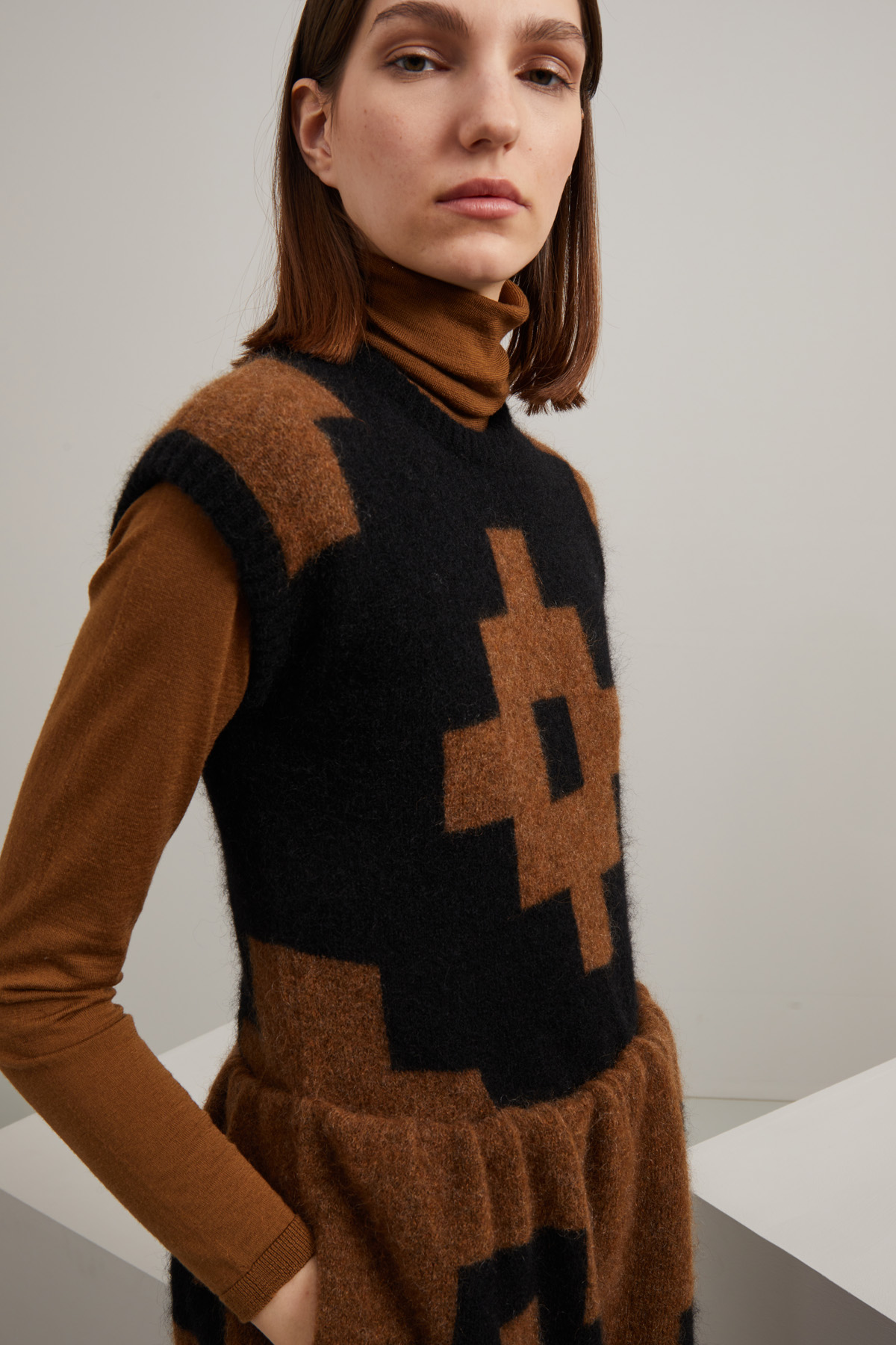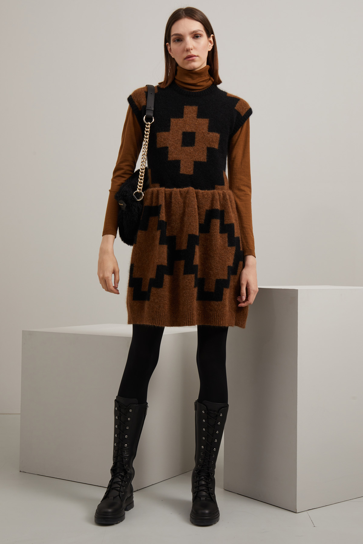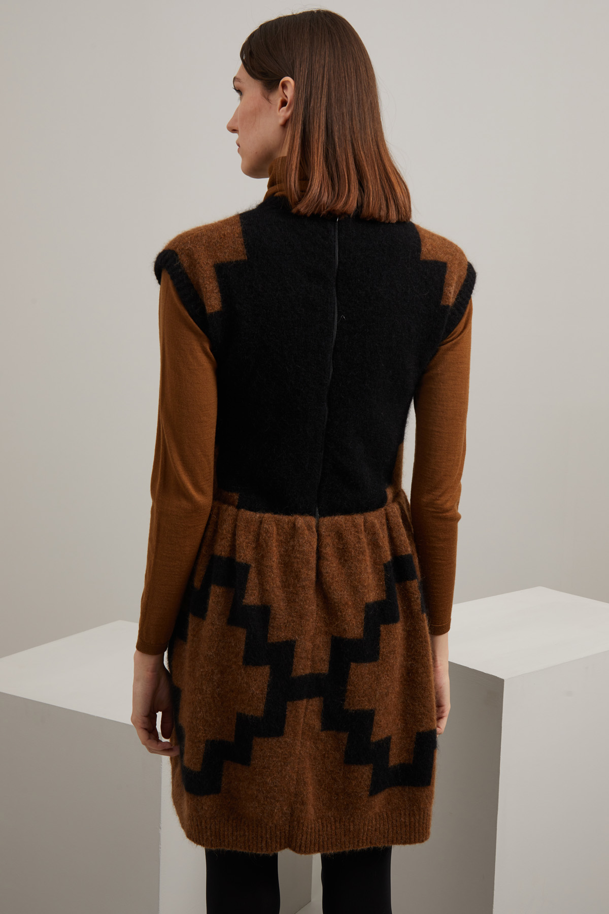 Abito dalla linea svasata realizzato in filato di misto mohair e lana con motivo a intarsio, scollo a giro, maniche corte ad aletta, tasche inserite in cucitura e taglio in vita con arricciatura, profili rifiniti a coste. Allacciatura tramite zip nel retro. Capo semifoderato.