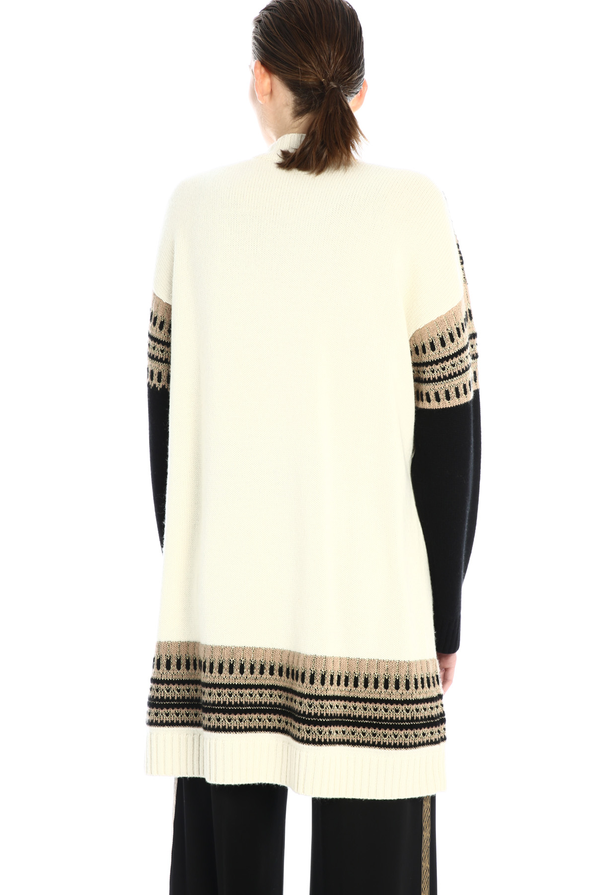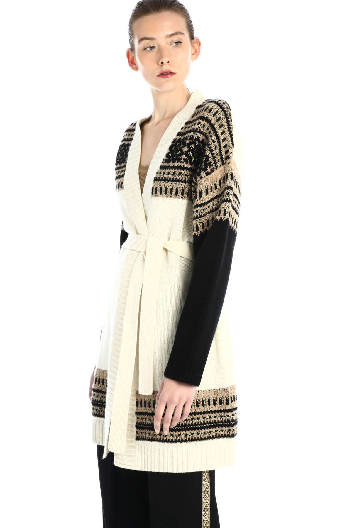 Cardigan dalla linea morbida realizzato in filato di lana e cashmere, con intarsio e inserto di fibra lamè. Modello con scollo a V, maniche lunghe dal giro sceso, bordi rifiniti a coste e allacciatura tramite cintura coordinata.