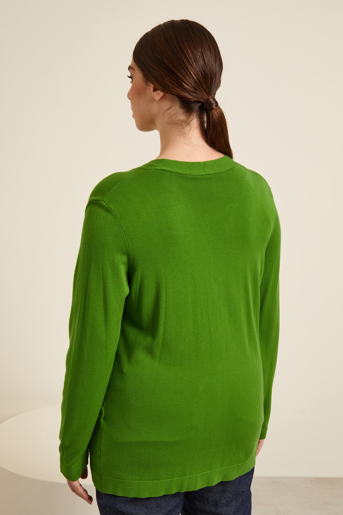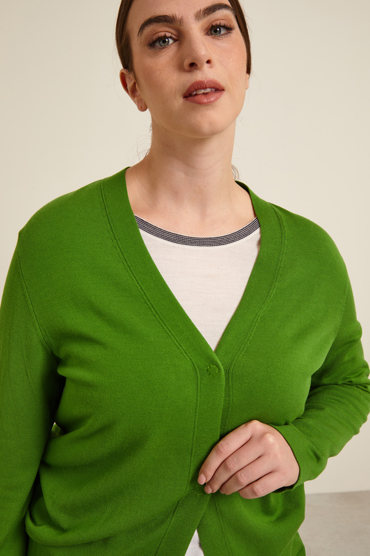 Cardigan dalla linea regolare realizzato in filato di misto viscosa stretch, con scollo a V, maniche lunghe a giro e allacciatura tramite bottoni automatici.