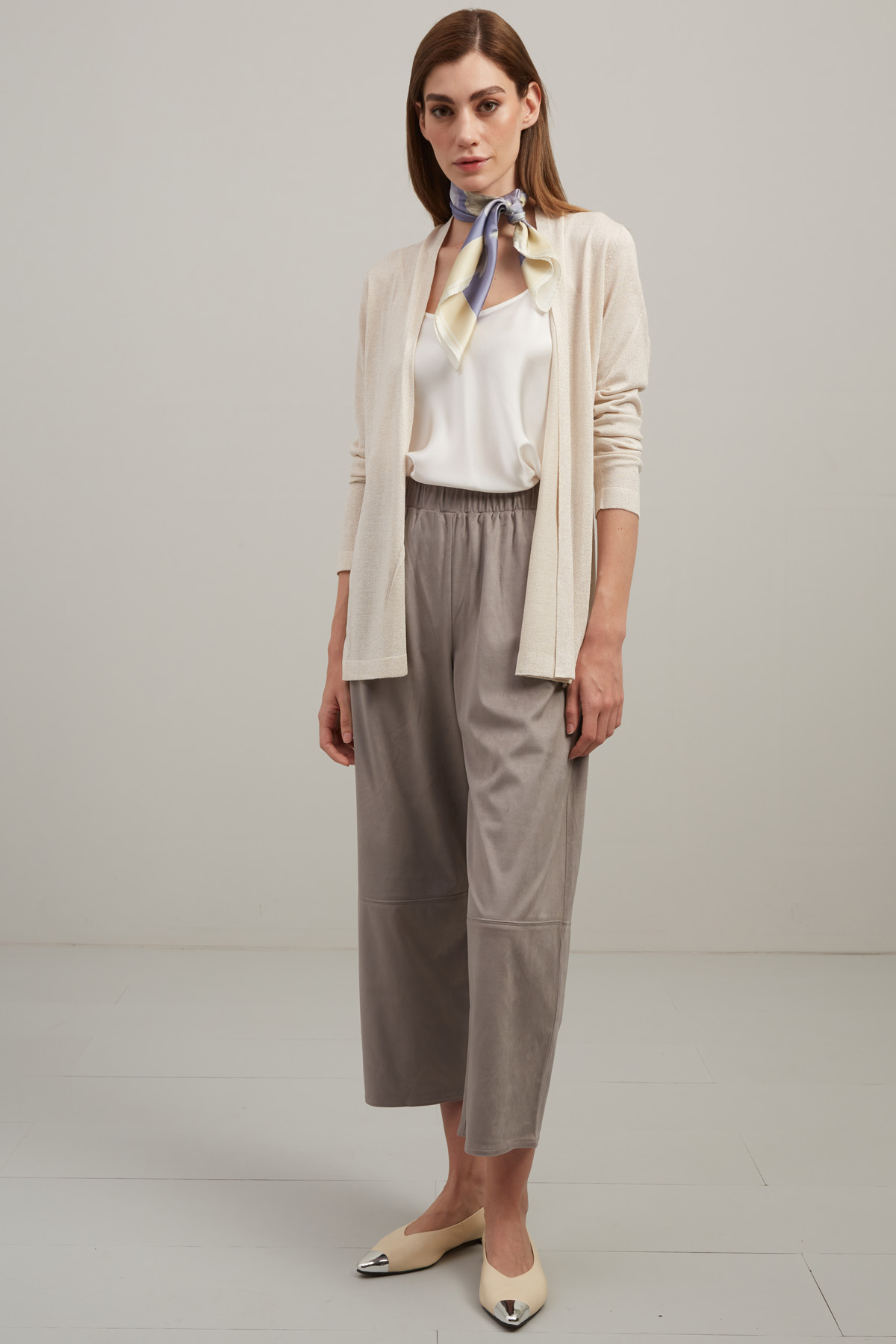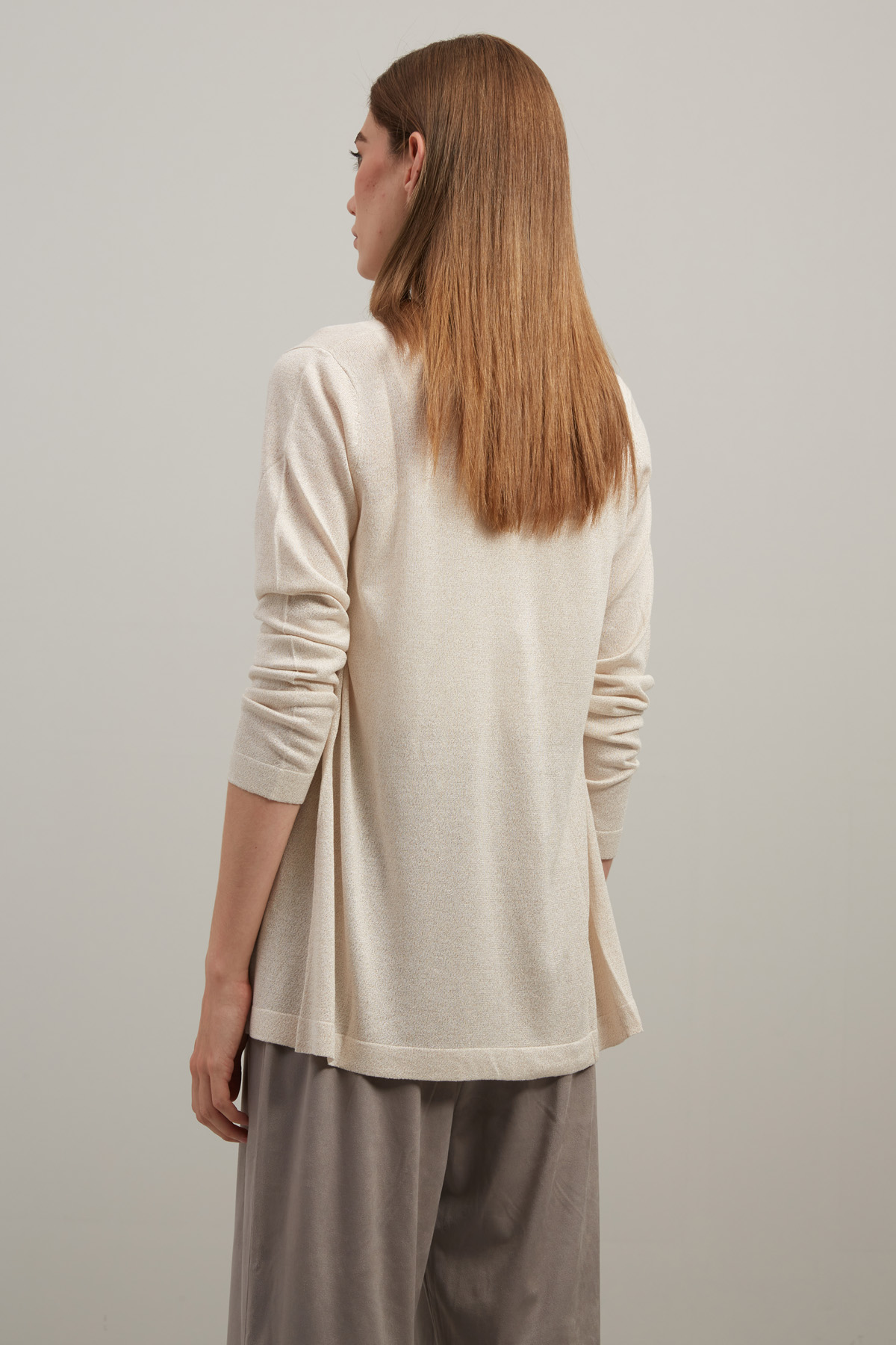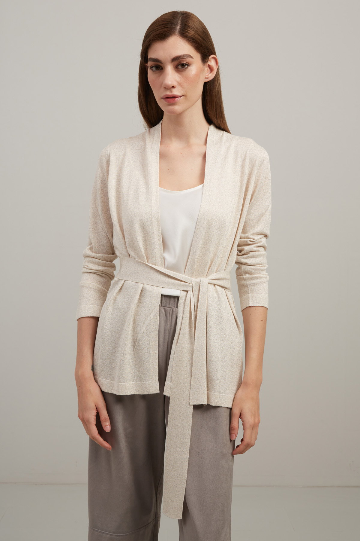 Cardigan dalla linea dritta realizzato in filato di misto viscosa con inserto lamè, maniche lunghe e cintura coordinata.