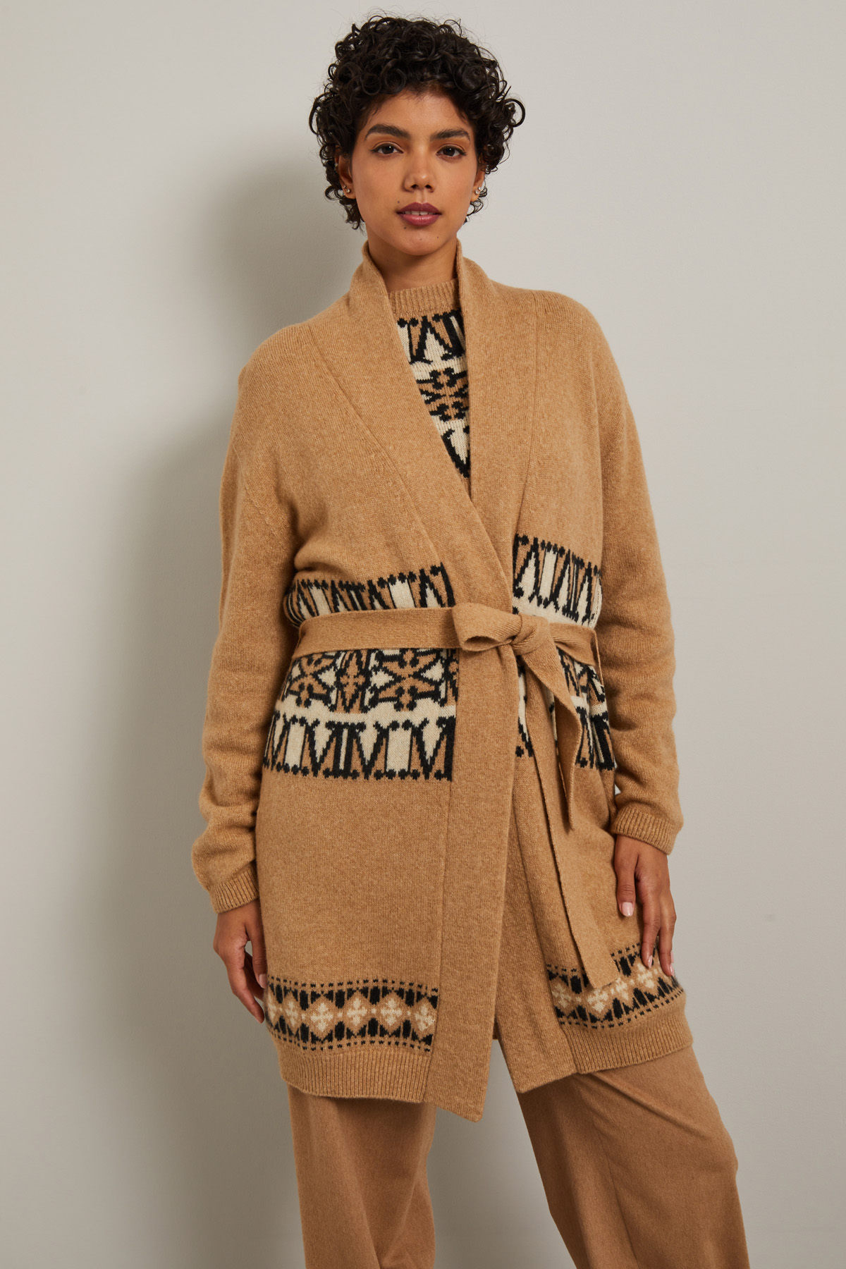Cardigan lungo dalla linea dritta realizzato in filato di lana e cammello, con lavorazione jacquard, maniche lunghe e profili rifiniti a coste. Allacciatura tramite cintura coordinata.