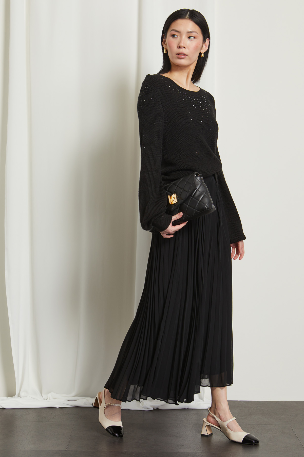 Maglia dalla linea dritta realizzata in filato di misto lana con motivo di strass applicati, scollo a giro e maniche lunghe dal giro sceso, profili rifiniti a coste.