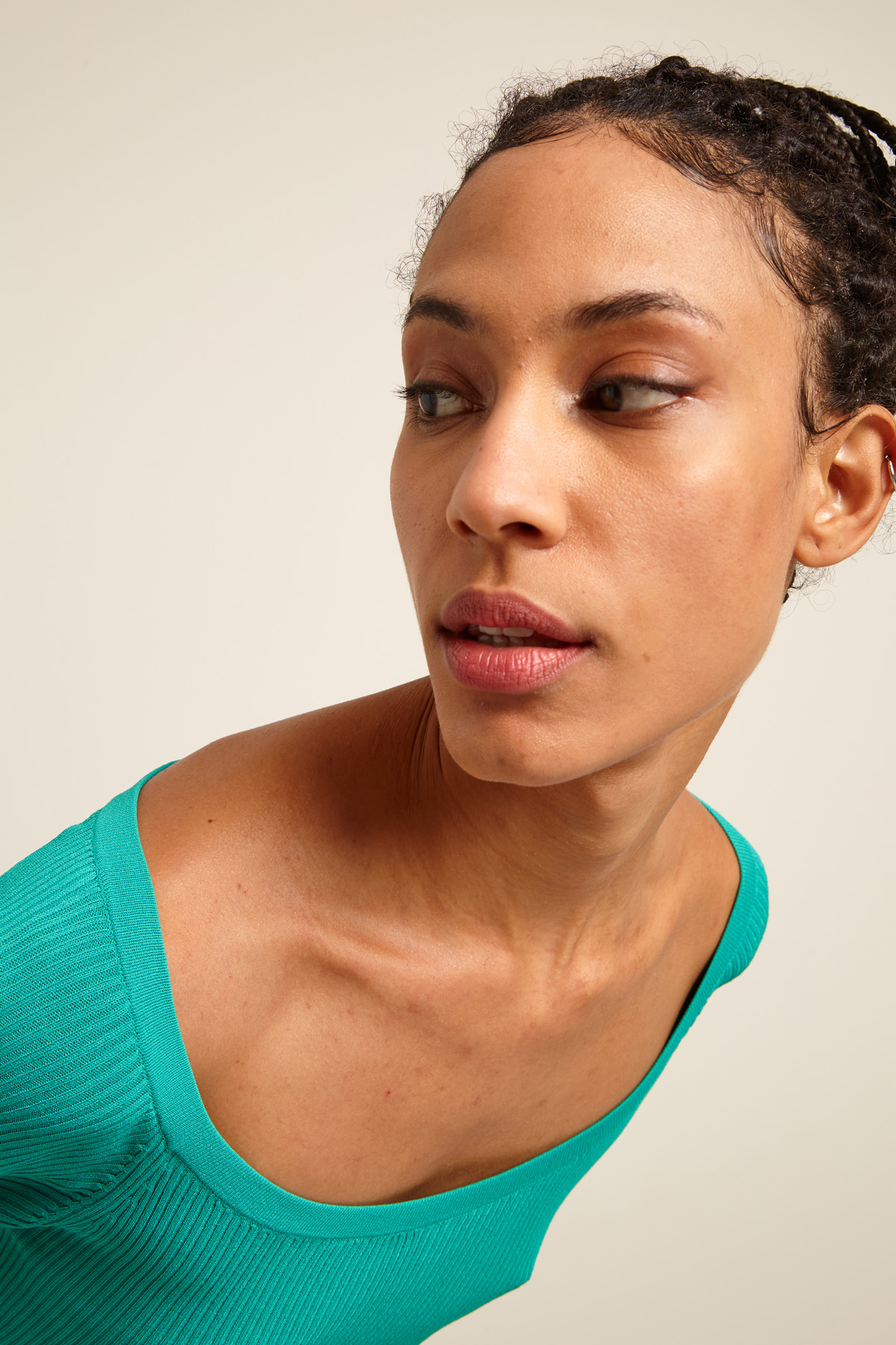 Maglia dalla linea aderente realizzata in filato di misto viscosa con lavorazione a coste, scollo a barchetta e maniche lunghe raglan.