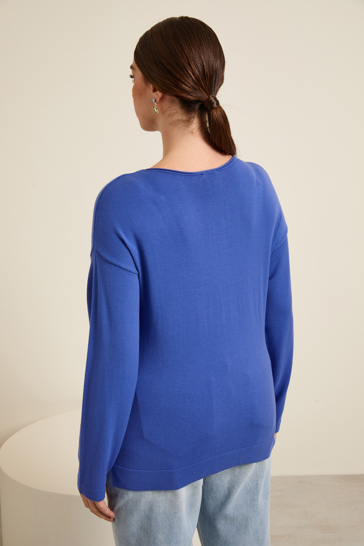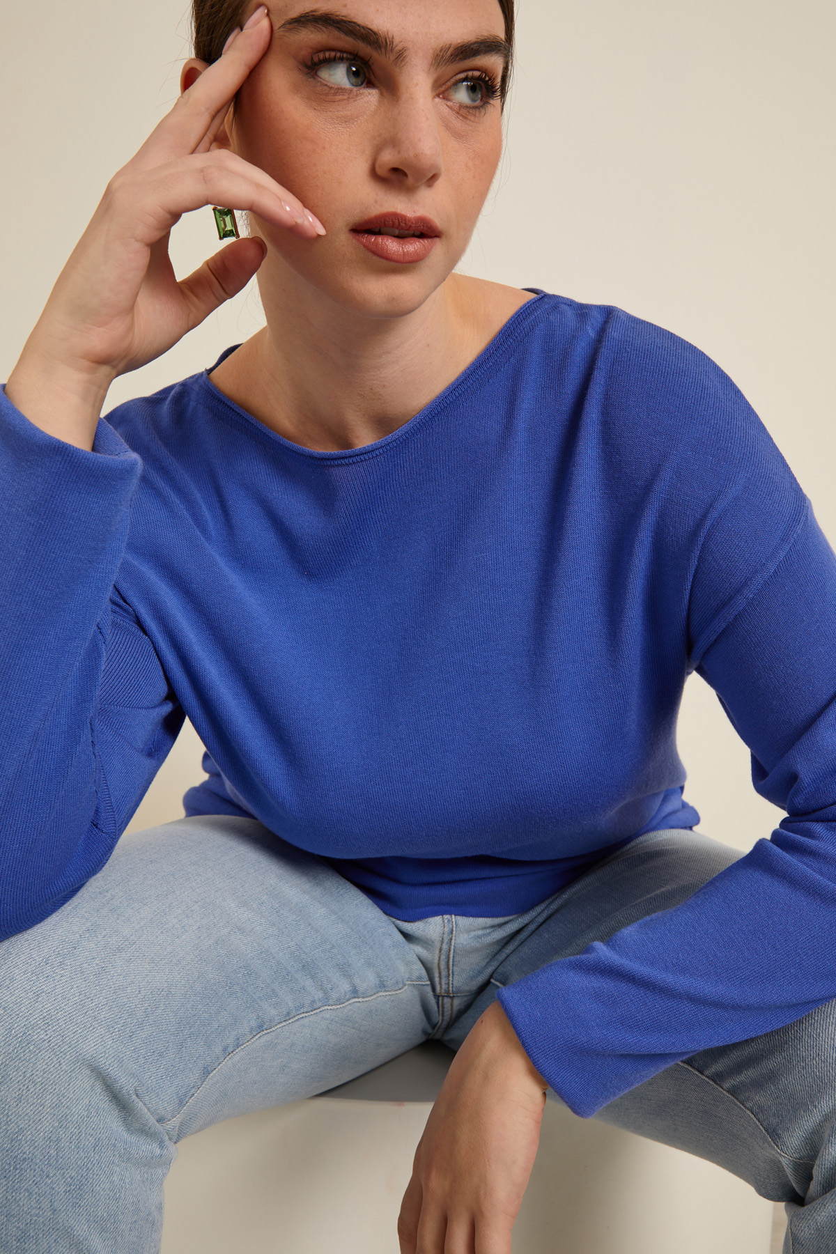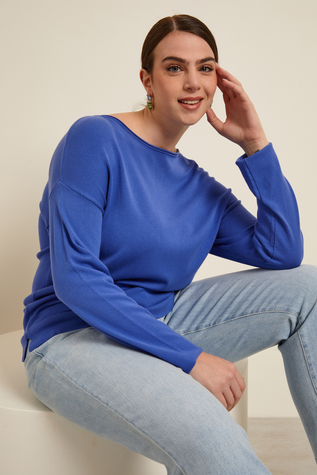 Maglia dalla linea dritta realizzata in filato di misto viscosa, con scollo a barchetta, maniche lunghe dal giro sceso e piccoli spacchetti laterali.