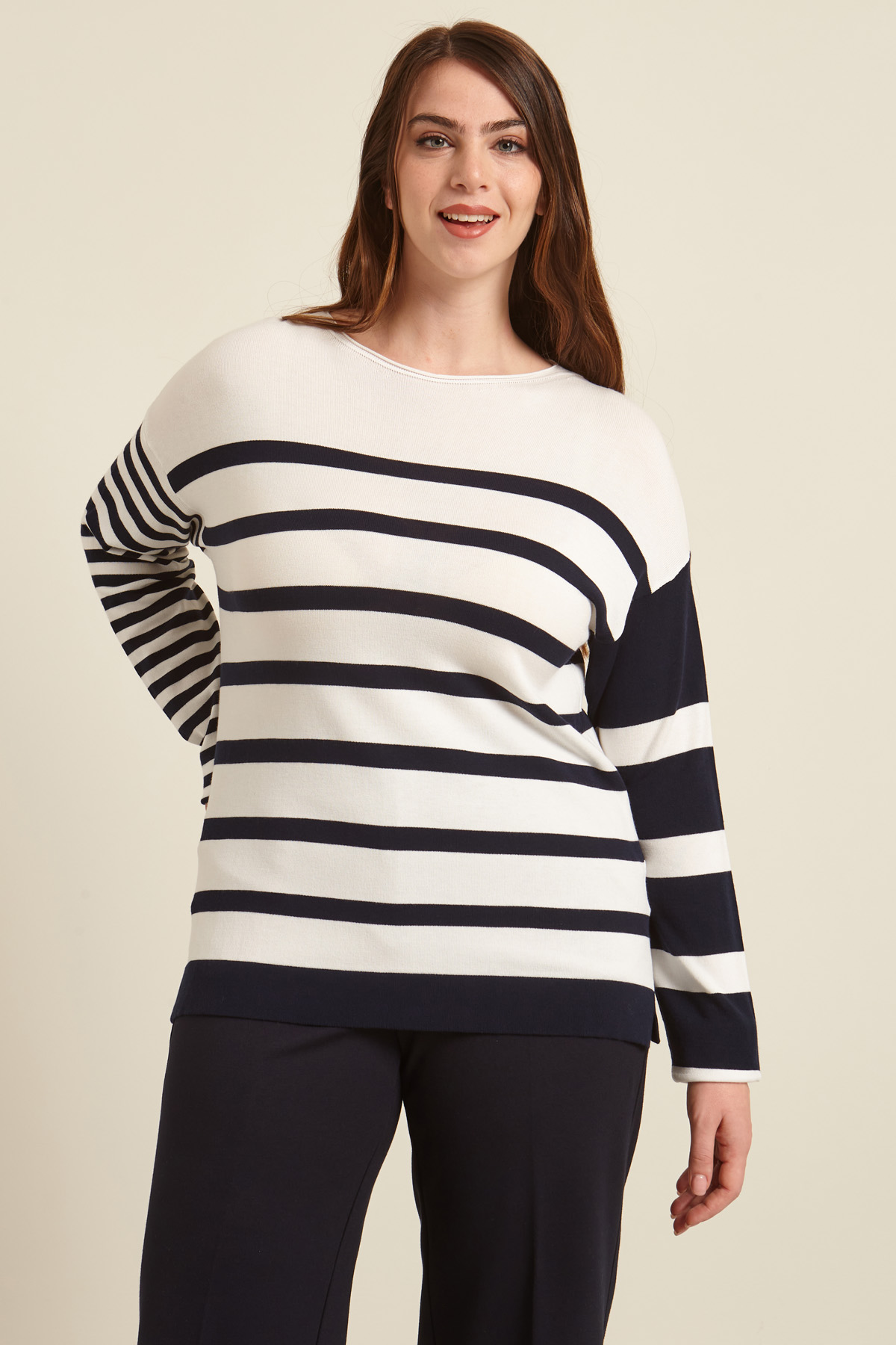 Maglia dalla linea dritta realizzata in filato di misto viscosa, con scollo a barchetta, maniche lunghe dal giro sceso e piccoli spacchetti laterali.