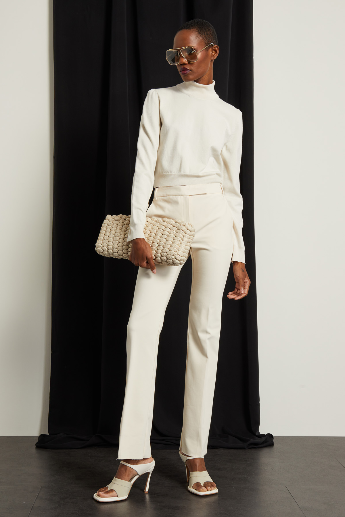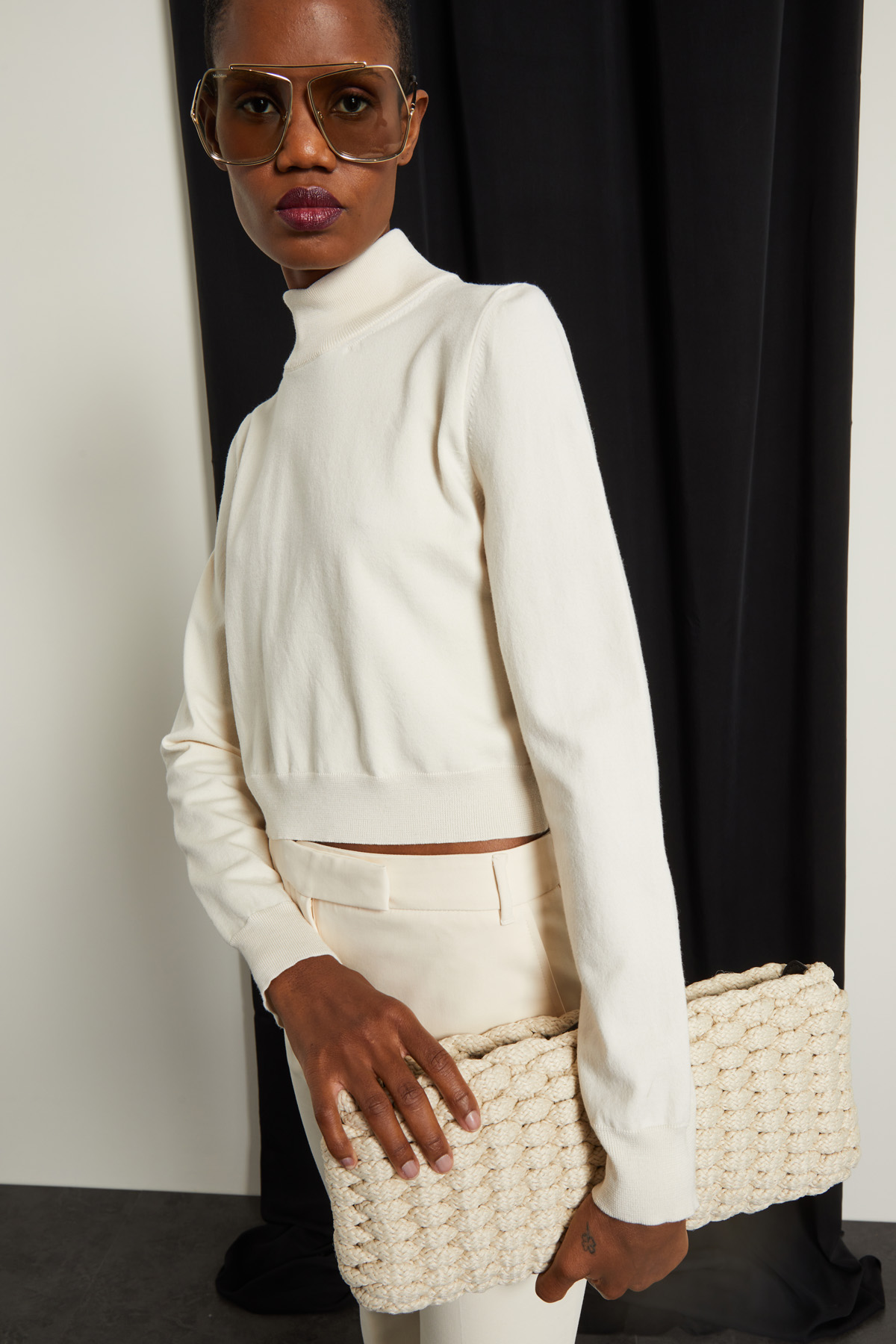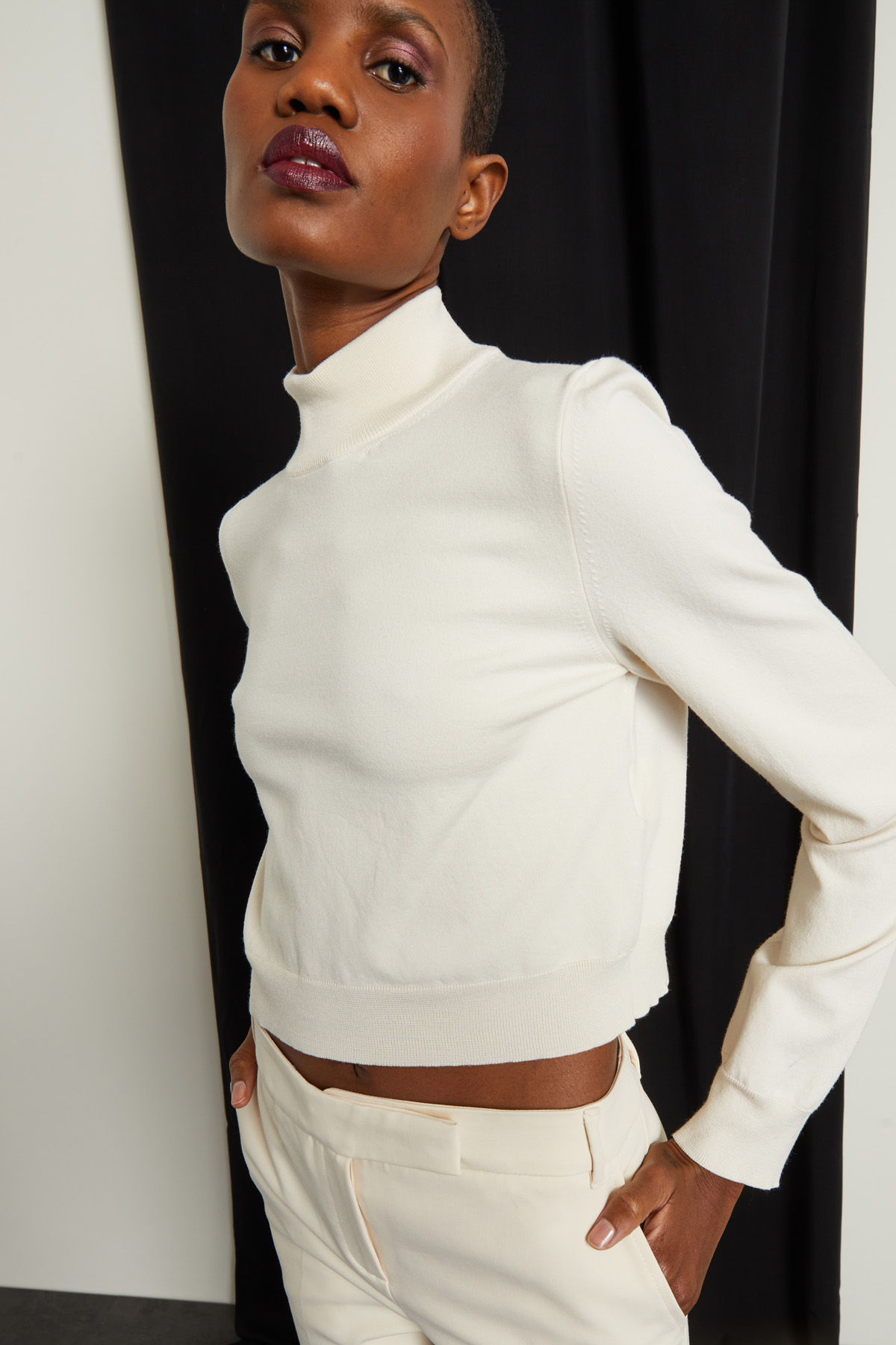 Dolcevita corto dalla linea regolare realizzato in filato di misto lana, con collo a cratere, maniche lunghe e profili rifiniti a coste. Dettaglio di cerniera nel retro.