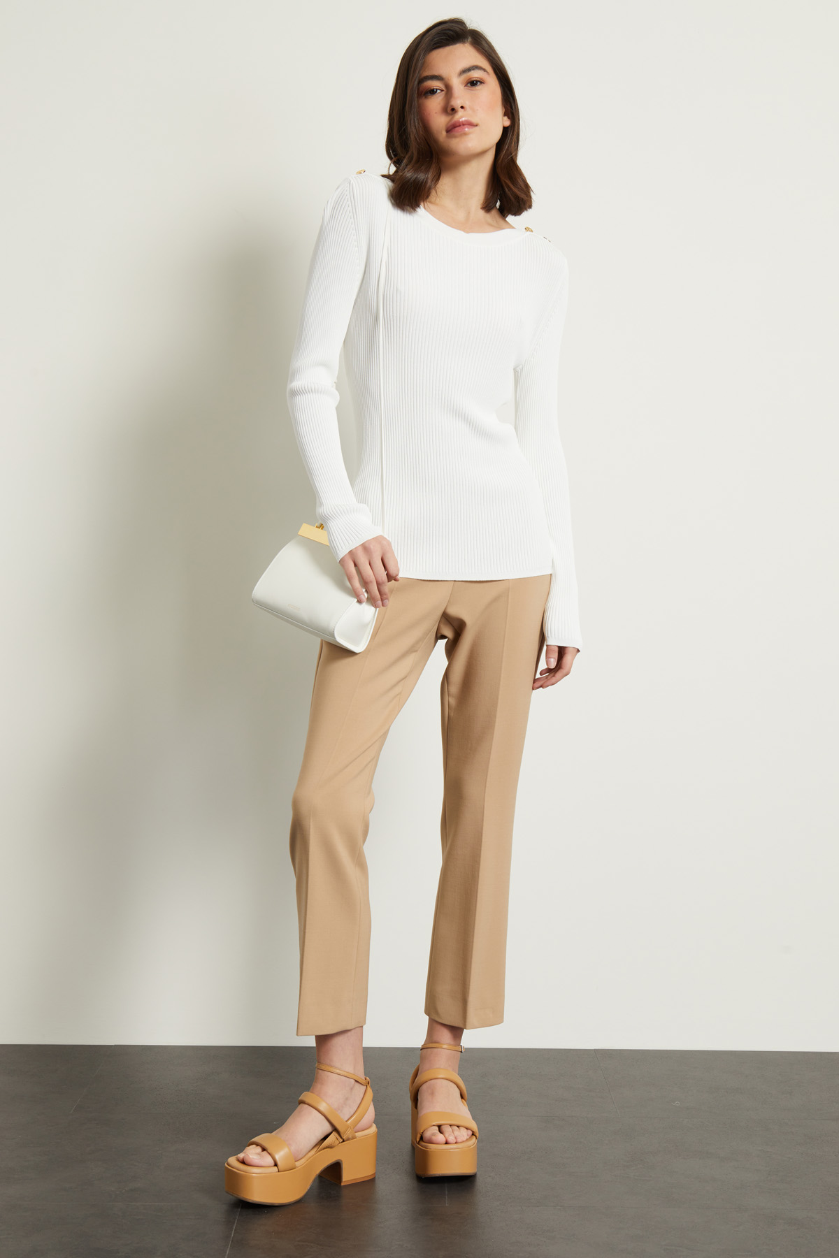 Maglia dalla linea aderente realizzata in filato di misto viscosa a coste, con scollo a barchetta, bottoni decorativi sulle spalle e maniche lunghe.