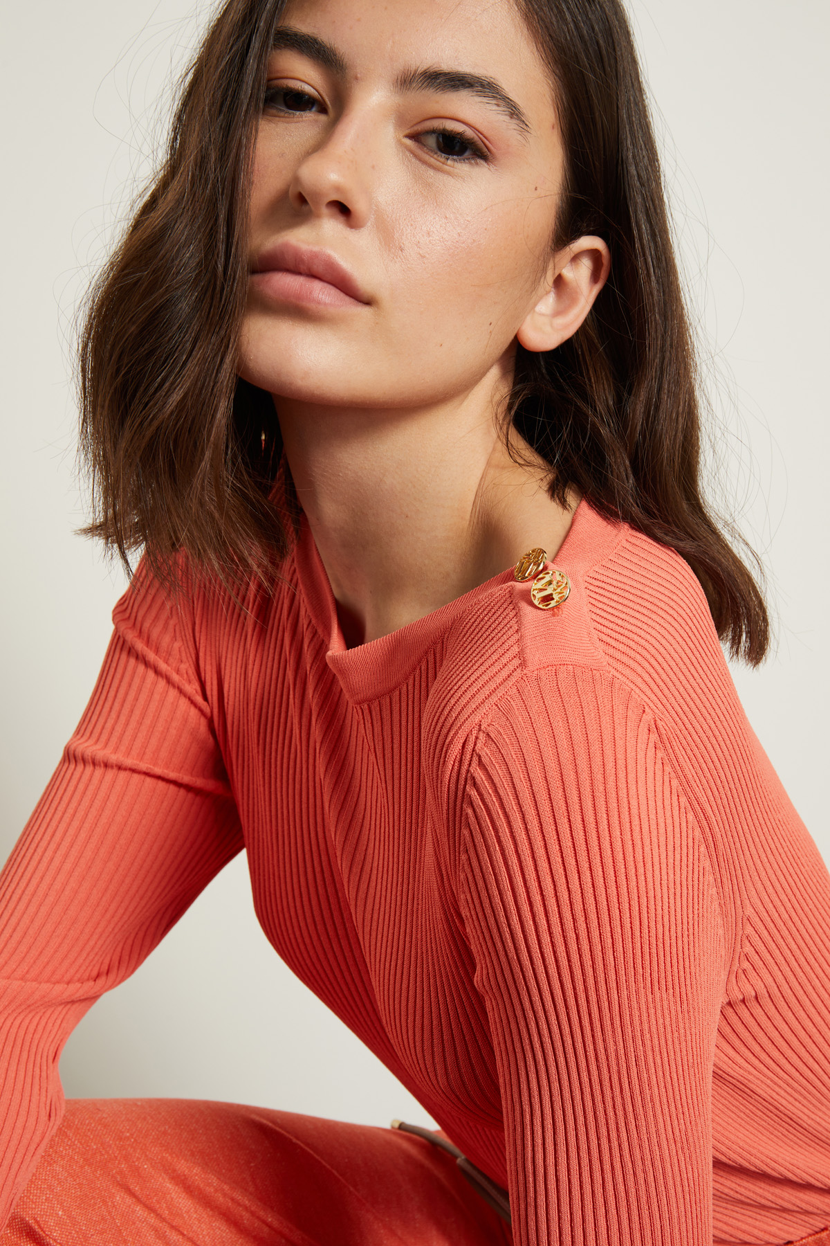 Maglia dalla linea aderente realizzata in filato di misto viscosa a coste, con scollo a barchetta, bottoni decorativi sulle spalle e maniche lunghe.
