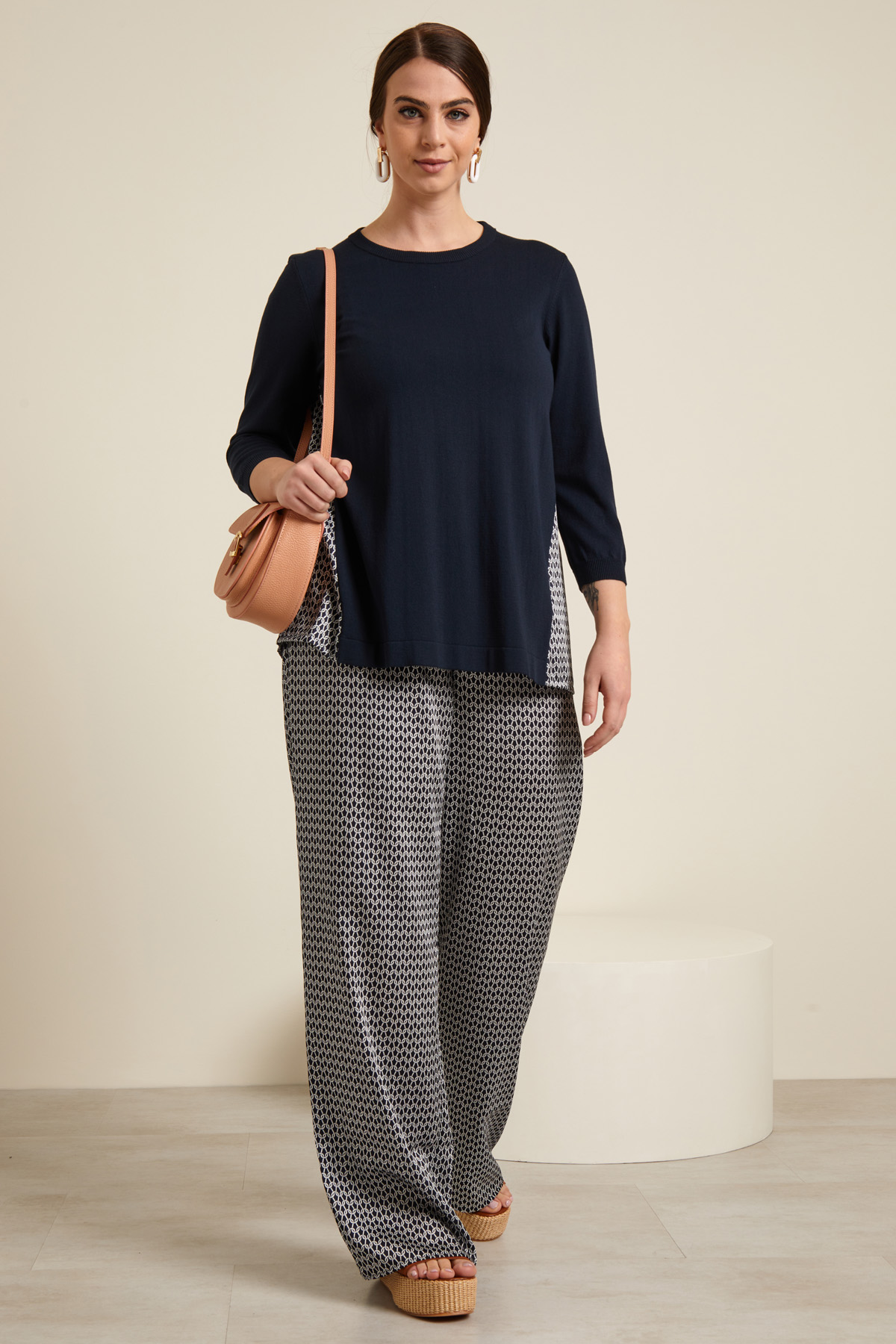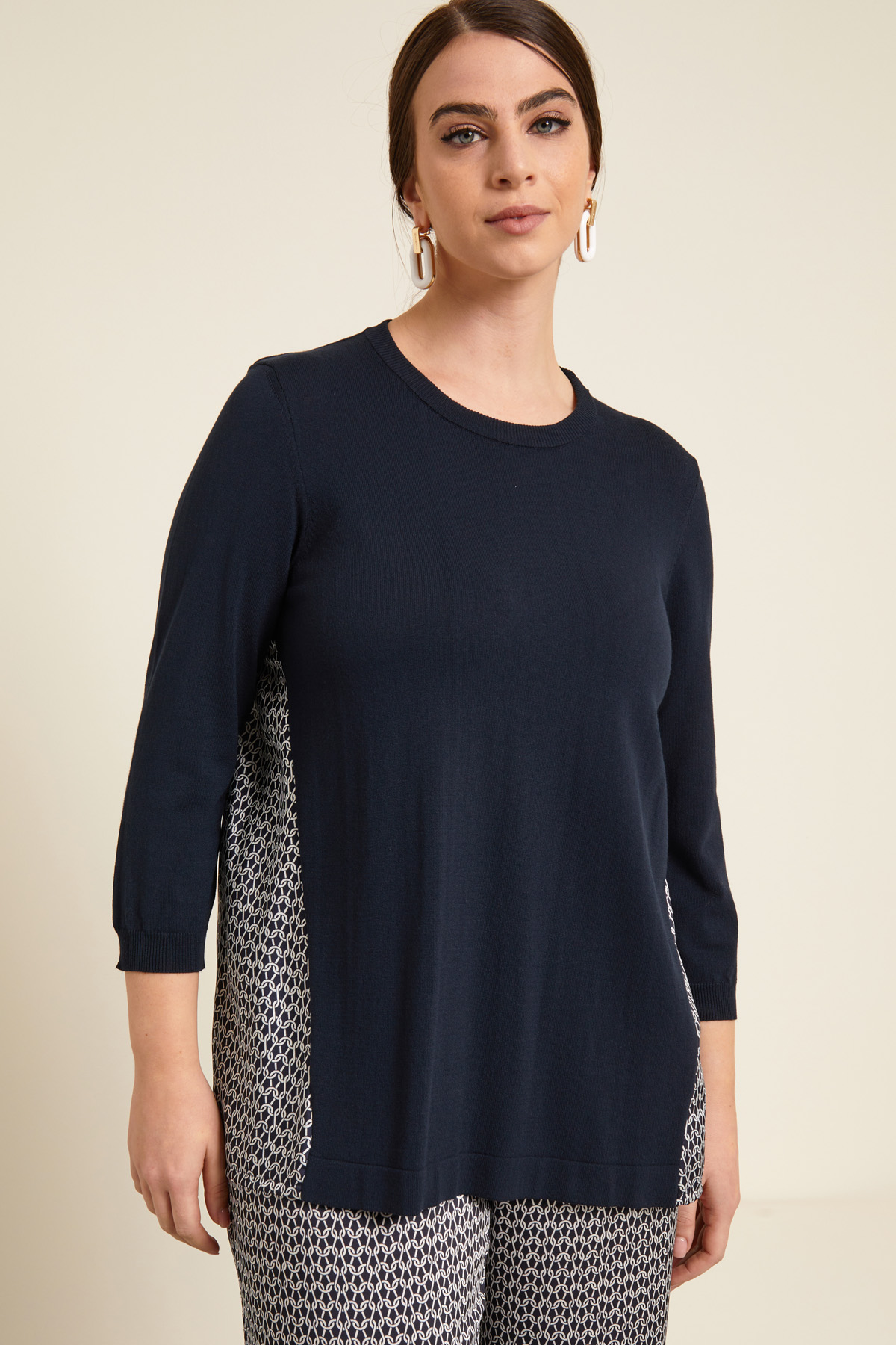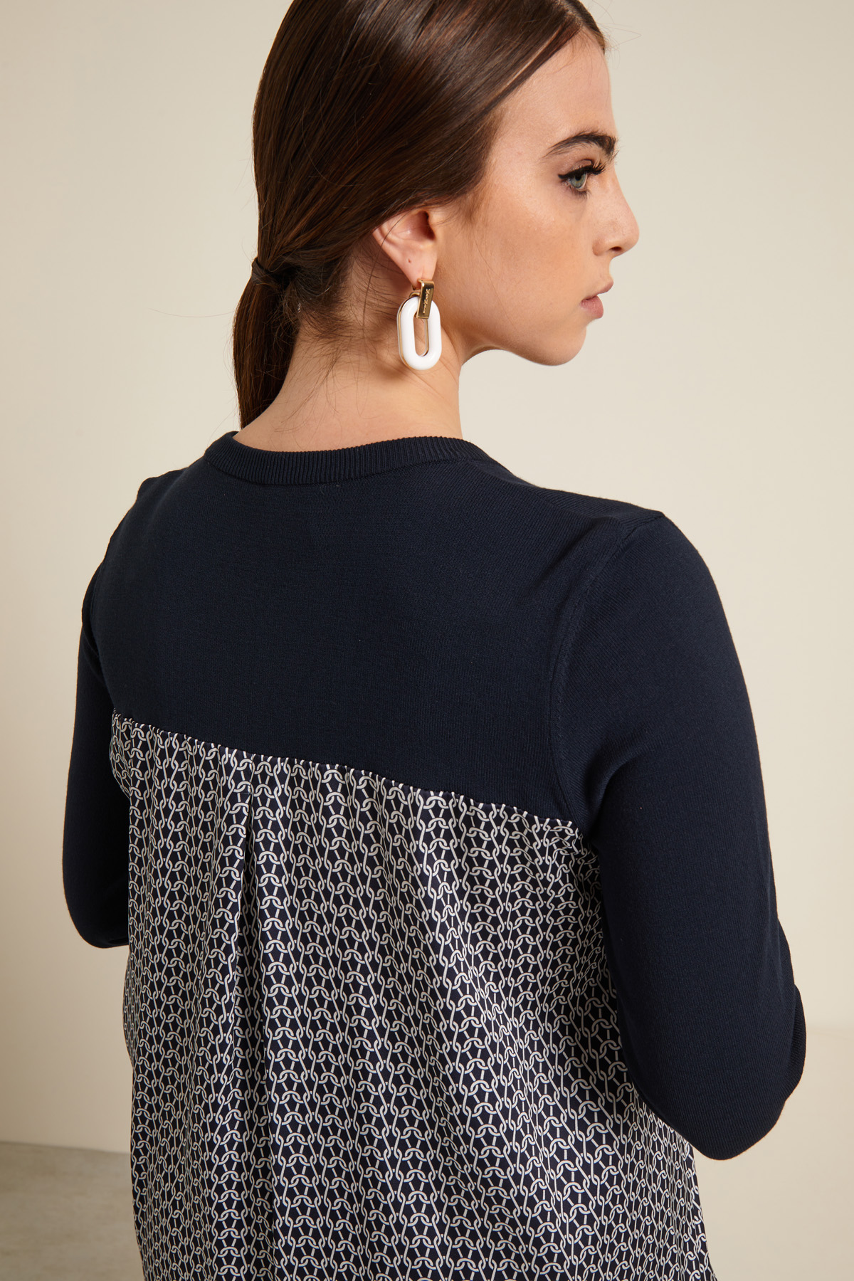 Maglia dalla linea svasata realizzata in filato di misto viscosa, con inserto in twill stampato a fantasia, scollo rotondo, maniche lunghe e contropiego cucito nel retro.
