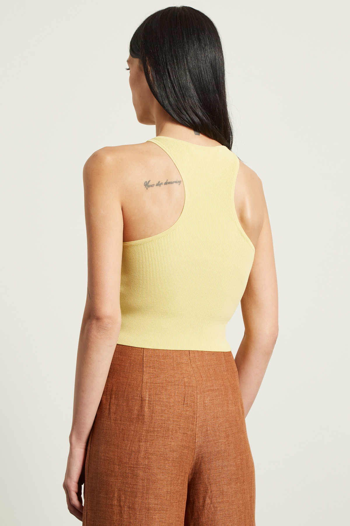 Crop top smanicato dalla linea aderente realizzato in filato di misto viscosa a coste, con scollo a giro.