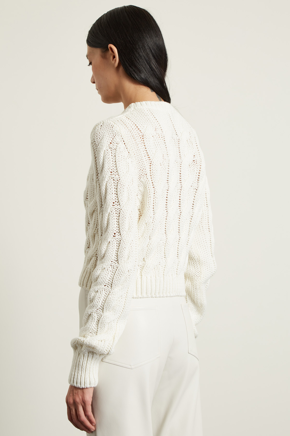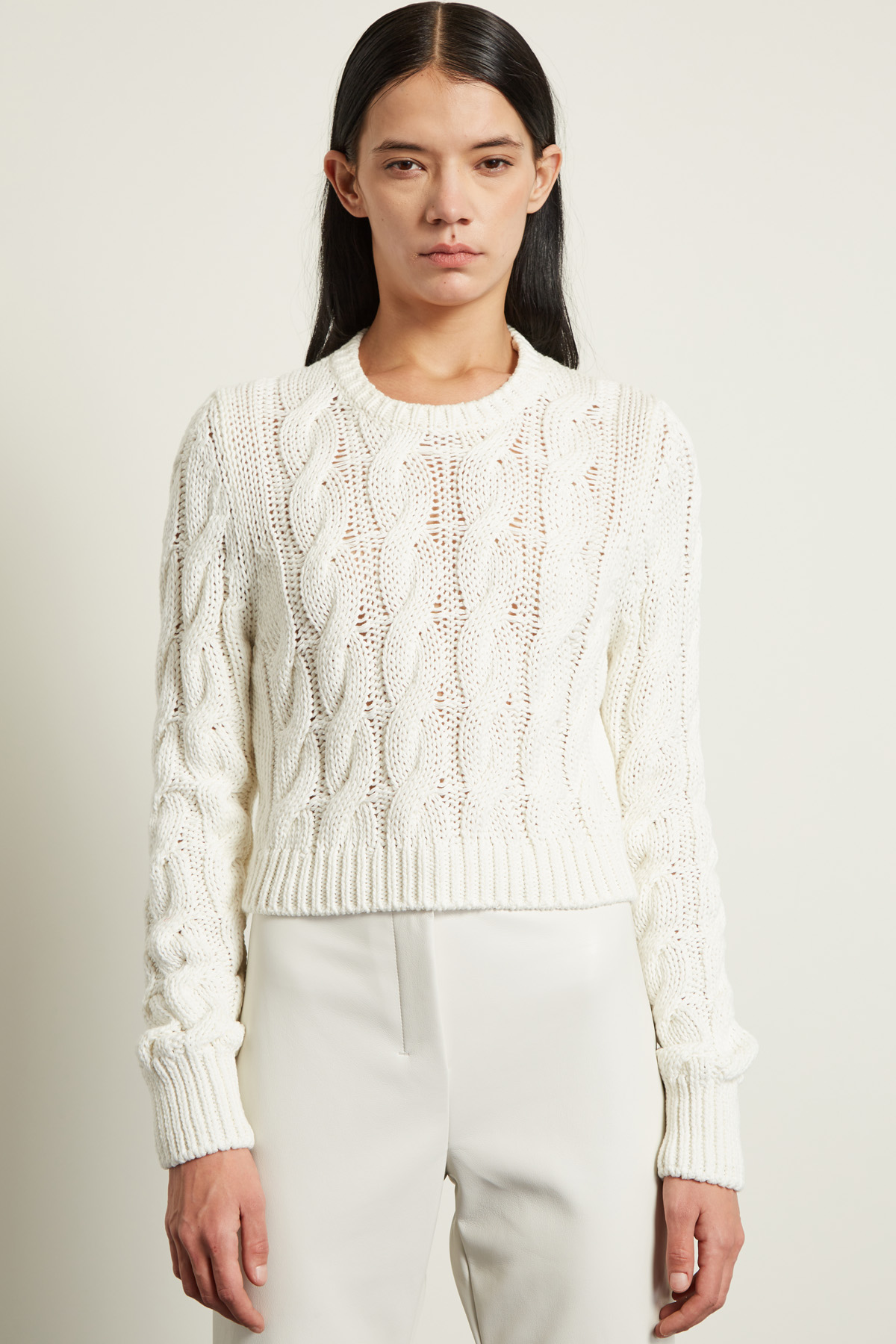 Maglia cropped dalla linea aderente realizzata in filato di puro cotone a trecce, con scollo a giro, maniche lunghe e profili rifiniti a coste.