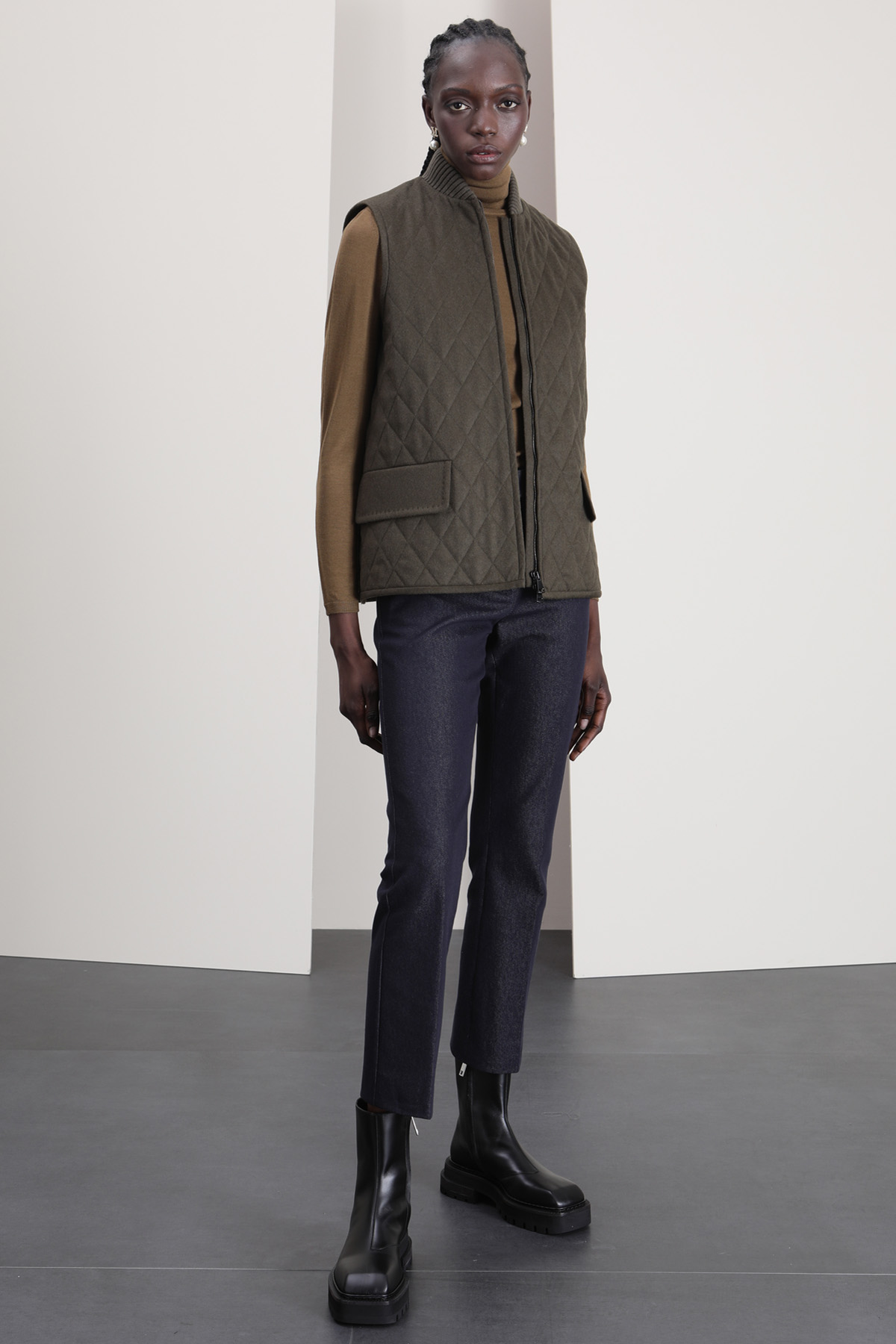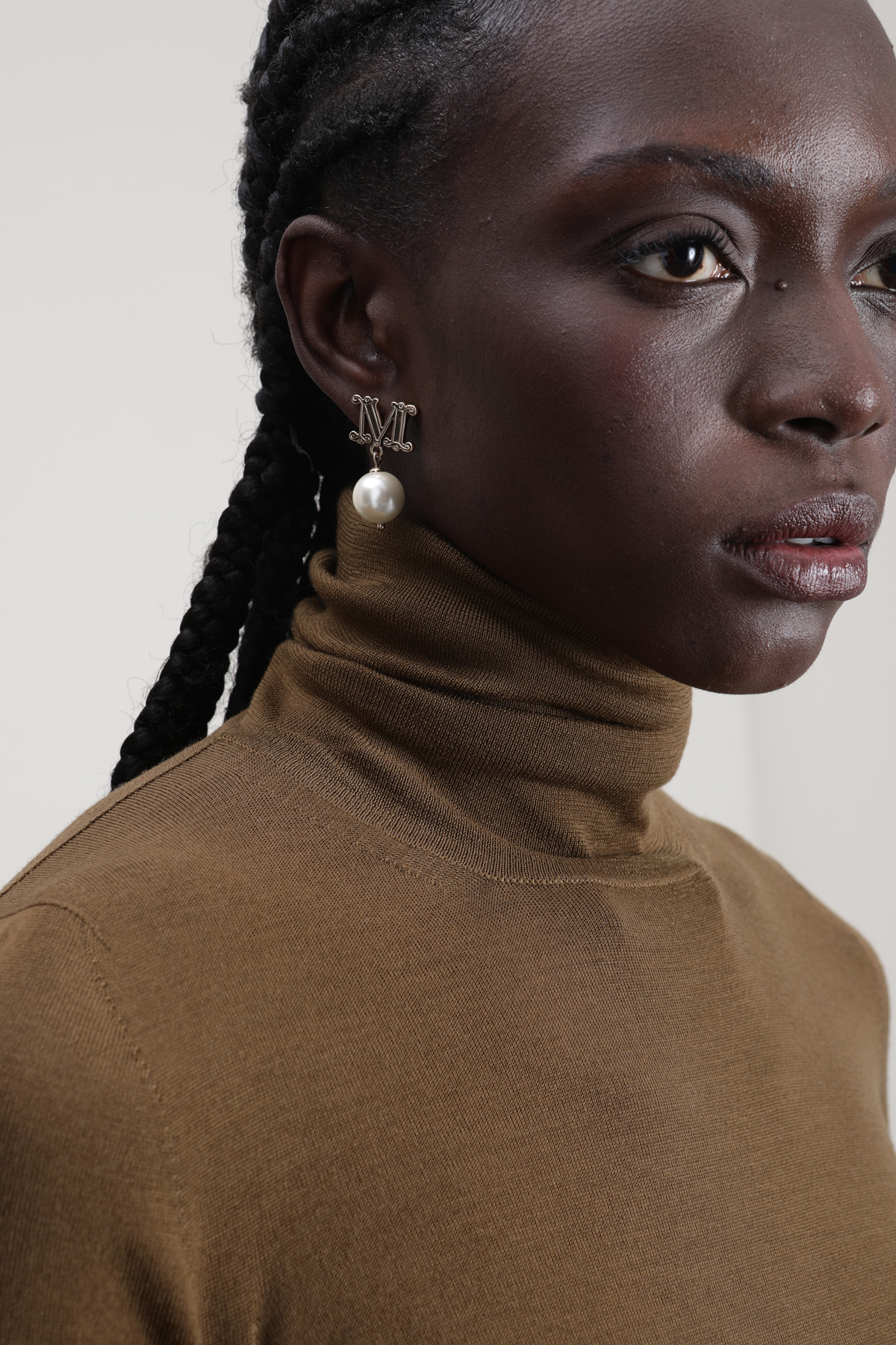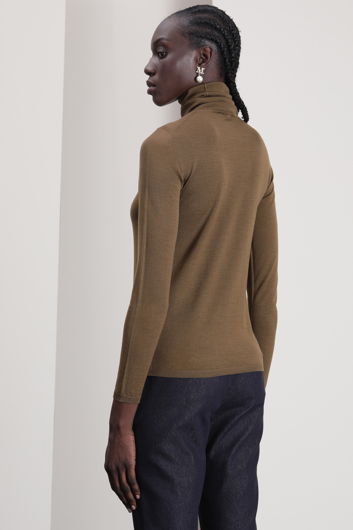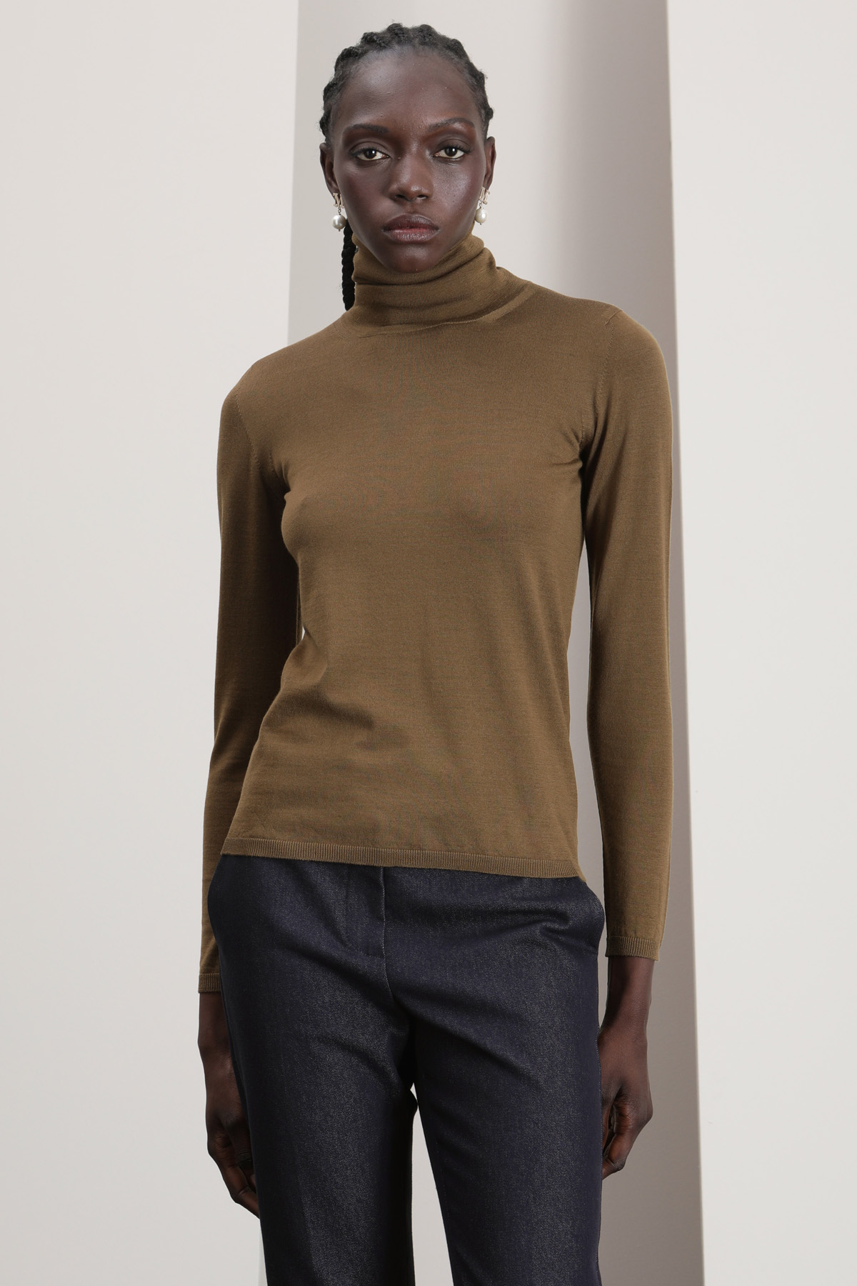 Dolcevita dalla linea semiaderente realizzato in filato di pura lana, con collo alto, maniche lunghe e profili rifiniti a coste.