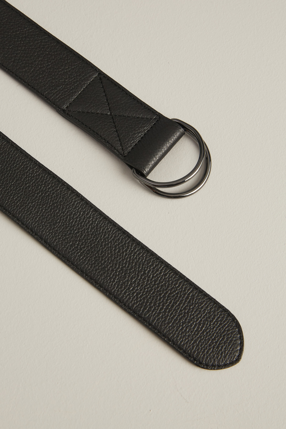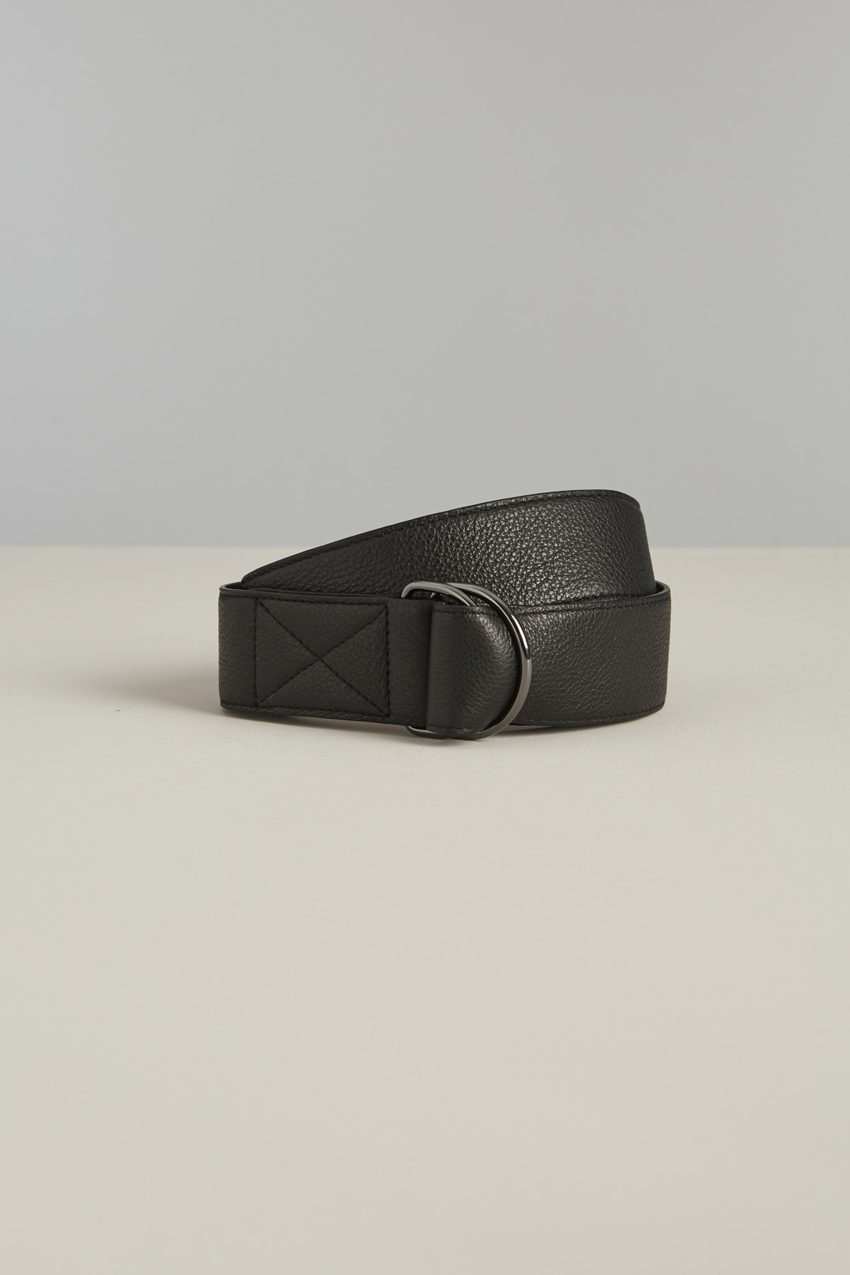 Cintura morbida realizzata in vera pelle martellata con doppia fibbia a semicerchio e chiusura a scorrimento.