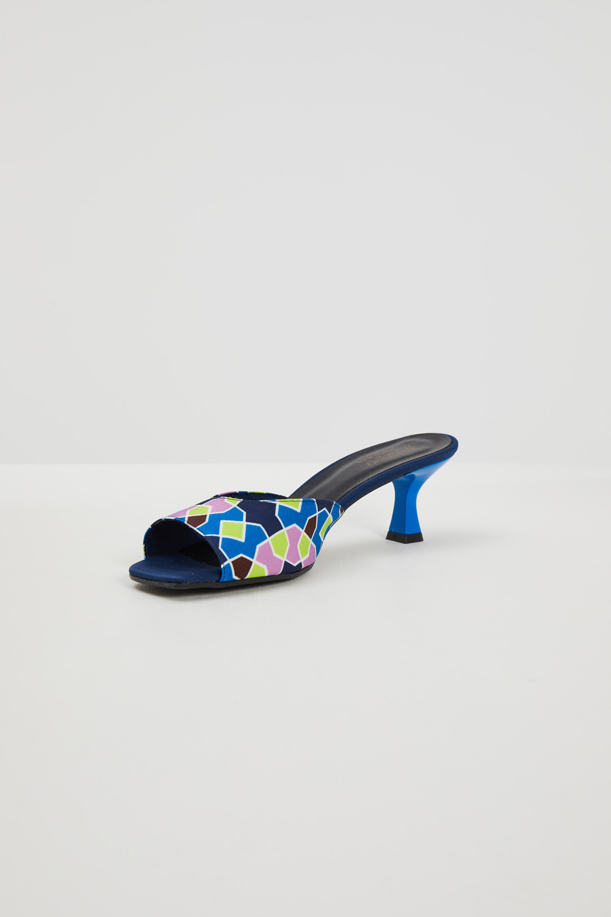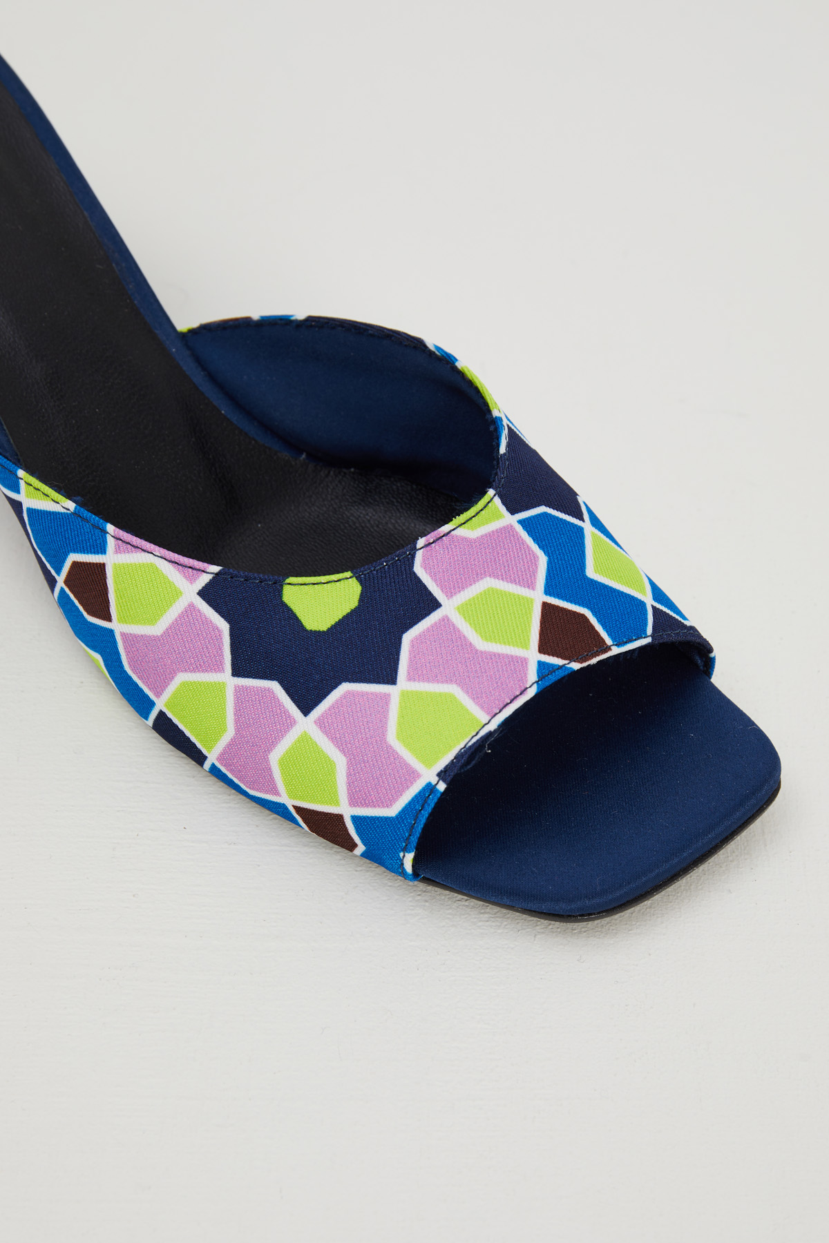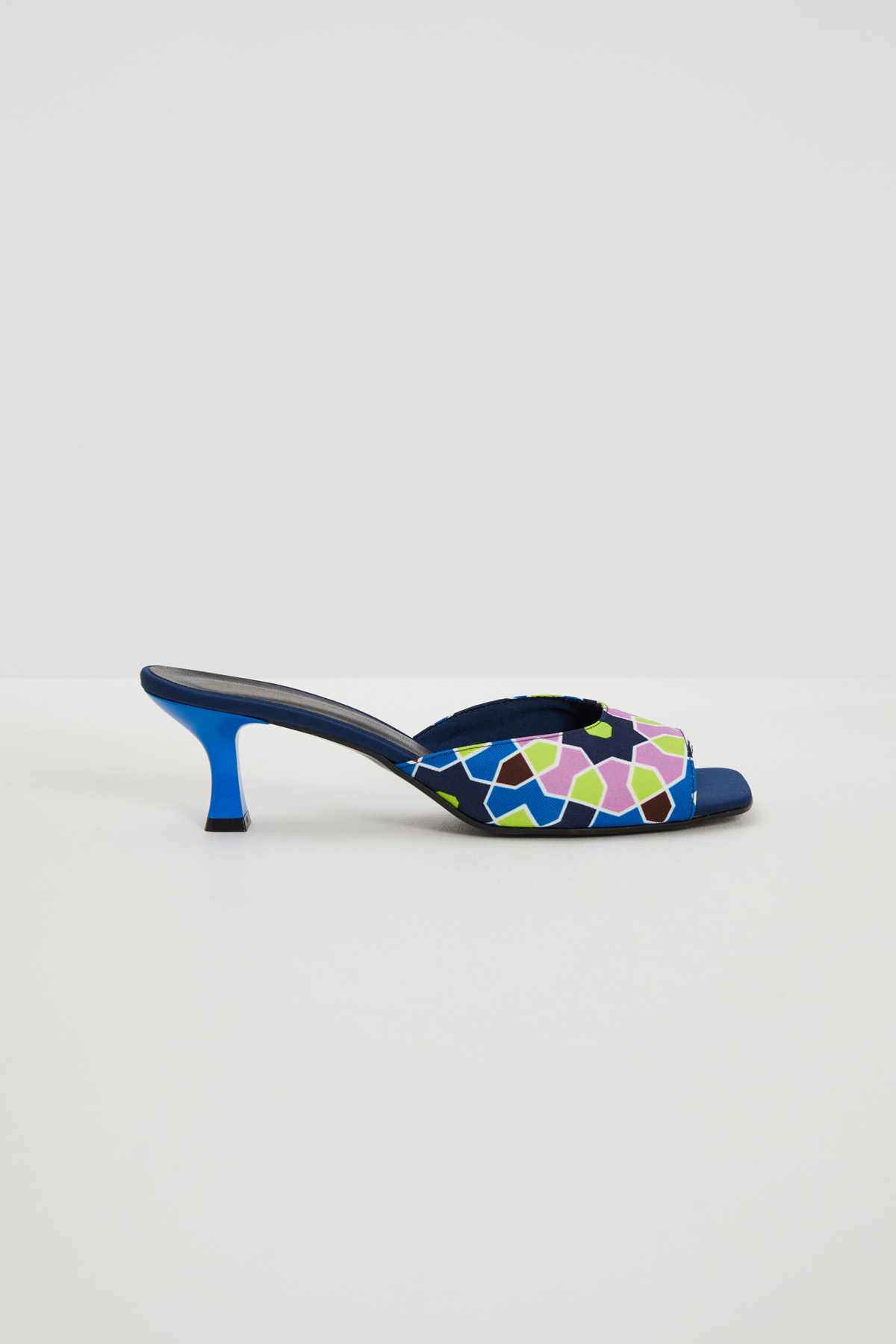 Sandali realizzati in twill stampato con fascia e punta squadrata, tacco a rocchetto laccato a contrasto e suola in gomma.