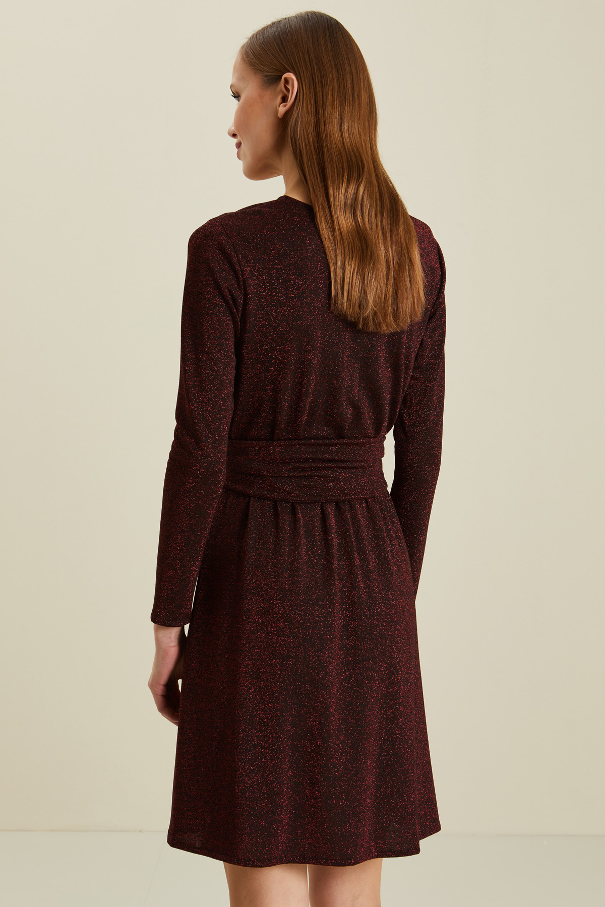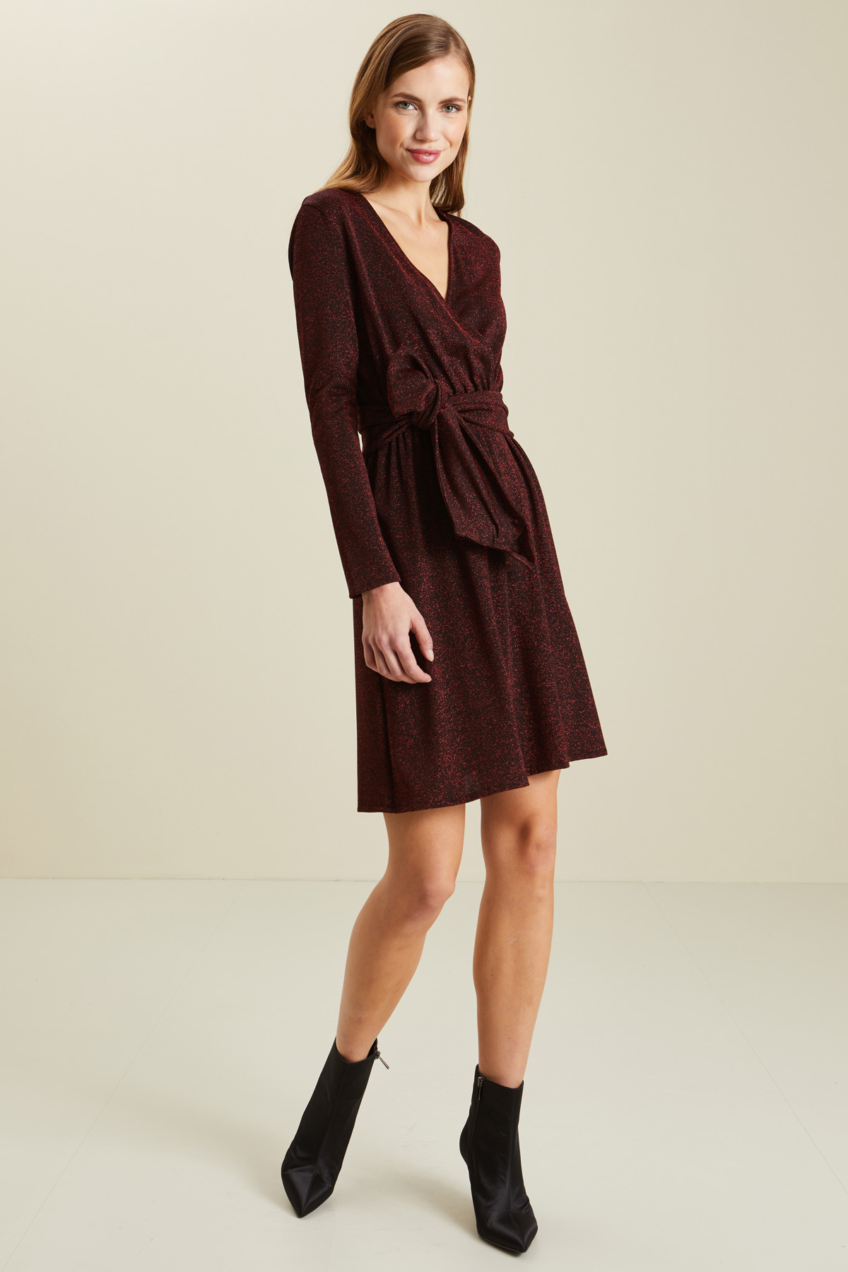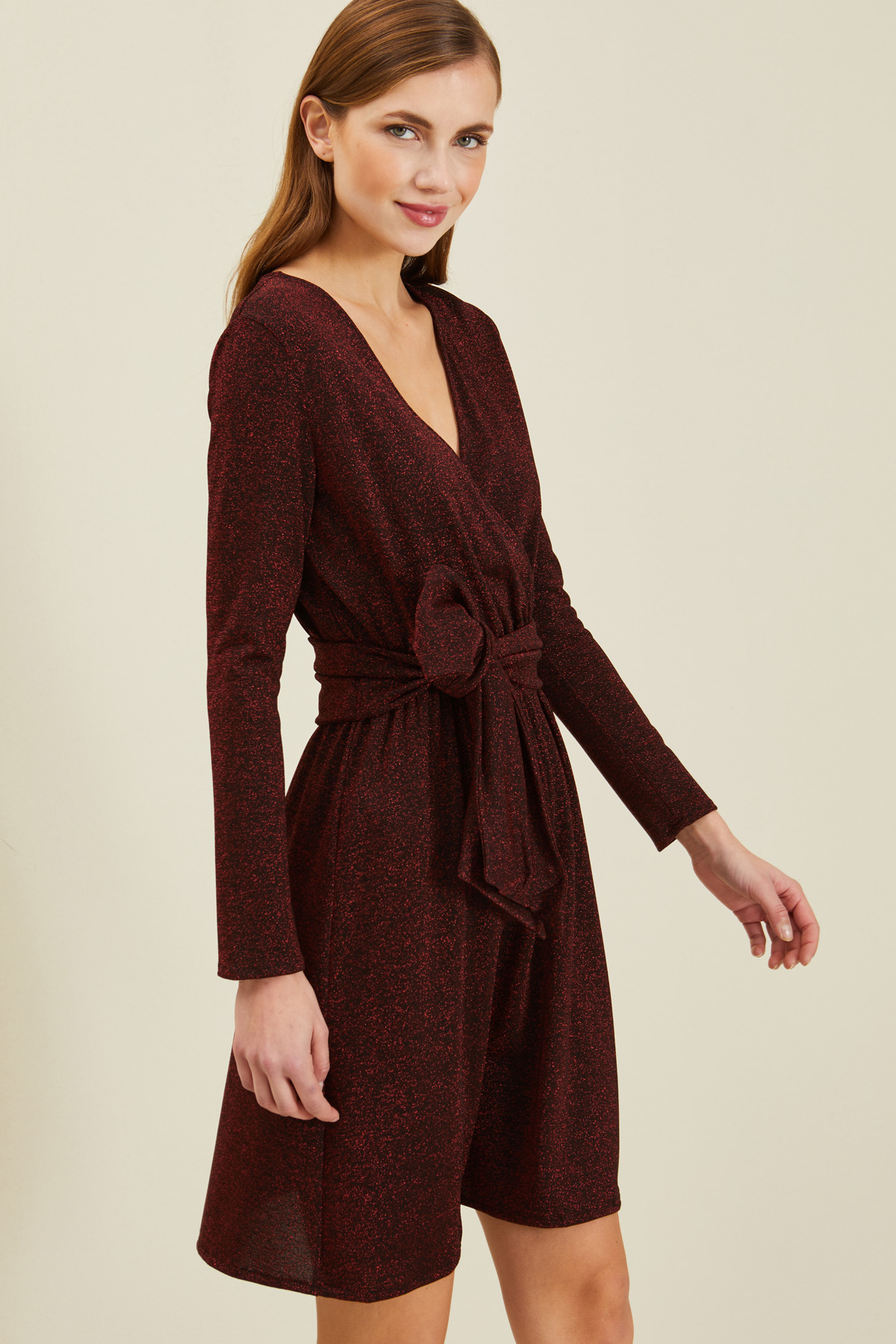 Abito corto dalla linea sfiancata realizzato in jersey lamè di misto viscosa stretch, con scollo a V incrociato, maniche lunghe, inserto elastico e dettaglio di fusciacca cucita al fianco da annodare in vita,