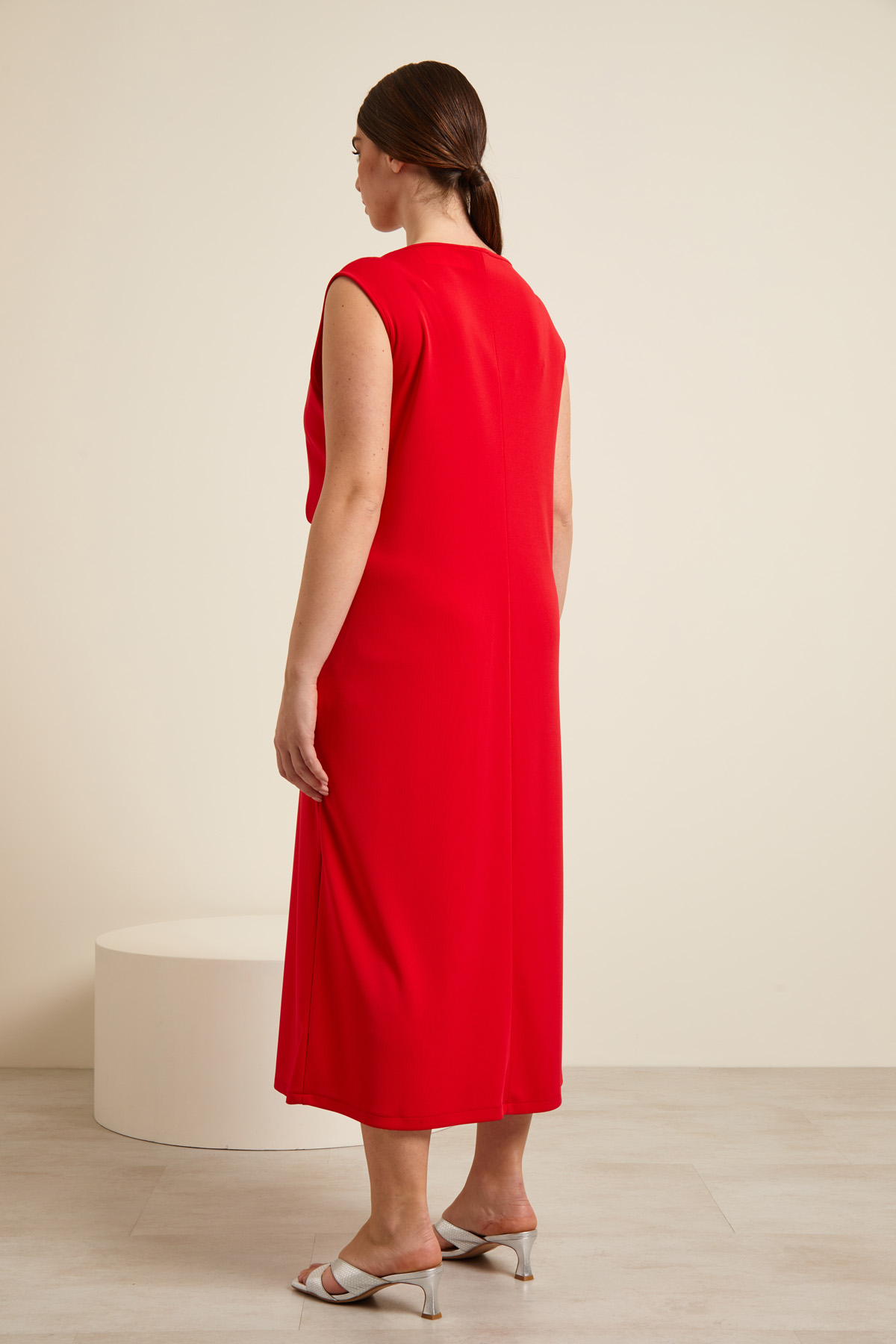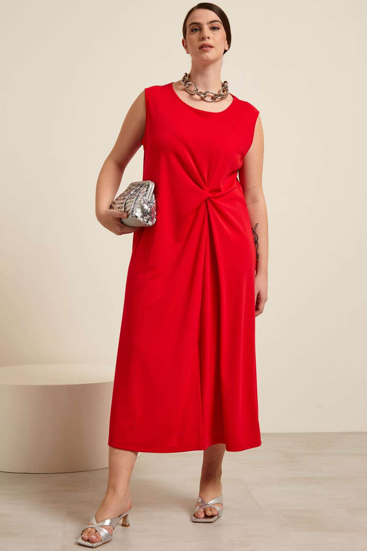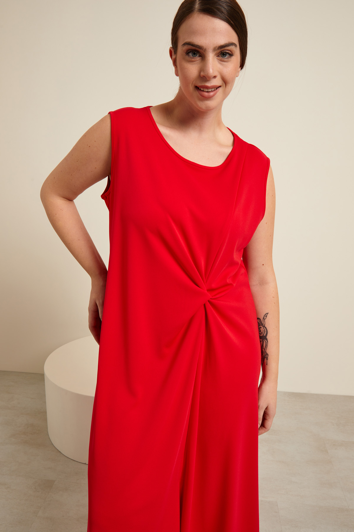 Abito dalla linea scivolata realizzato in jersey tecnico, con motivo annodato sul davanti, scollo rotondo e senza maniche.