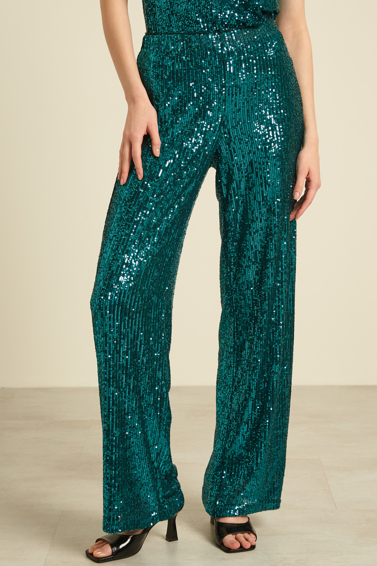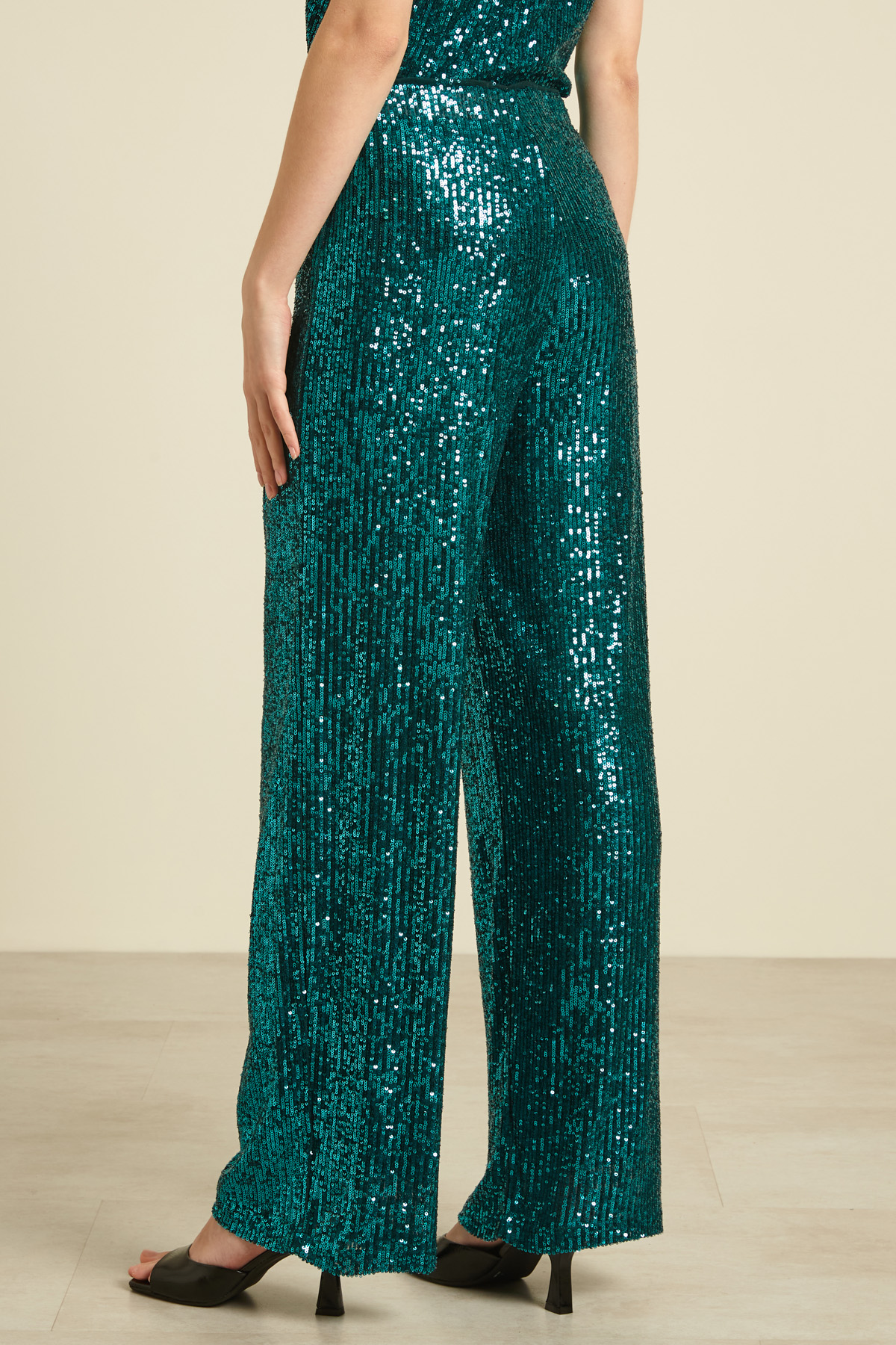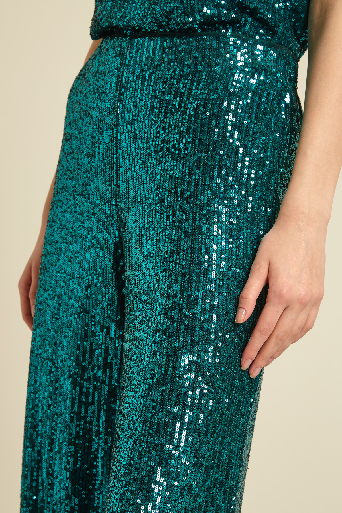 Pantaloni dalla linea fluida realizzati in tulle ricamato con pailettes all-over con elastico in vita. Capo foderato.