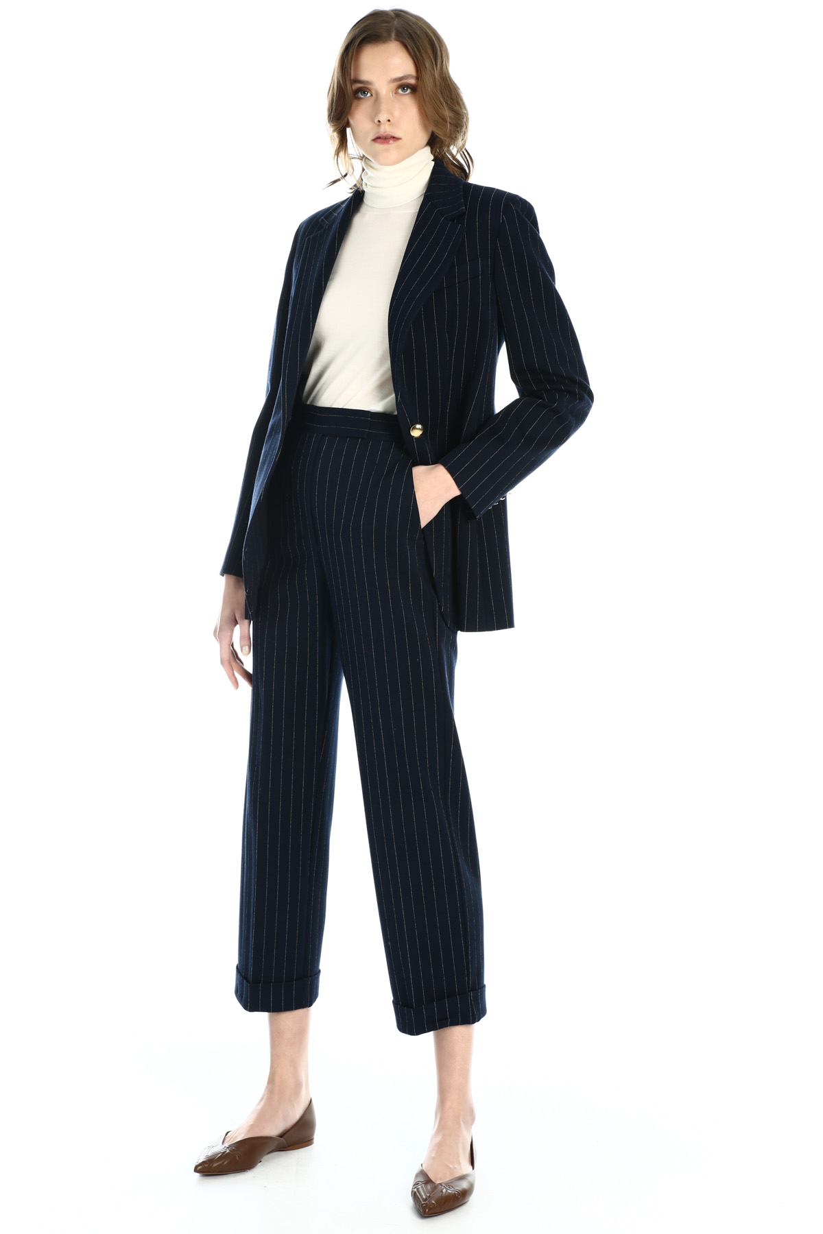 Pantaloni dalla linea dritta realizzati in jersey di misto cotone e viscosa stretch tinto filo, con cintone in vita, tasche laterali alla francese e orlo con risvolto. Allacciatura nascosta tramite zip, bottone e ganci.
