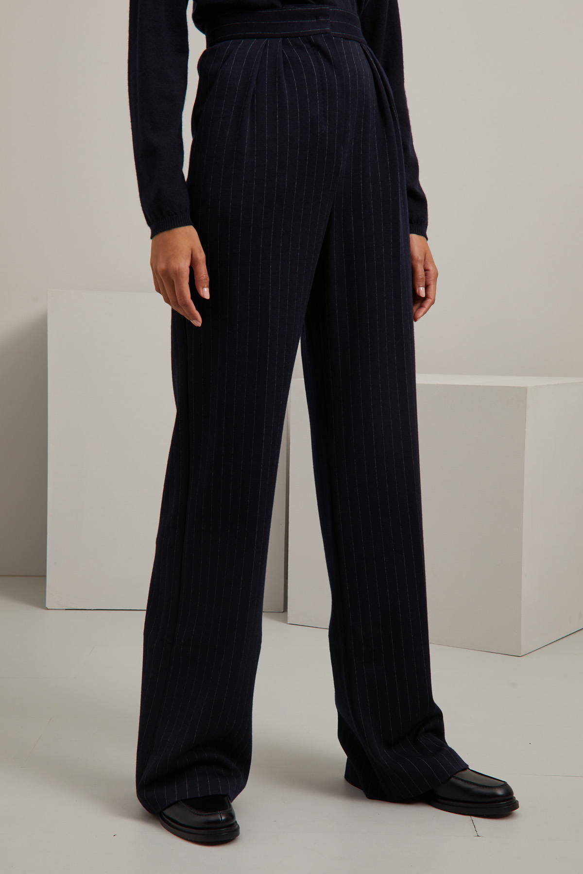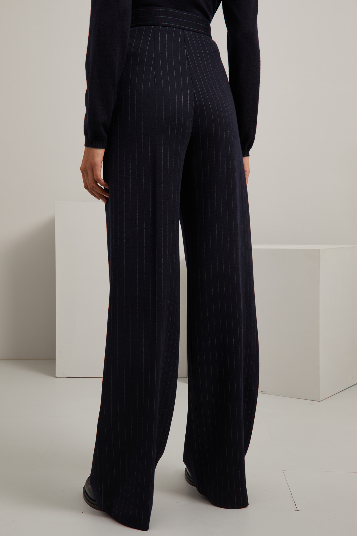 Pantaloni a palazzo realizzati in jersey di lana e viscosa tinto filo, con cintone in vita, tasche alla francese, pences e piega stirata in lunghezza. Allacciatura nascosta tramite zip, bottone e ganci.