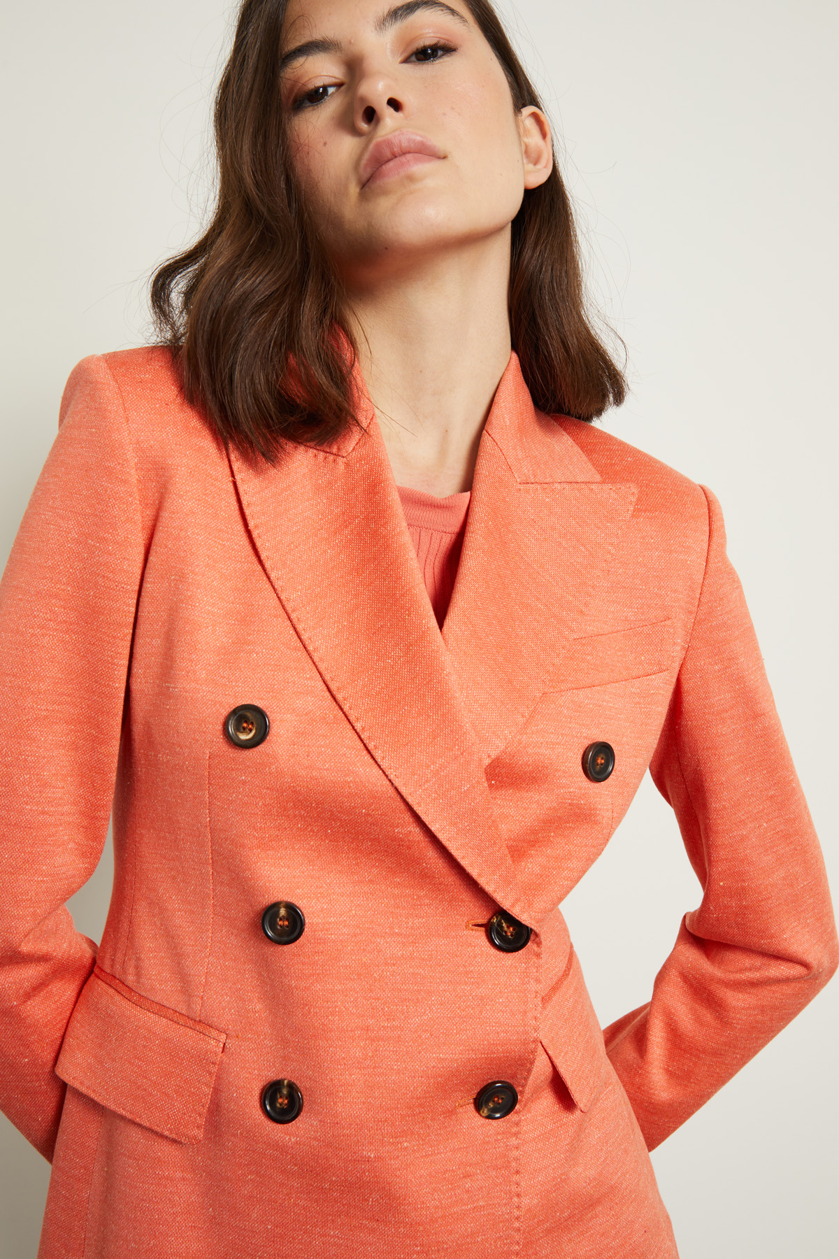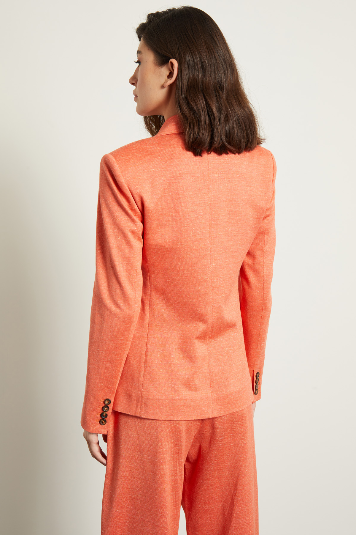 Blazer dalla linea dritta realizzato in jersey di cotone e lino tinto filo effetto denim, con collo a rever, maniche lunghe con bottoni, taschino a filettone obliquo e tasche a doppio filetto con patta sul davanti. Profili rifiniti a puntino e allacciatura doppiopetto tramite bottoni. Semifoderato.