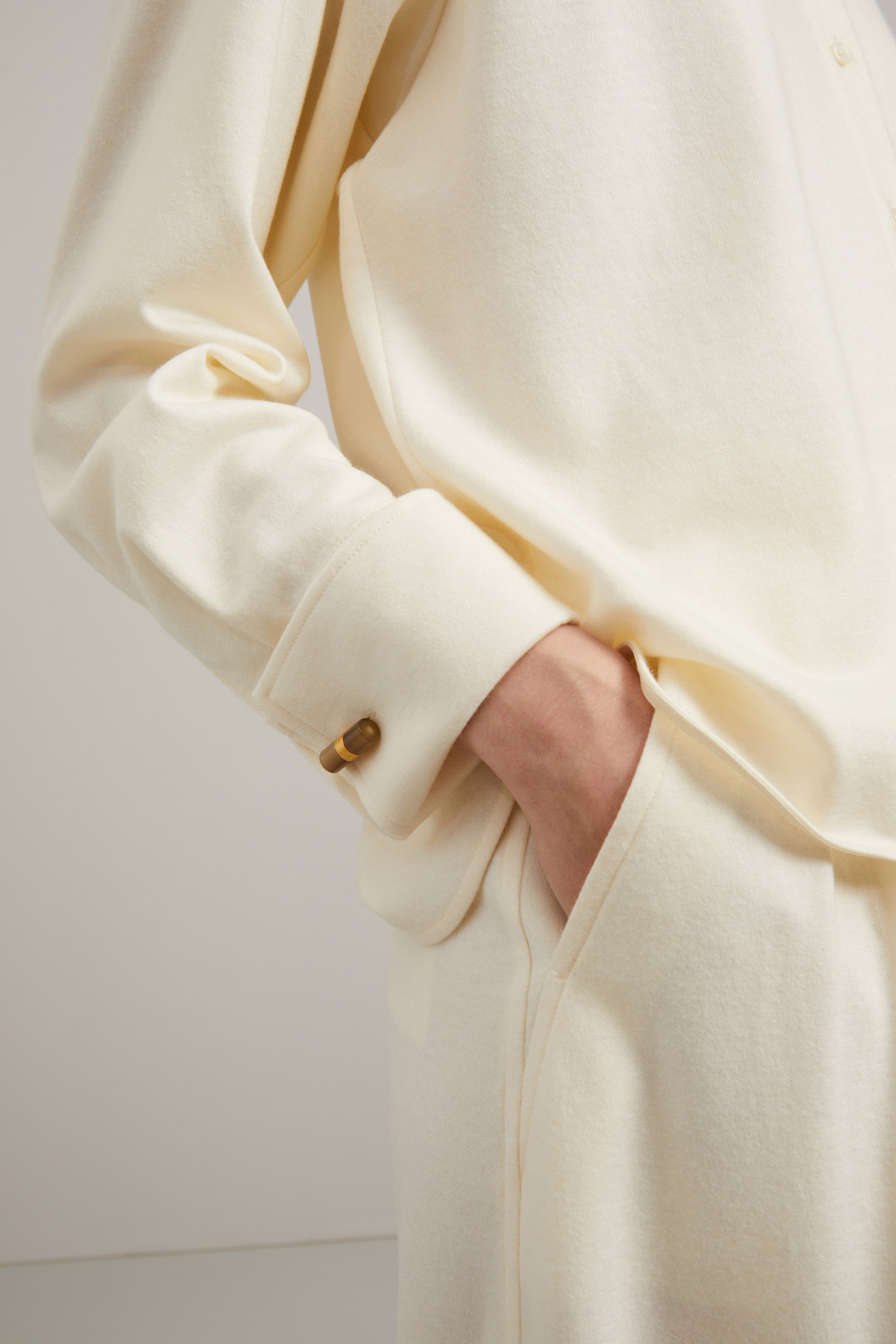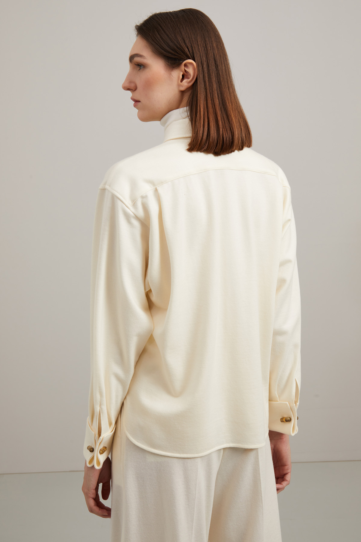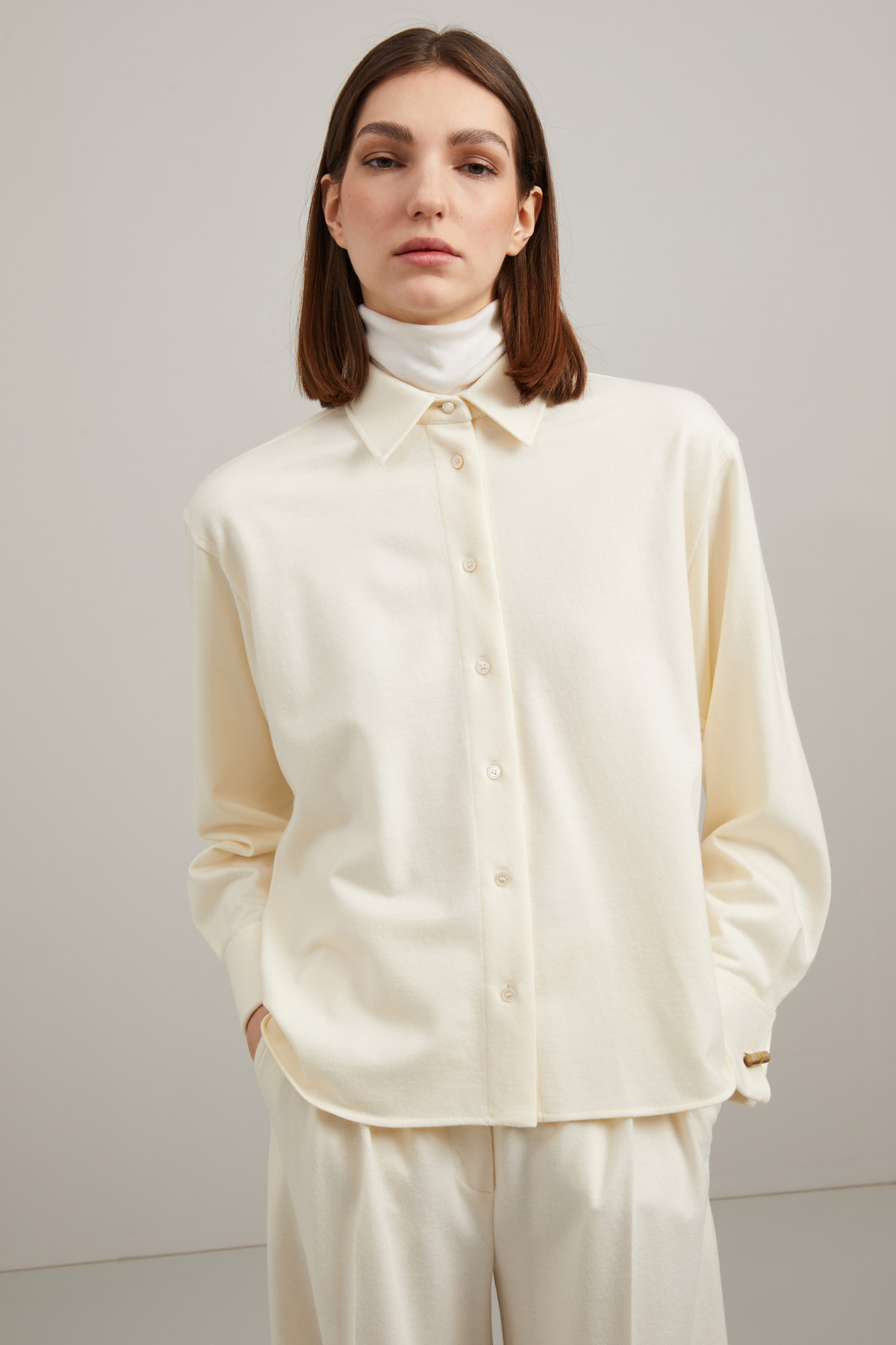 Giacca stile camicia dalla linea dritta realizzata in tessuto di pura lana, con colletto a camicia, maniche lunghe con polsino a gemello e spacchi laterali al fondo. Allacciatura tramite bottoni a vista. Sfoderato.
