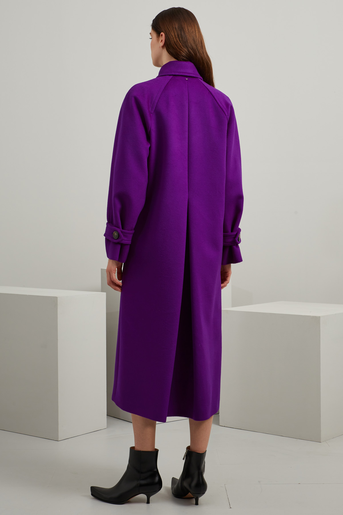 Cappotto stile trench dalla linea dritta realizzato in drap zibellinato di pura lana, con collo a camicia, maniche lunghe raglan con cinturino e bottone al polso, tasche a filettone sul davanti. Allacciatura doppiopetto tramite bottoni a vista e cintura coordinata. Foderato.