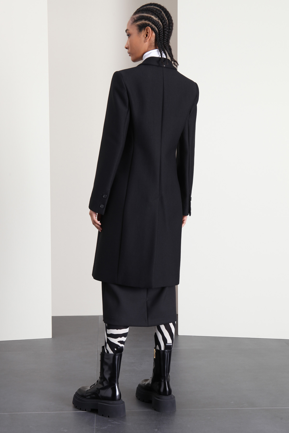 Cappotto dalla linea sfiancata realizzato in tessuto diagonale di misto lana, con collo a rever, maniche lunghe con bottoni al fondo, taschino al petto e a doppio fieltto con patta sul davanti. Ampio spacco sovrapposto centrale nel retro e allacciatura monopetto nascosta tramite bottoni. Foderato.