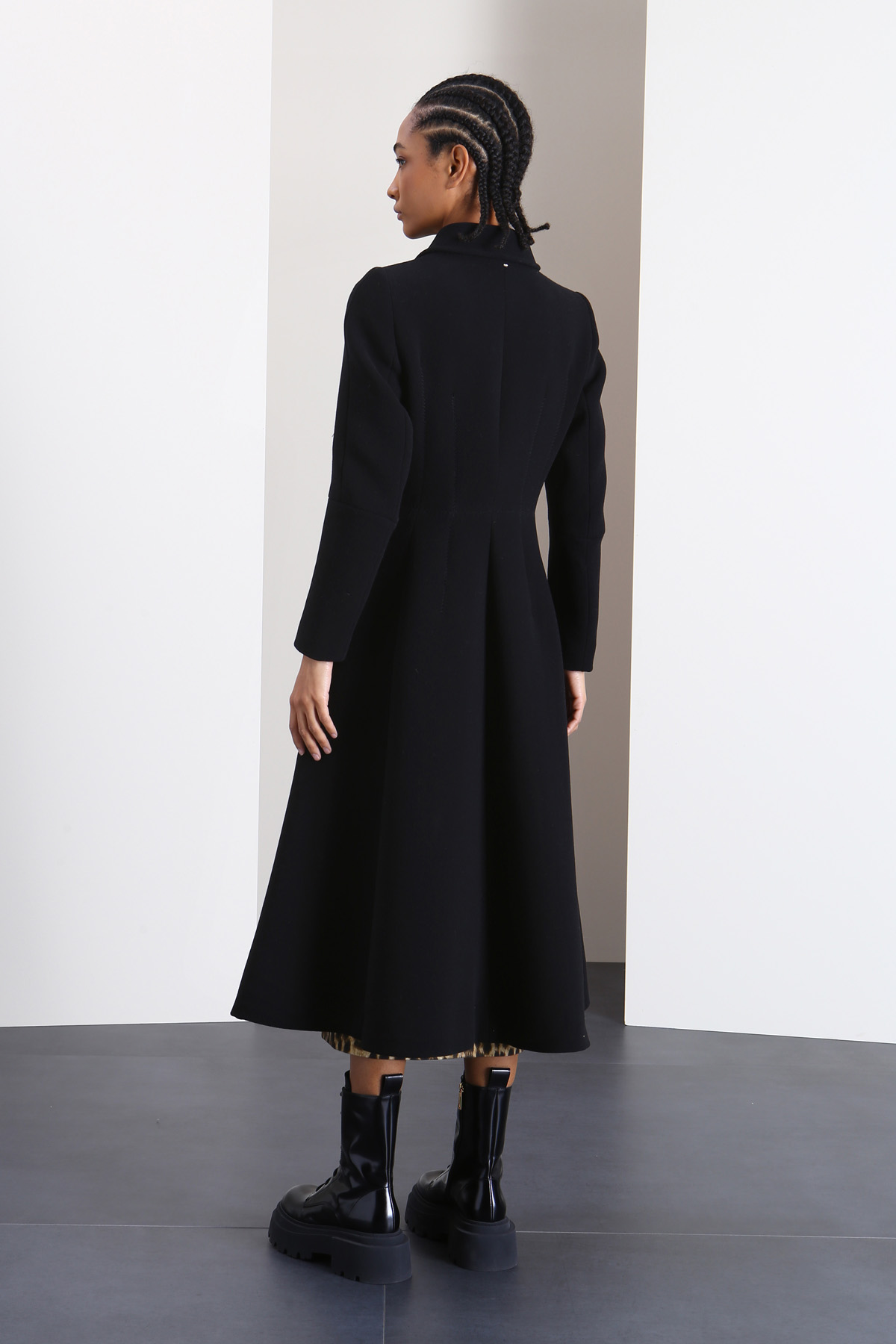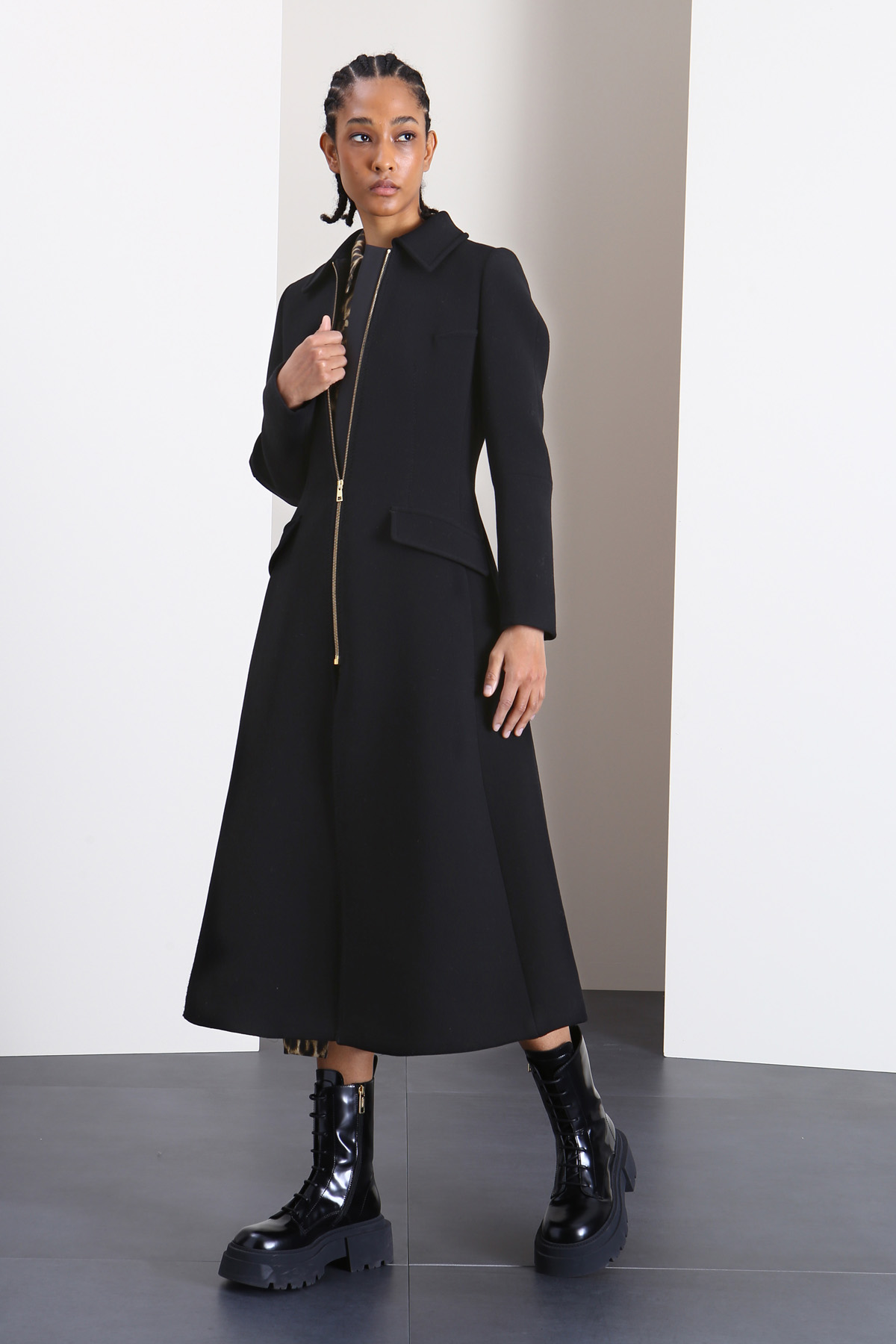 Cappotto dalla linea svasata realizzato in tessuto doppio sablè di misto lana stretch, con colletto a camicia, maniche lunghe, tasche laterali inserite in cucitura con patta e allacciatura tramite zip. Capo foderato.