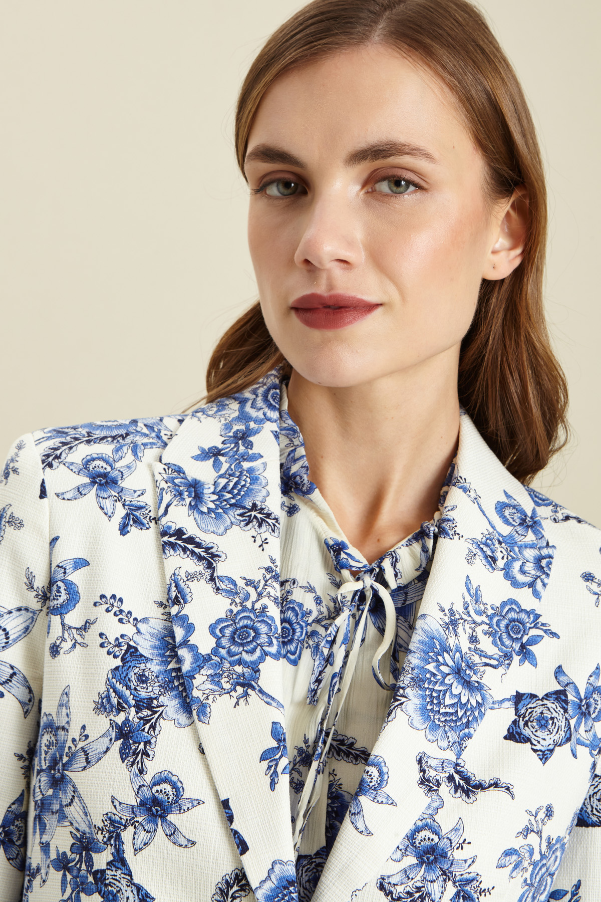 Blazer dalla linea dritta realizzato in stuoia di cotone stretch stampato, con collo a rever, maniche lunghe, tasche a doppio filetto con patta e allacciatura monopetto tramite bottoni. Foderato.