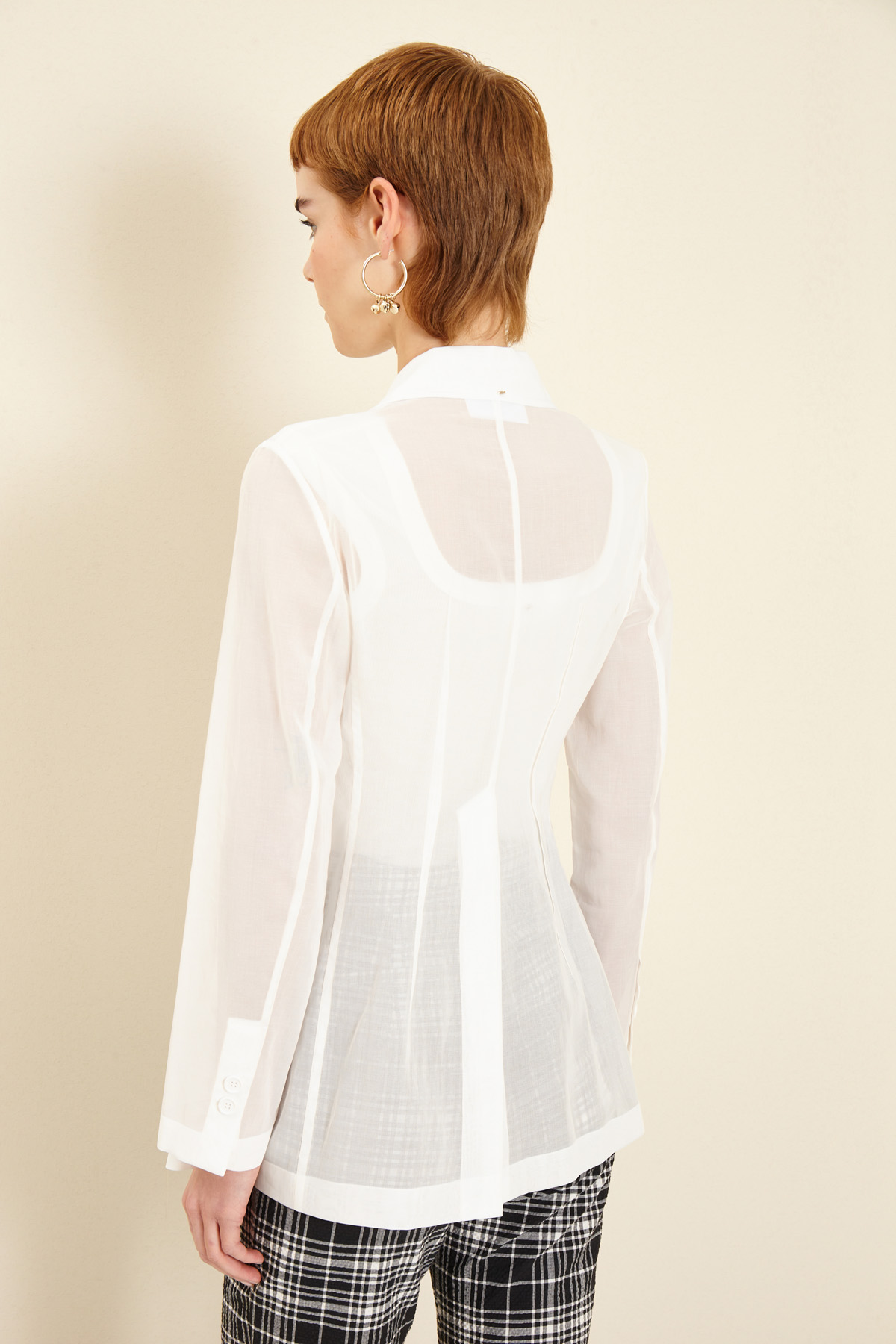 Blazer dalla linea semiaderente realizzato in organza di puro cotone, con collo a rever, maniche lunghe con bottoni, tasche a doppio filetto con patta, spacco nel retro e allacciatura monopetto tramite bottone. Sfoderato.