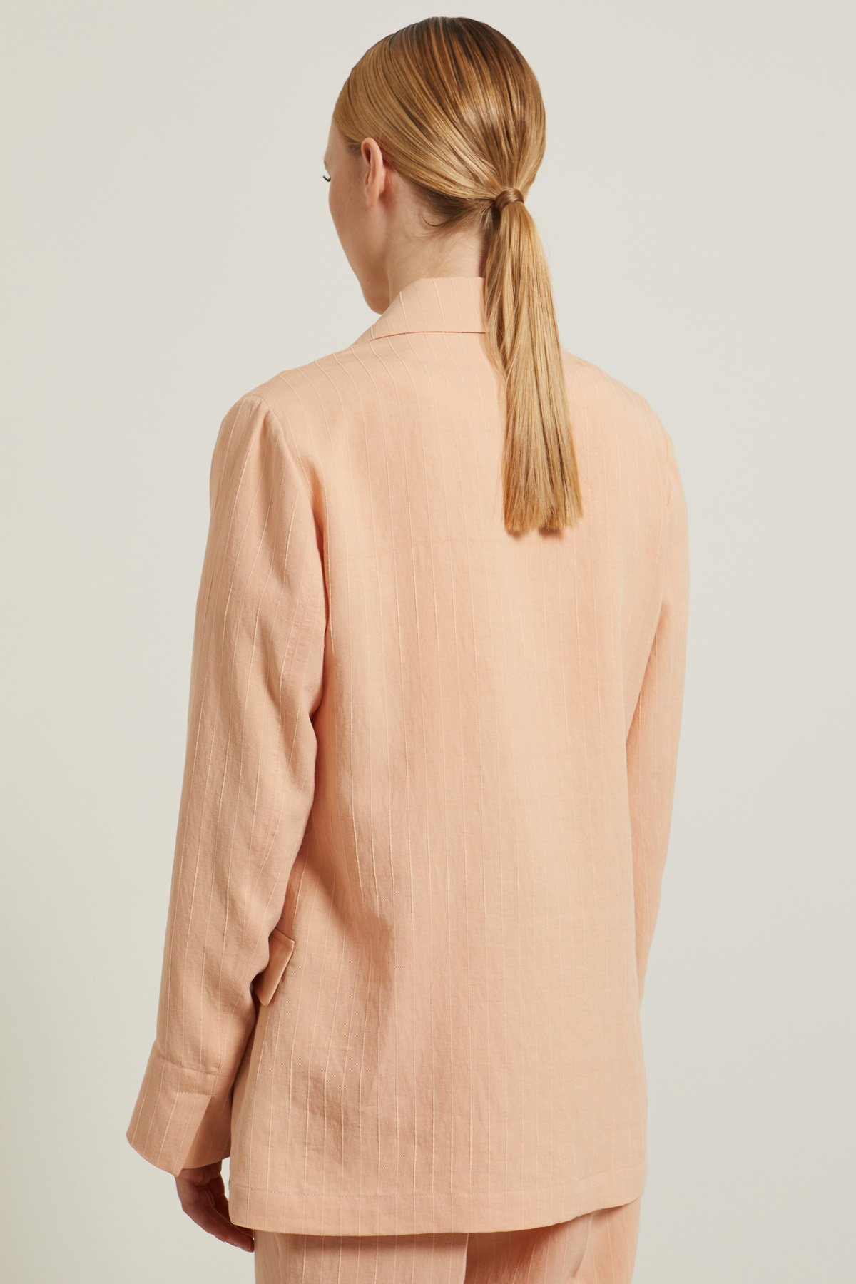 Blazer dalla linea dritta realizzato in tessuto diagonale misto fibra naturale e cotone effetto gessato, con collo rever, maniche lunghe con polsino e spacchetto al fondo, tasche a filetto con patta. Allacciatura doppiopetto tramite bottoni a vista. Sfoderato.