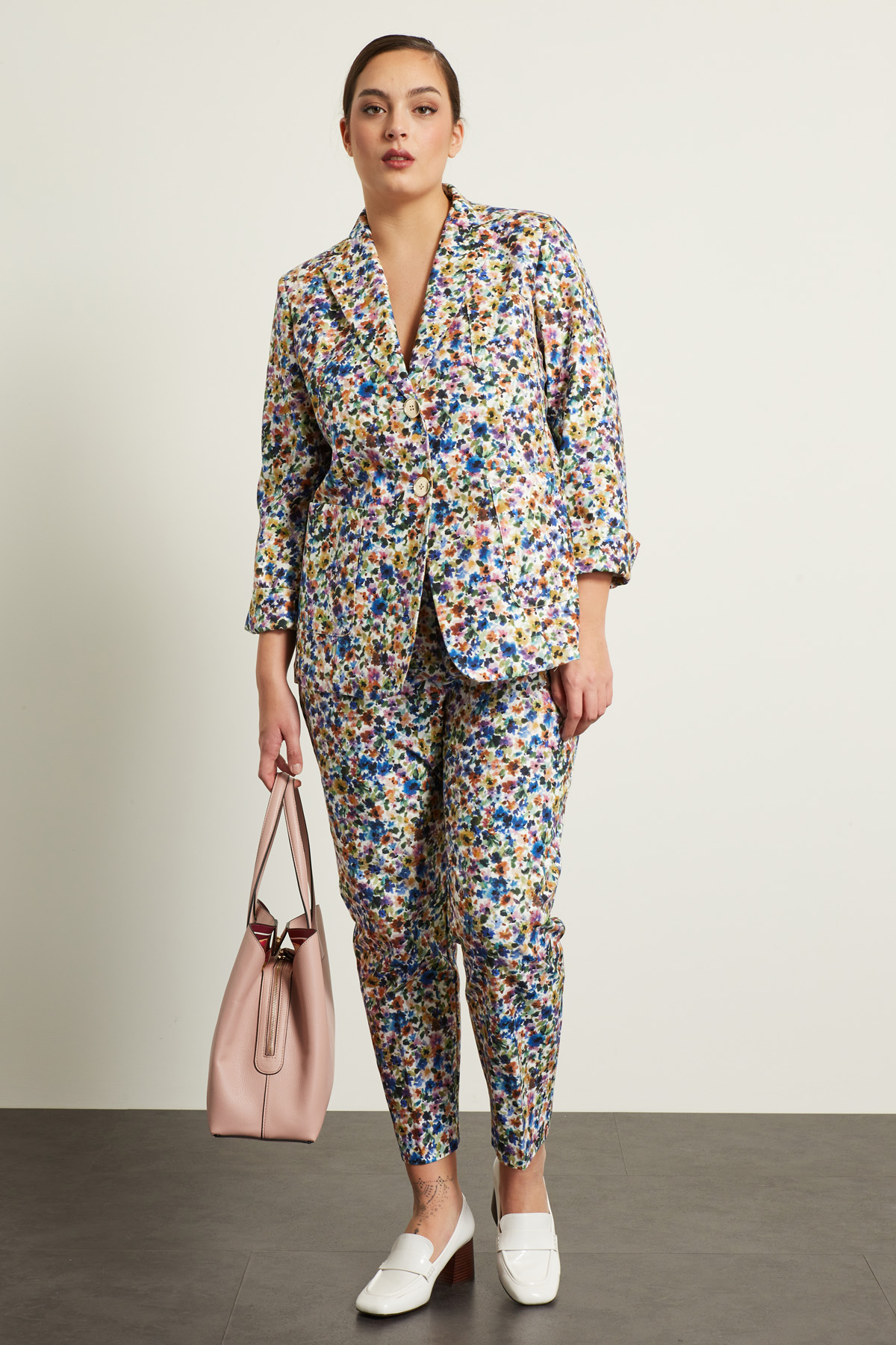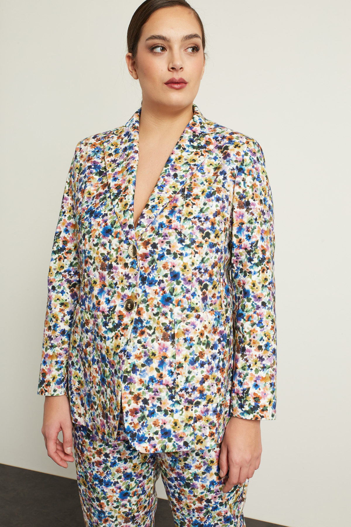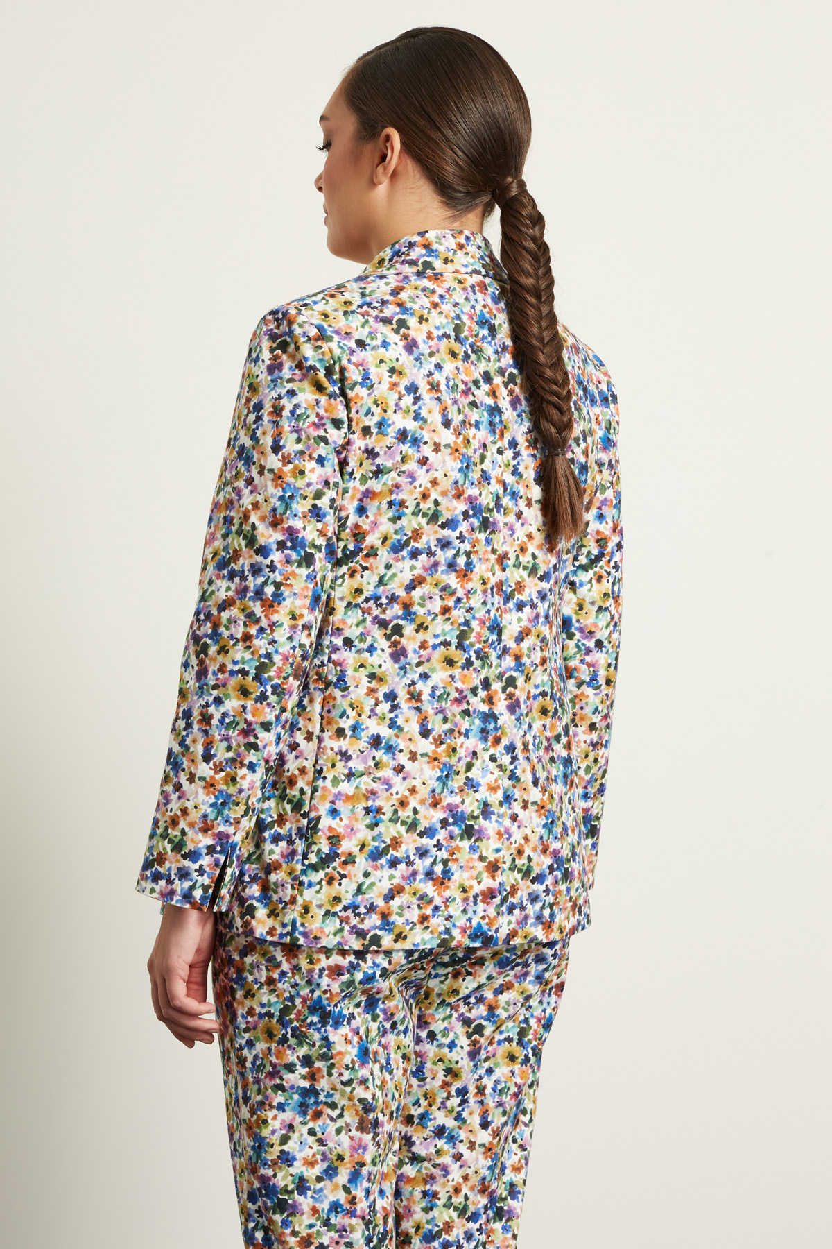 Blazer dalla linea dritta realizzato in drill di cotone stretch stampato, con collo rever, maniche lunghe con spacchetti, tasche applicate sul davanti e spacco nel retro. Allacciatura monopetto tramite bottoni in metallo. Semifoderato.