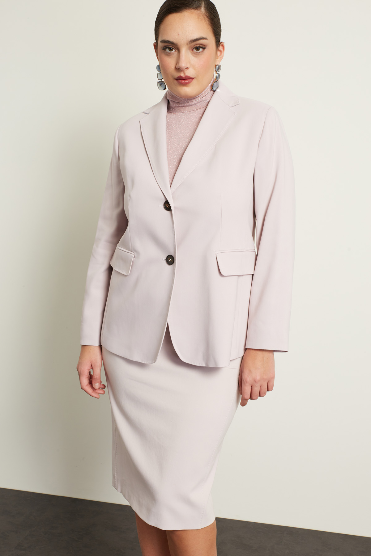Blazer dalla linea dritta realizzato in tela di cotone e viscosa stretch, con colletto rever, maniche lunghe, tasche doppio filetto con patta sul davanti e profili rifiniti a puntino. Allacciatura monopetto tramite bottoni. Foderato.