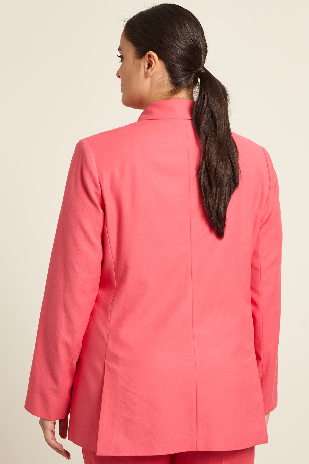 Giacca blazer dalla linea semiaderente in viscosa armaturata con collo rever, maniche lunghe, tasche con doppio filetto e patta, taschino e spacchi sul retro. Chiusura doppiopetto tramite bottoni. Capo semifoderato.