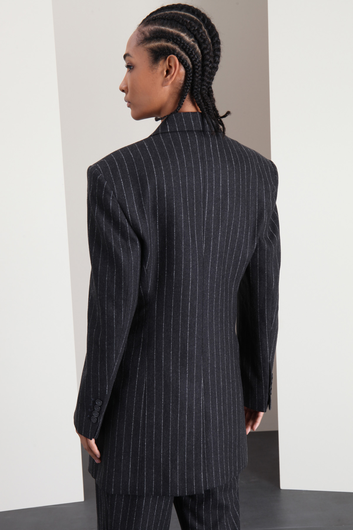 Blazer dalla linea dritta realizzato in flanella gessata di lana stretch tinto filo, con collo a rever, maniche lunghe con bottoni al fondo, taschino a fieltto al petto e a doppio filetto sui fianchi. Spacco centrale nel retro e allacciatura monopetto tramite bottoni. Foderato.