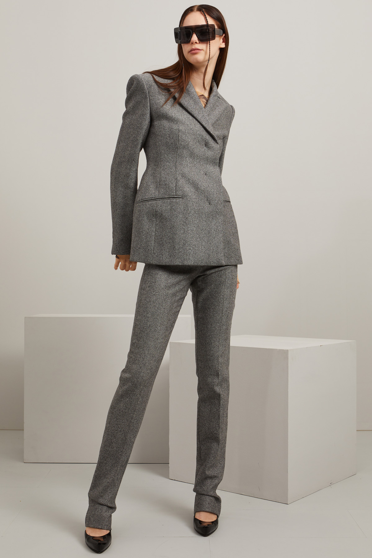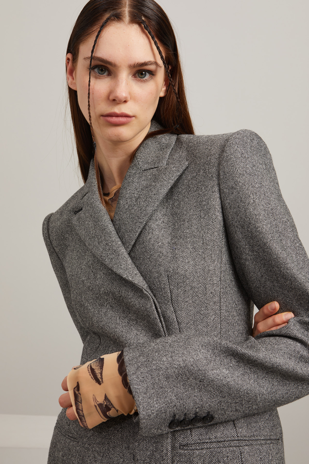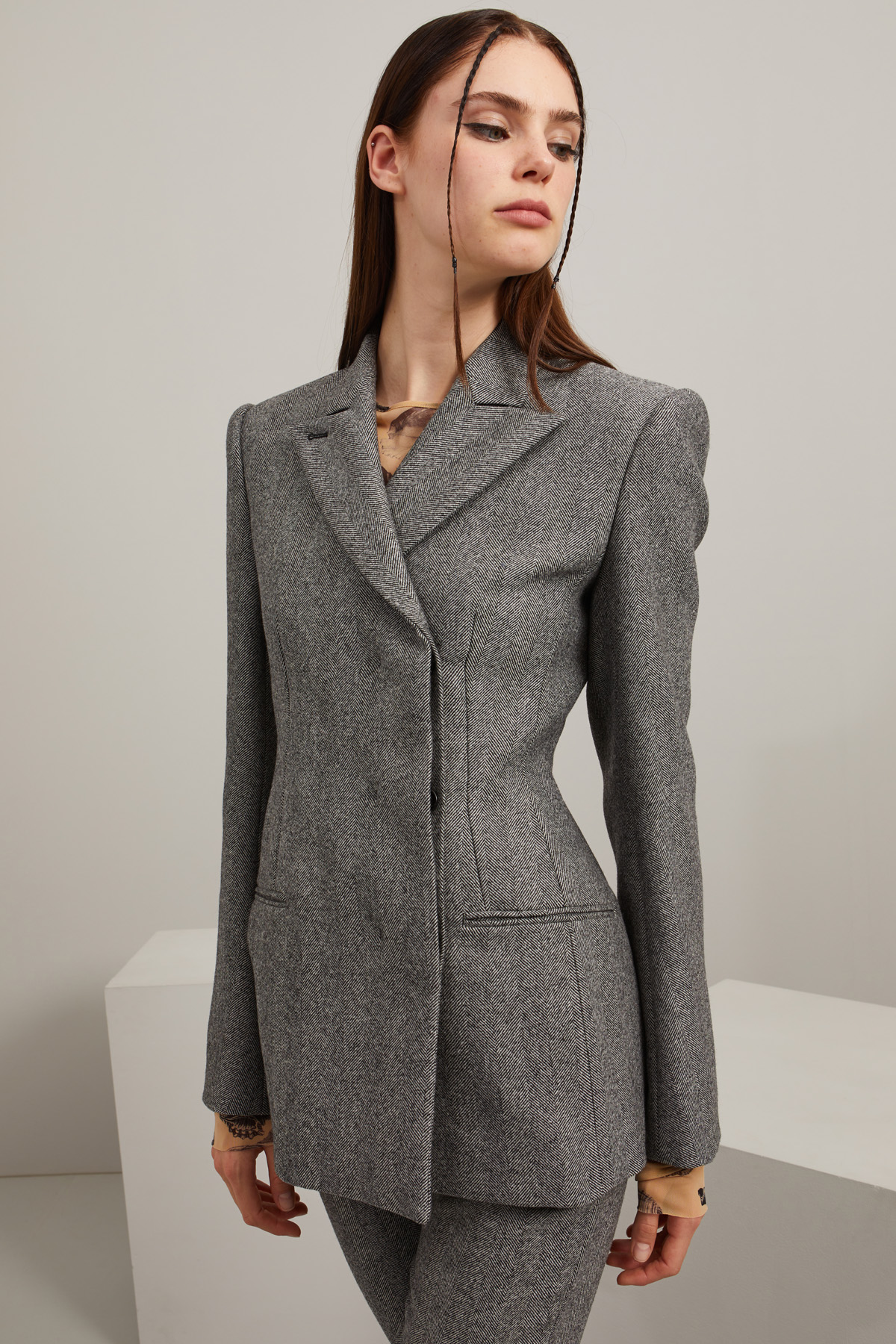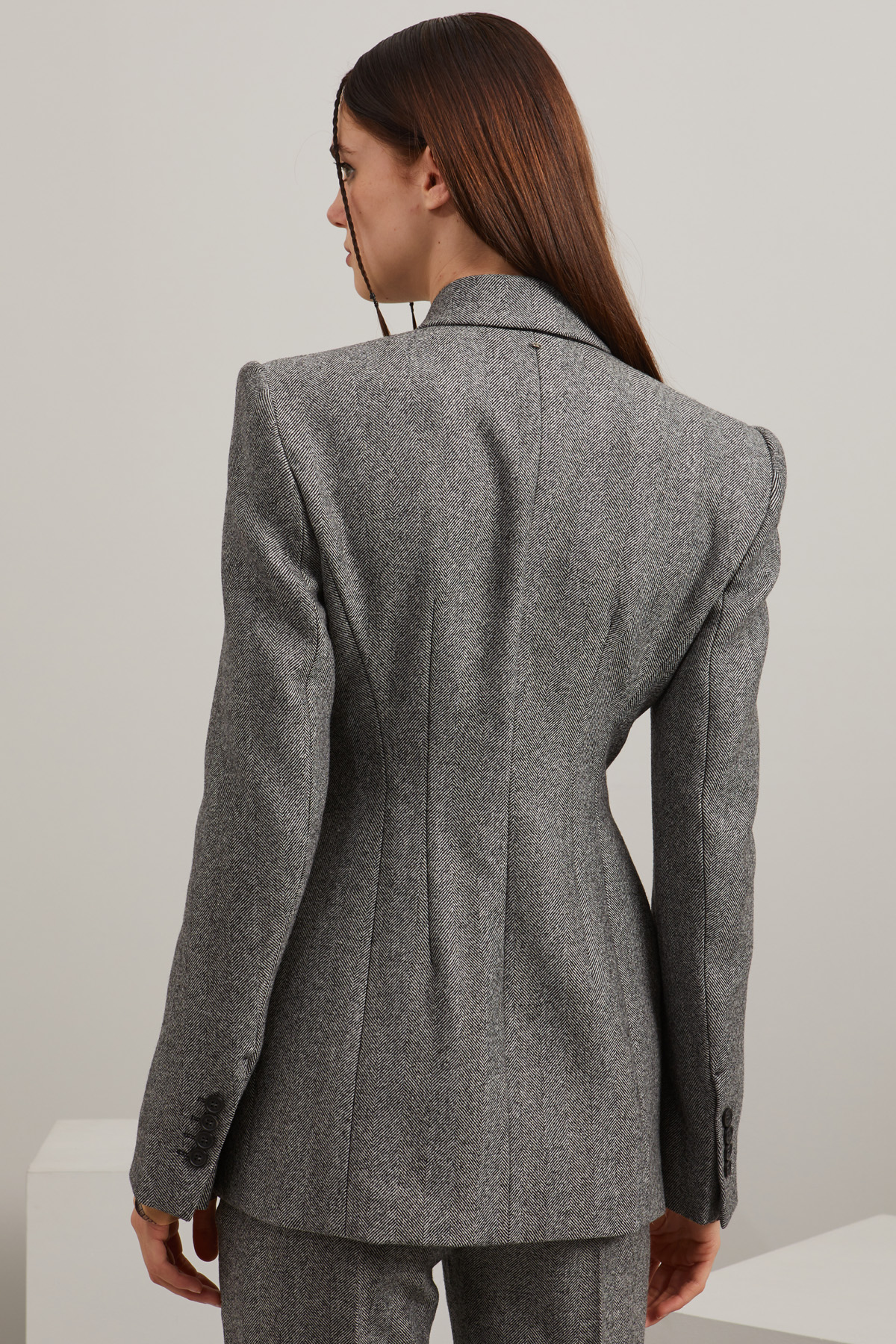 Blazer dalla linea sfiancata realizzato in tessuto a lisca di pesce di pura lana, con collo rever, spalle rigide, maniche lunghe con spacchetto e bottoni, tasche doppio filetto. Allacciatura doppiopetto tramite bottoni. Capo foderato.